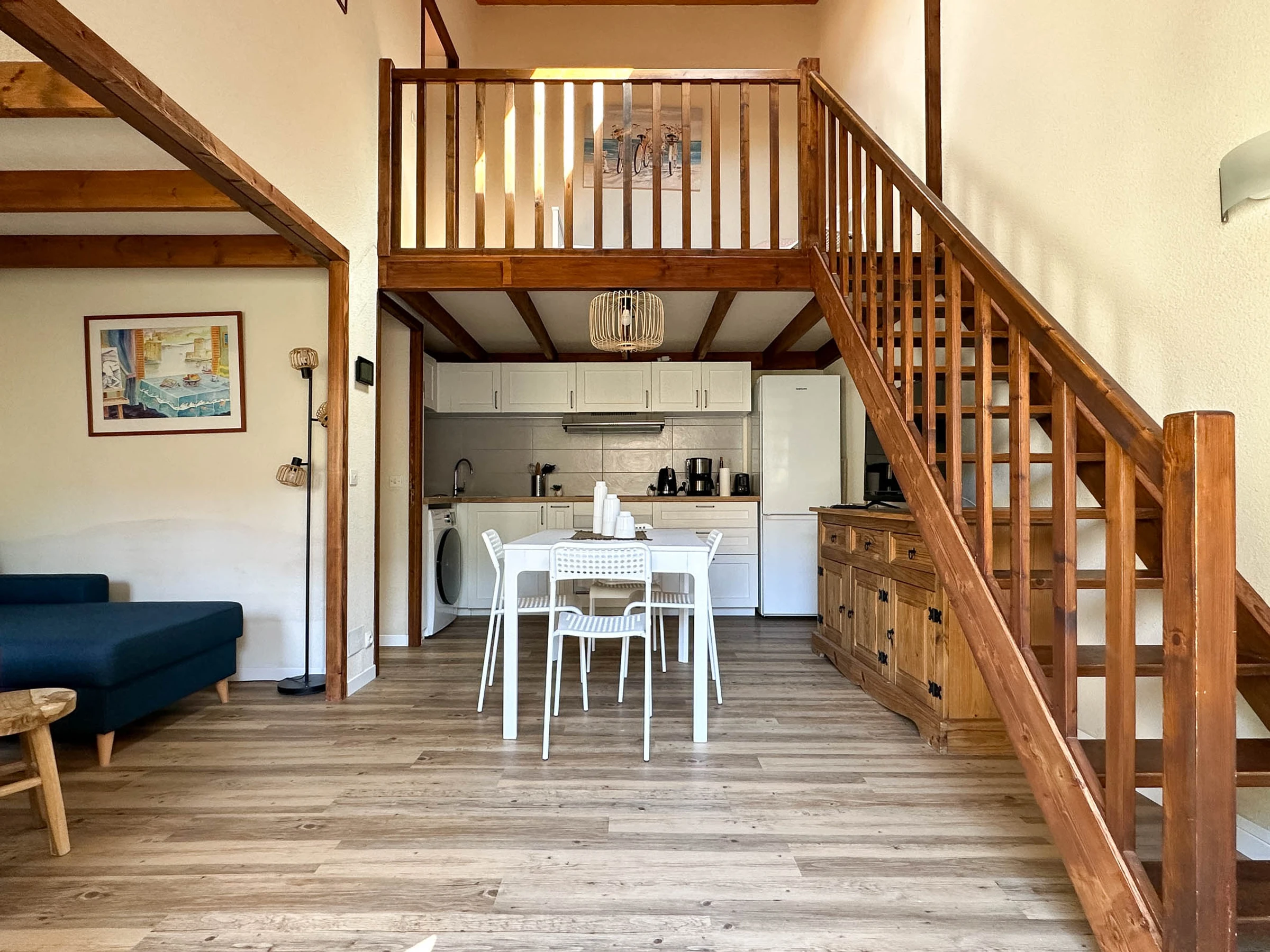 A unos 1000 m del mar y a 400 m de los comercios - Résidence les Maisons de l'Océan - Casa adosada tipo T2 bis de dos plantas con altillo, con capacidad para 4 personas - Superficie habitable de aproximadamente 39 m², salón completamente reformado en 2023, bonita y actual decoración: