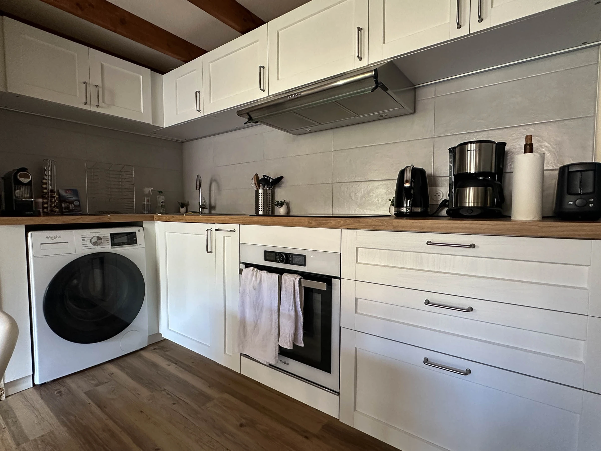- Salón con salón: sofá convertible, mesa de centro y TV y cocina nueva (2023) amueblada y equipada con: placa de inducción, frigorífico/congelador, horno eléctrico, lavadora, microondas, cafetera Nespresso, grill Pan que se abre a la terraza pavimentada. , con toldo orientado al oeste - Cuarto de baño con WC