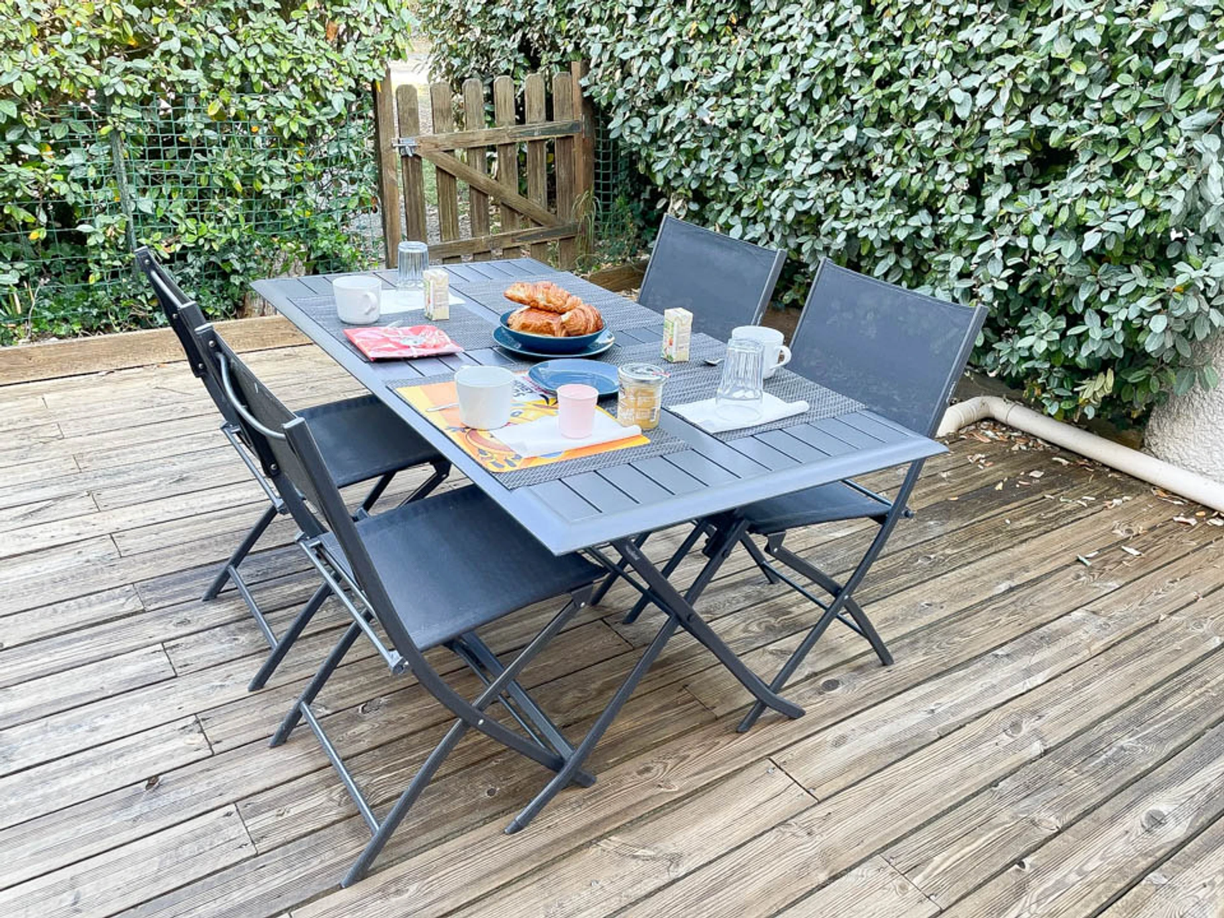 Terraza cerrada por cancela con mesa y sillas, tumbonas y tendedero.