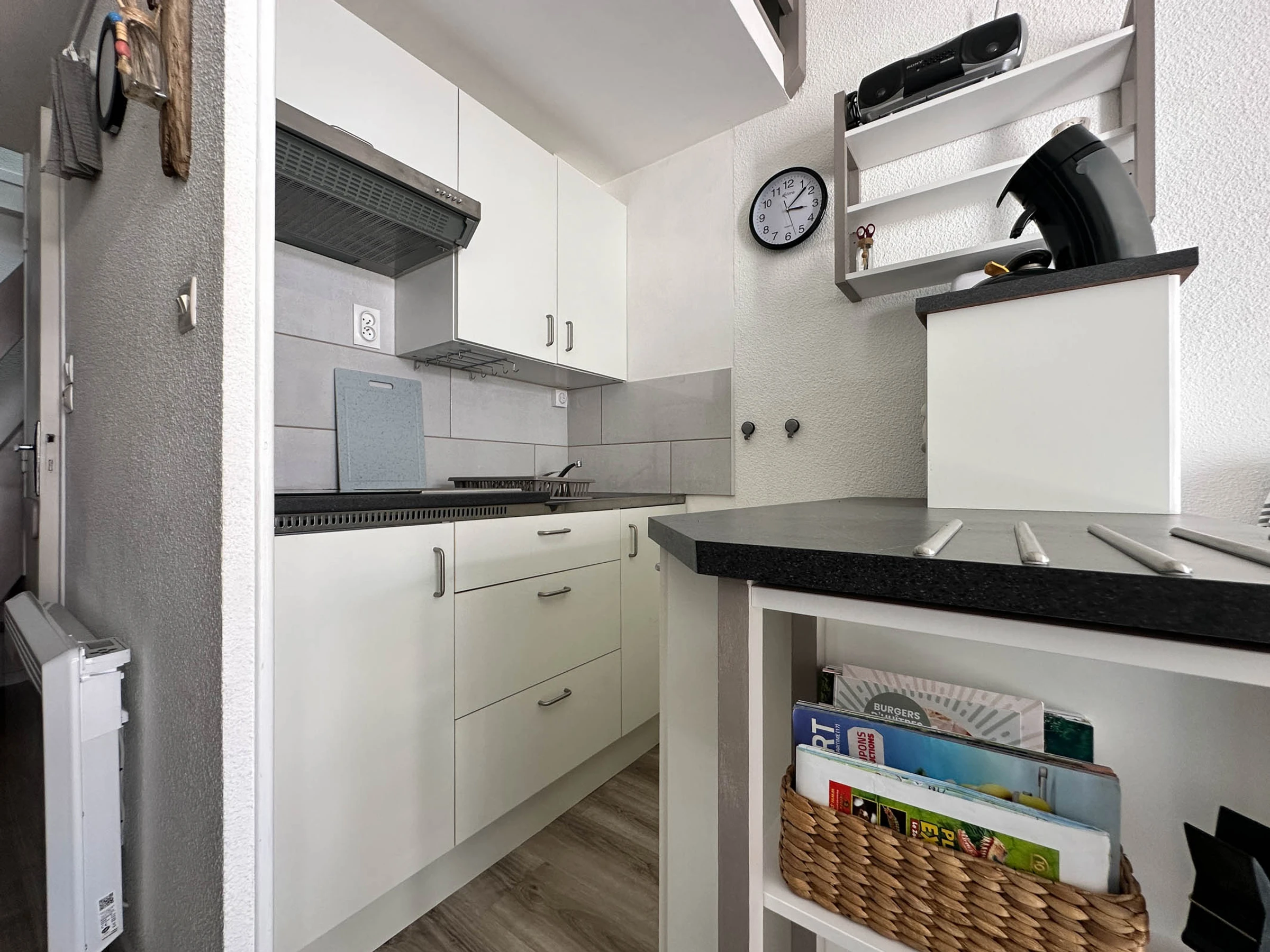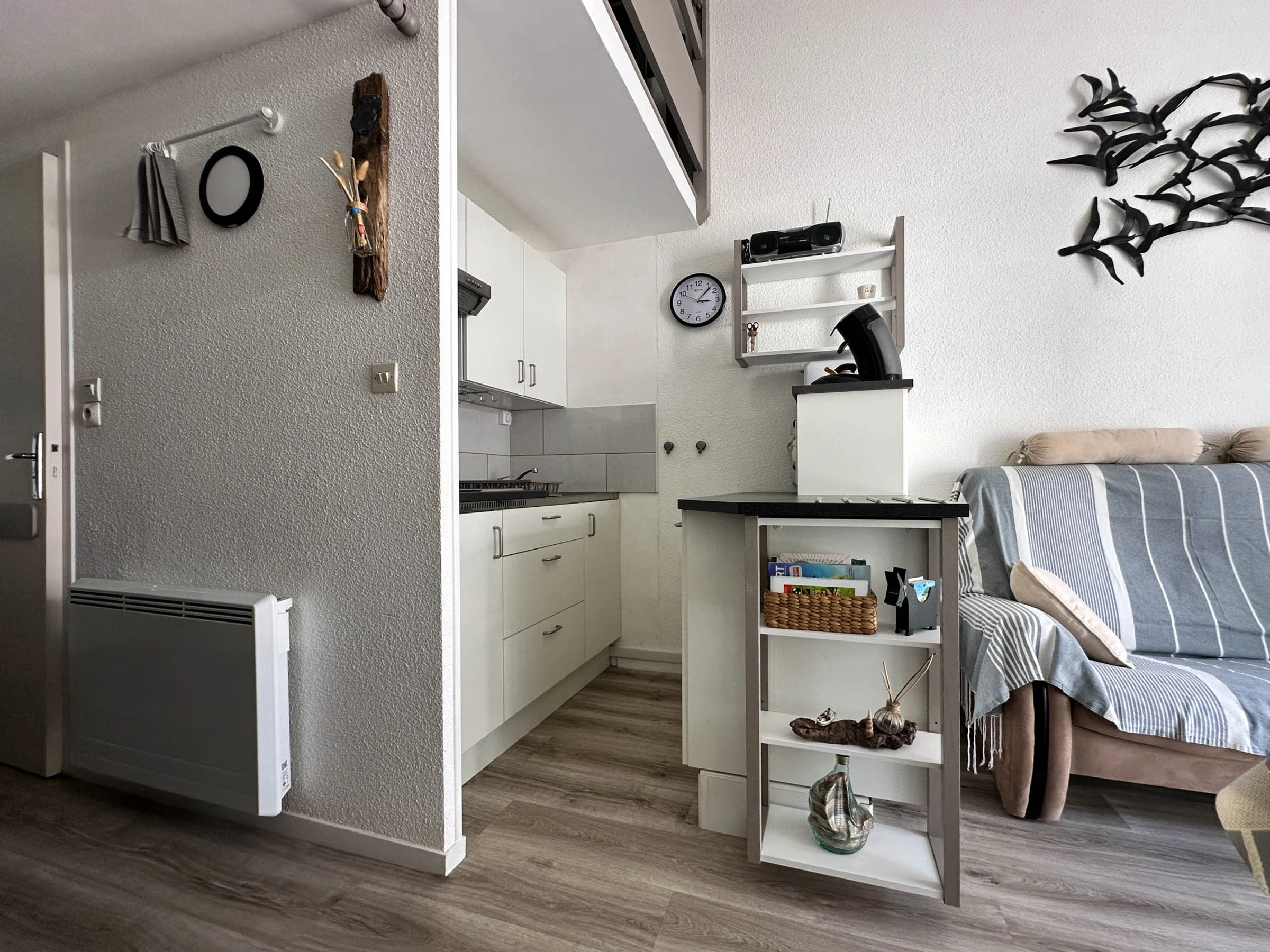 Salón con sofá y TV - Cocina americana equipada con dos placas eléctricas, frigorífico, congelador, microondas, cafetera Senseo, campana extractora y minihorno
