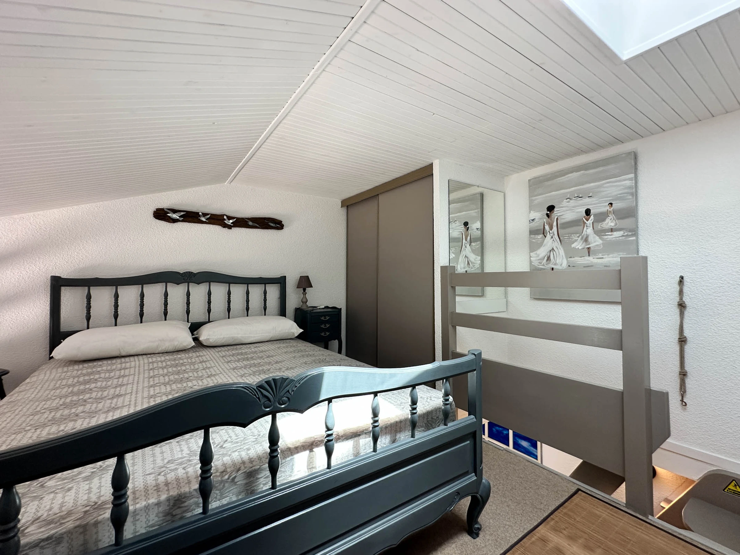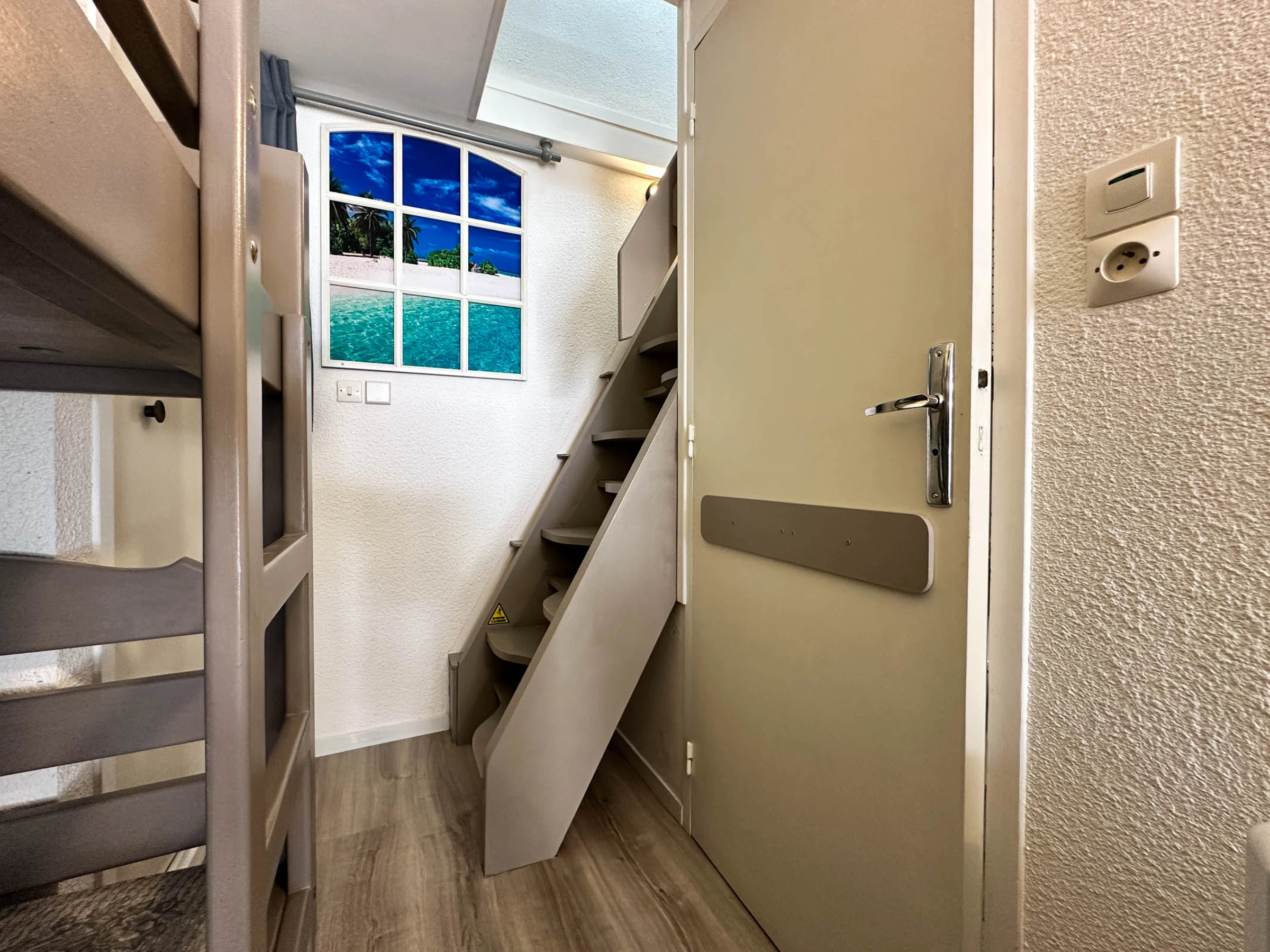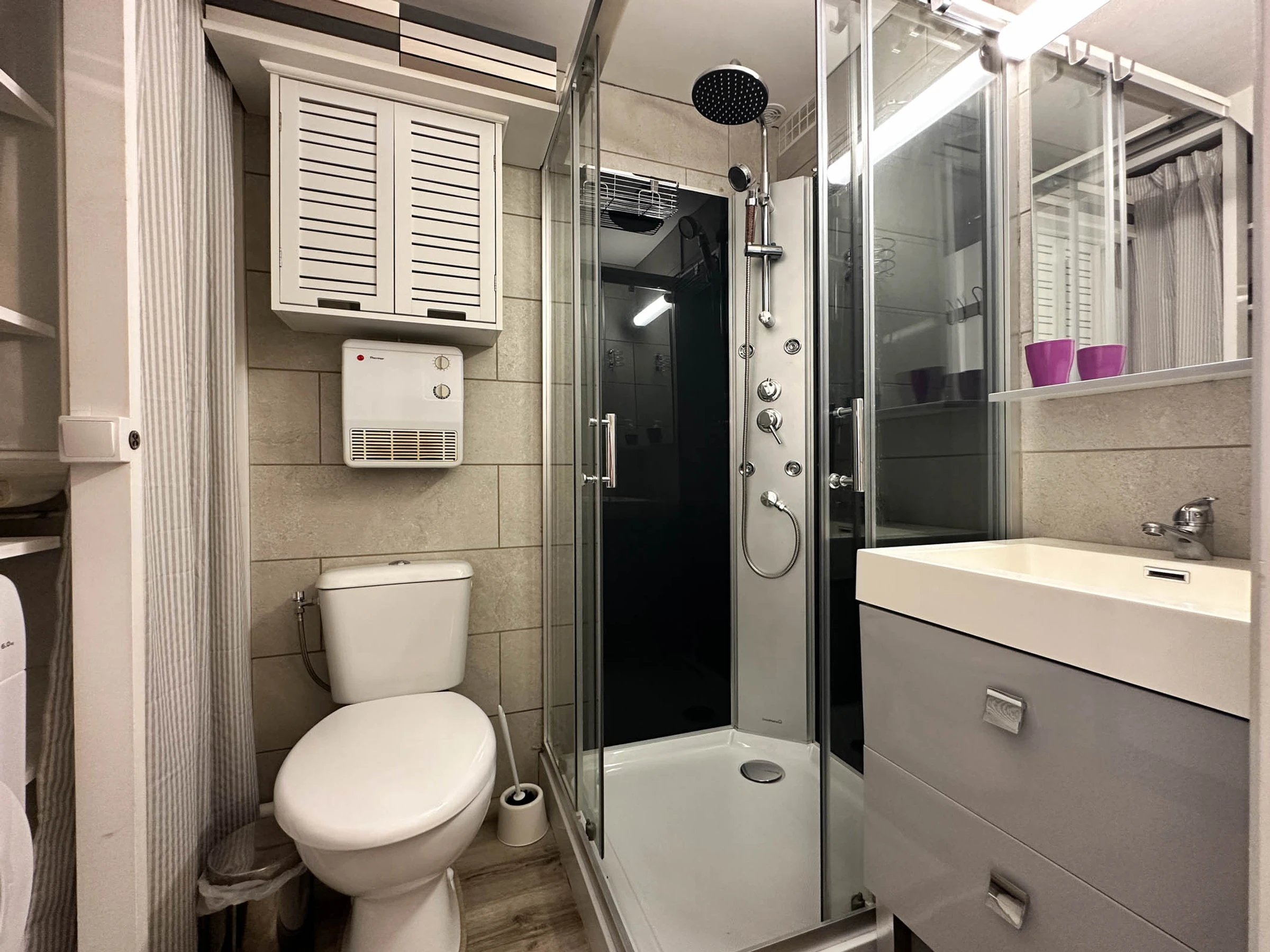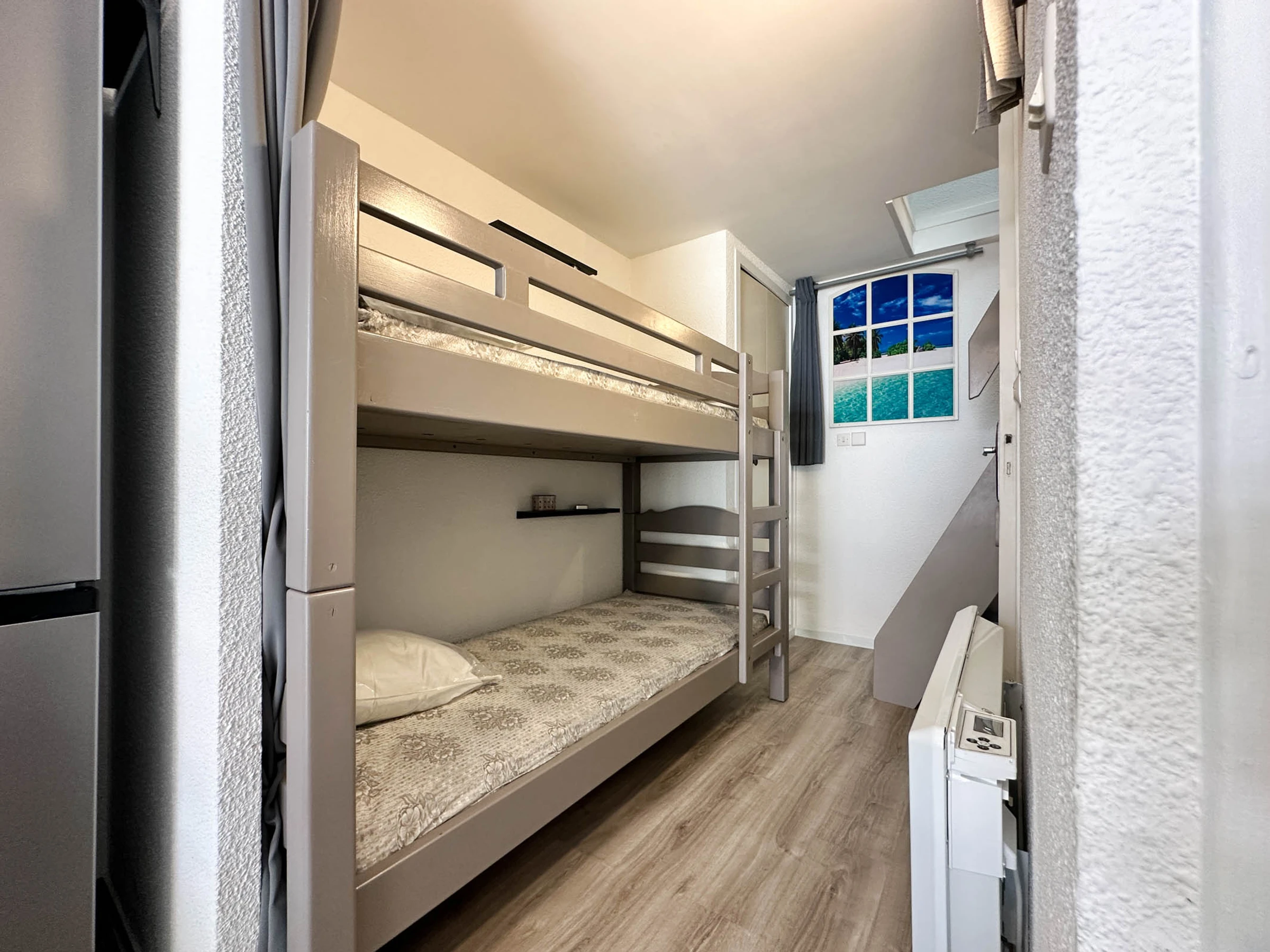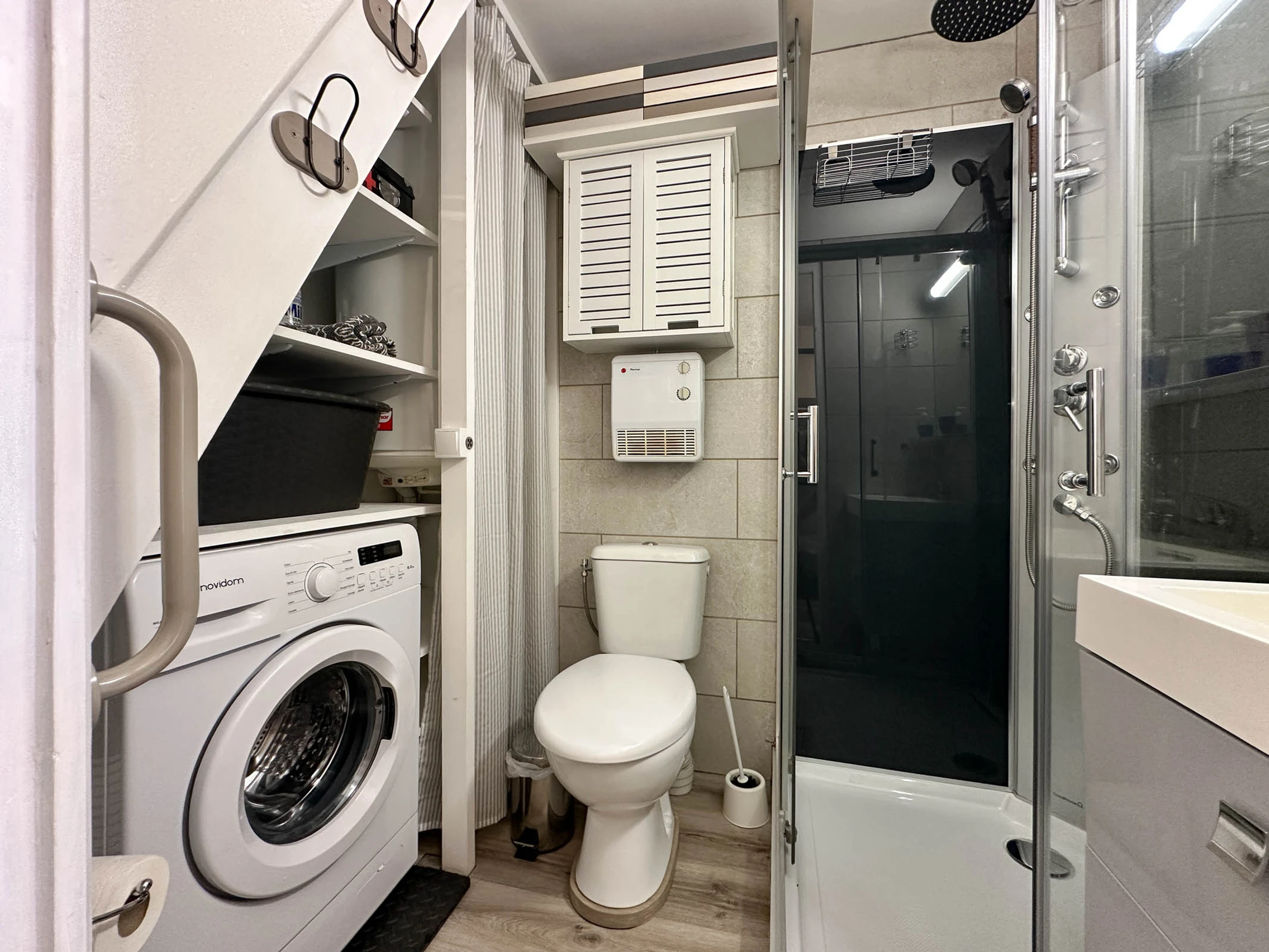 Zona de relax con dos literas de 90 cm y armario - Cuarto de ducha con WC y lavadora