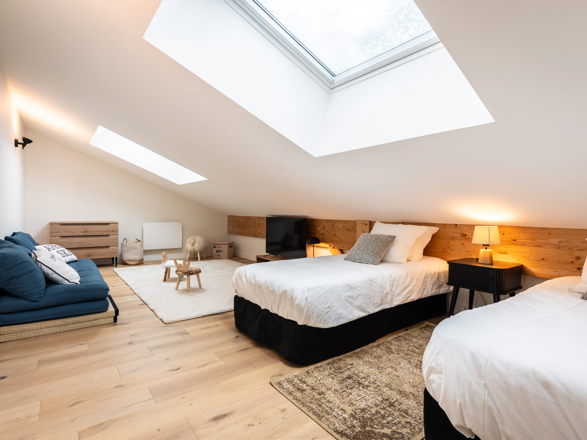 Finalmente, en la segunda planta, disfrutará de un altillo y un dormitorio con dos camas individuales, sofá y TV.