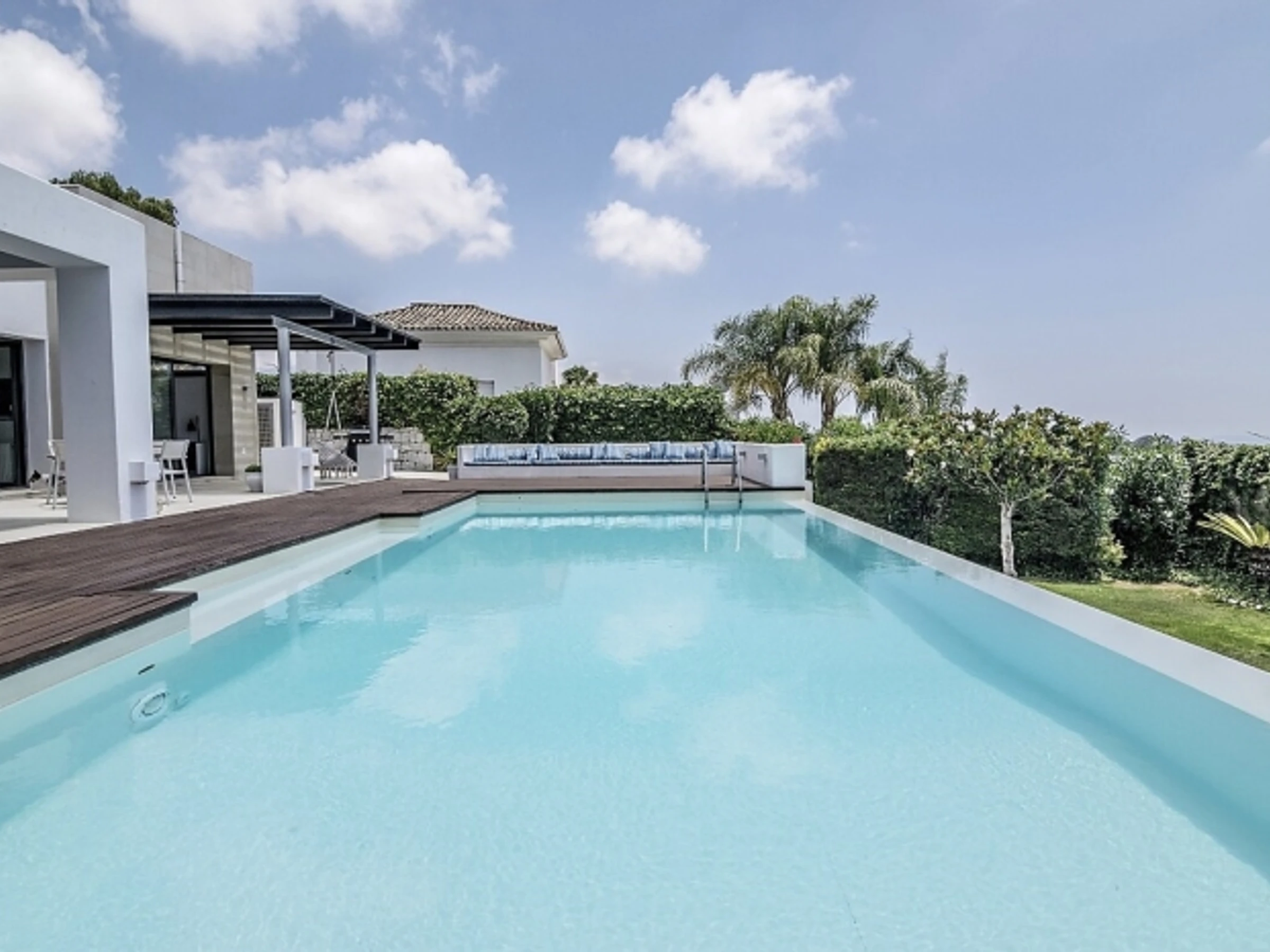 Set within a private gated estate, this architectural gem offers a sophisticated retreat for up to 12 guests. The heart of the home is a sprawling, light-filled lounge and dining area that flows seamlessly through floor-to-ceiling glass doors onto expansive terraces. Outside, the infinity pool serves as a focal point, appearing to merge with the horizon and offering some of the most breathtaking sea views on the Costa del Sol. H I G H L I G H T SInfinity Pool & Sun Deck: A tranquil oasis with uninhibited panoramic views.