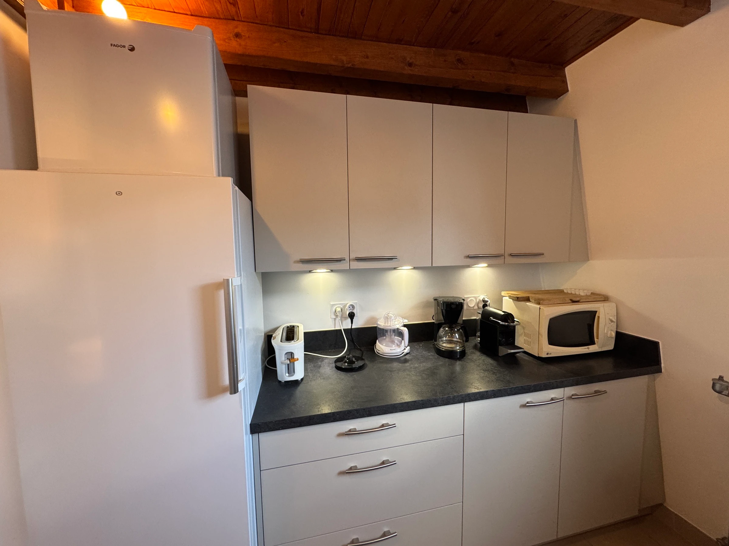 - Una cocina totalmente equipada (lavavajillas, frigorífico con congelador pequeño, placa de inducción, horno, microondas)