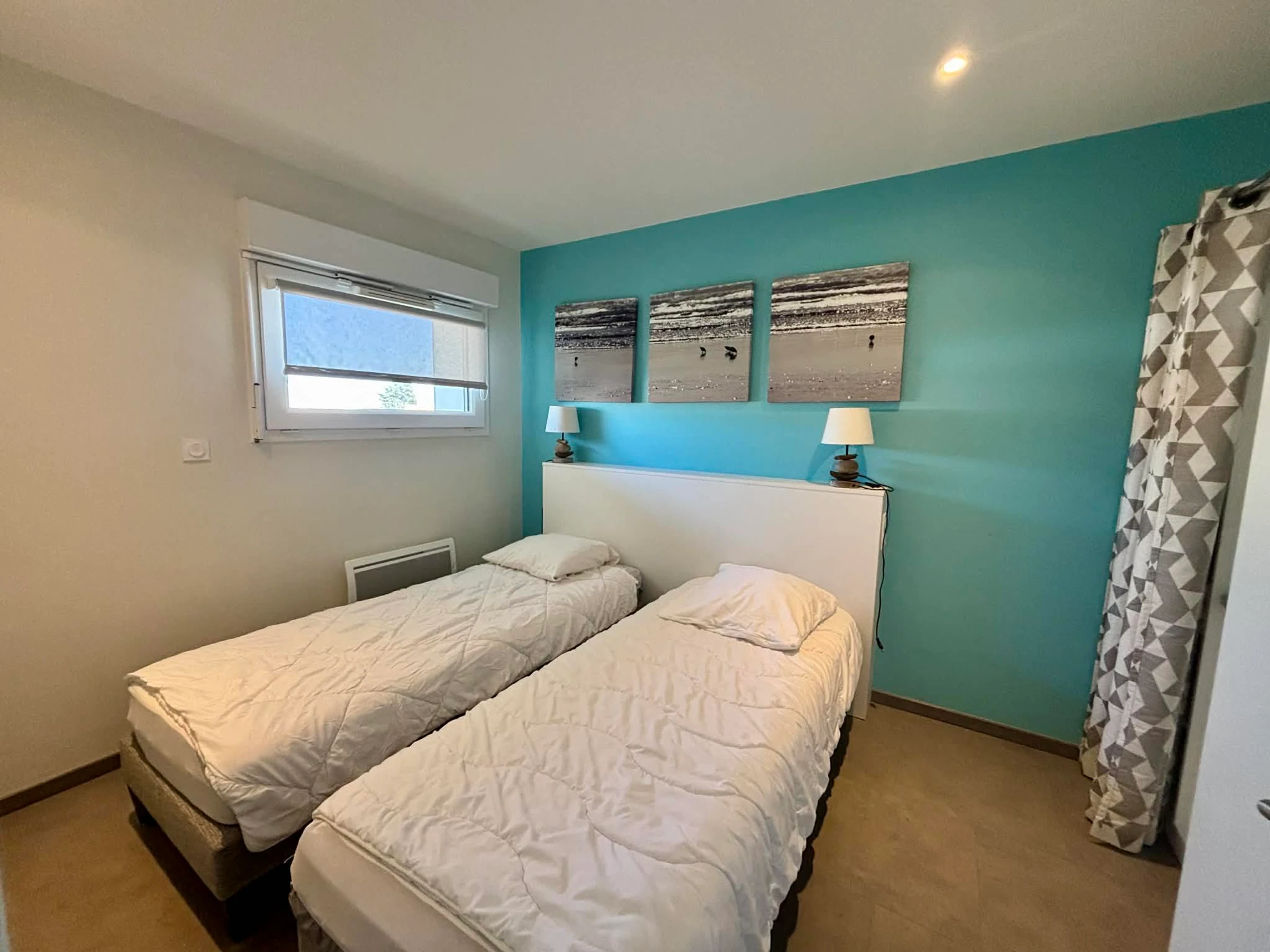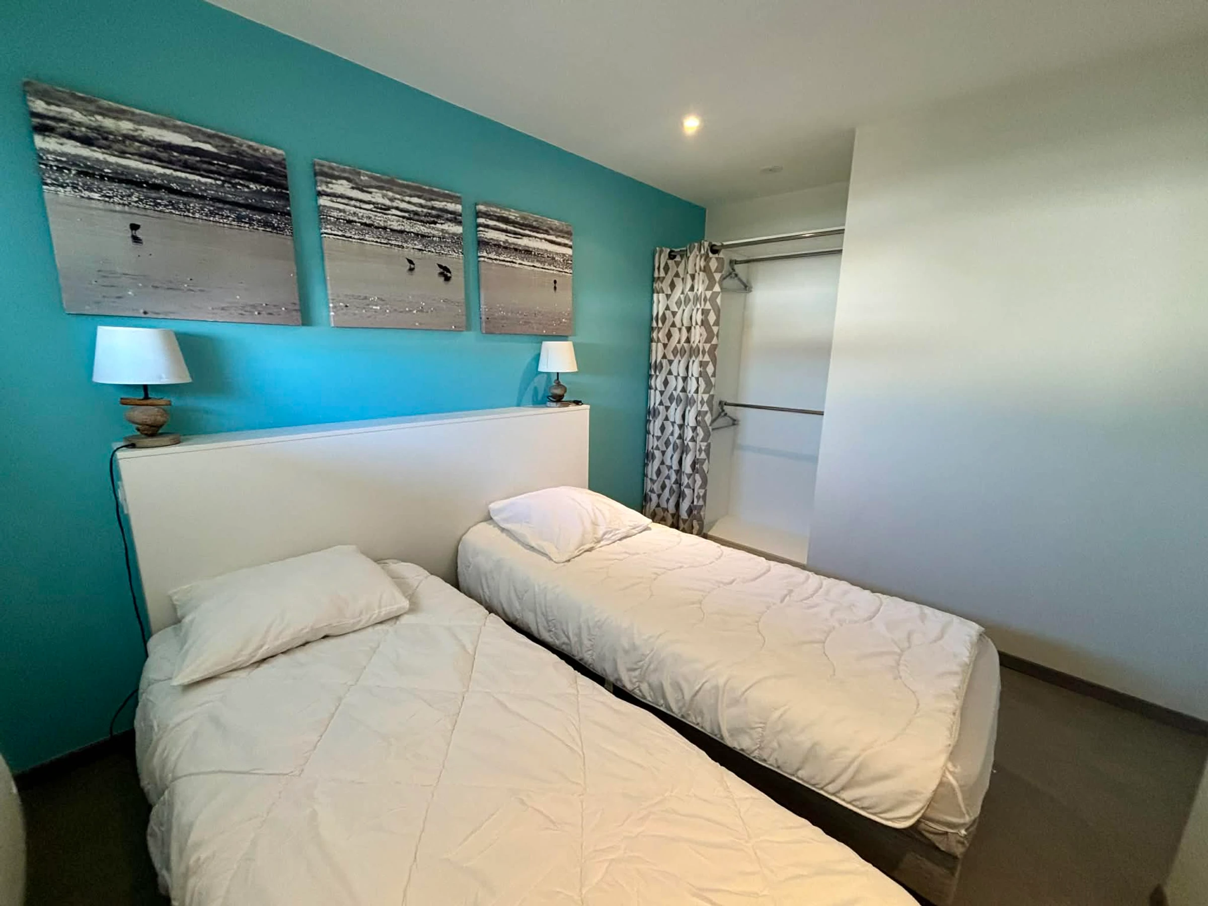 Un dormitorio con dos camas individuales (80 cm) que se pueden unir para formar una cama de matrimonio (160 cm) y vestidor.