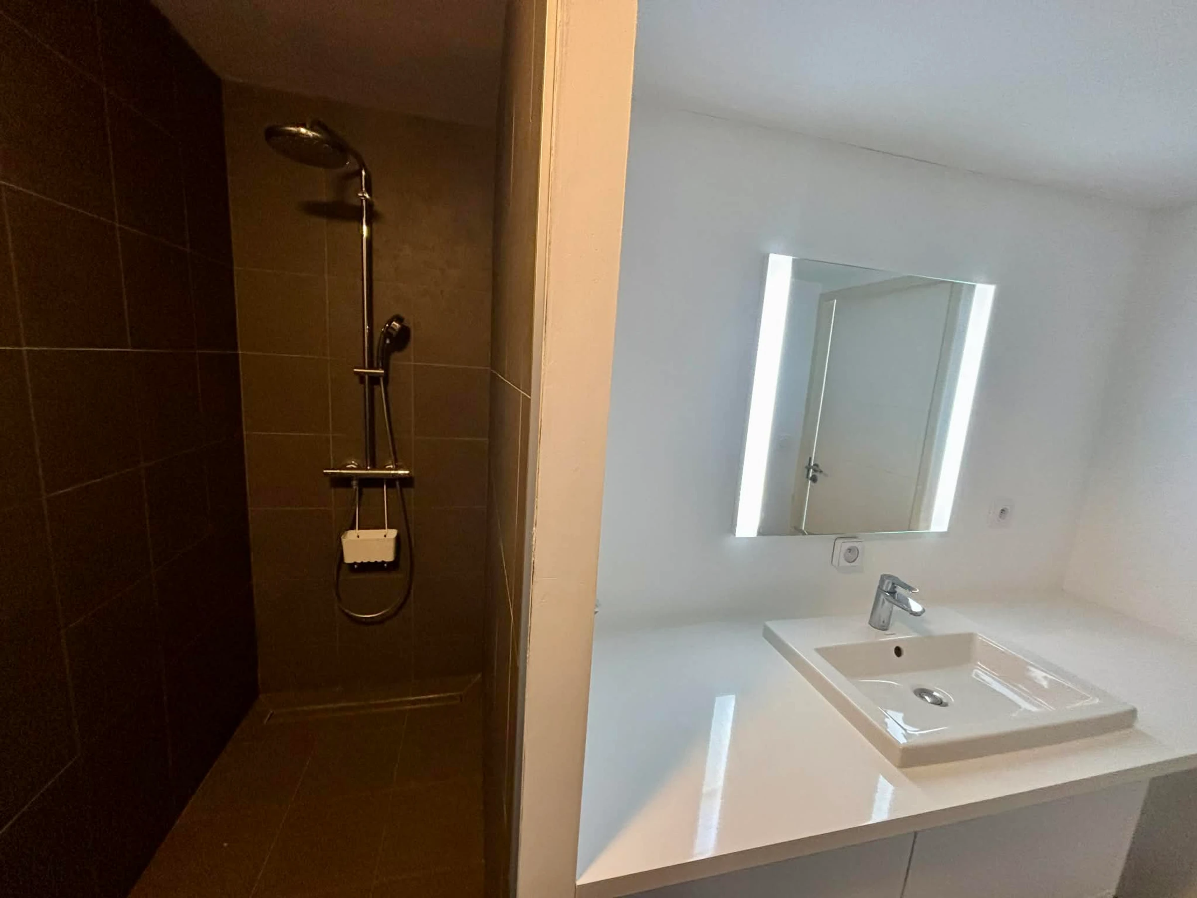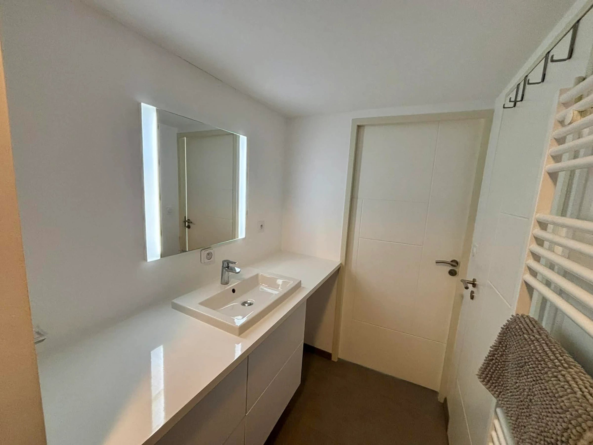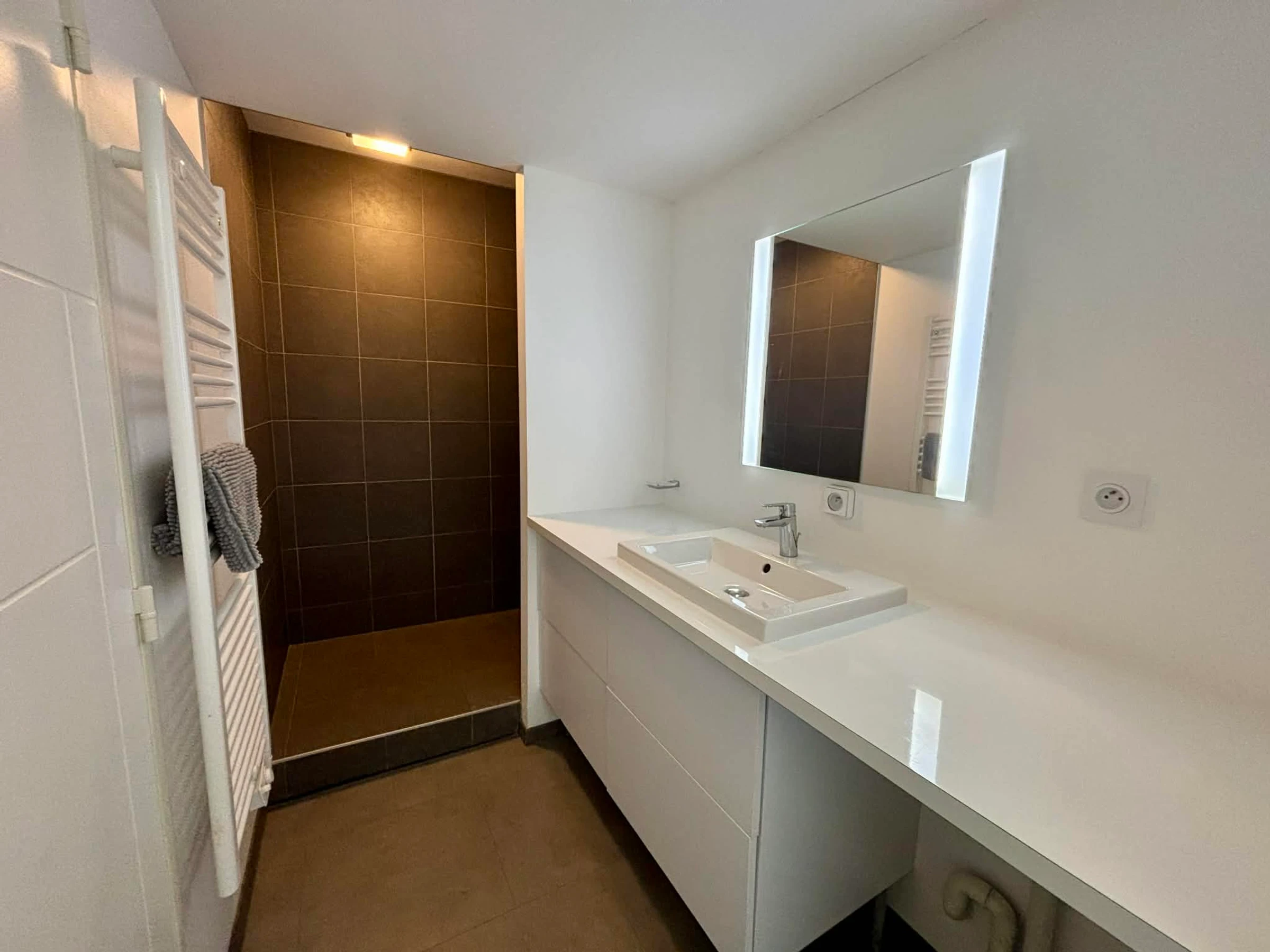 Baño con ducha a ras de suelo, mueble de lavabo y toallero eléctrico.