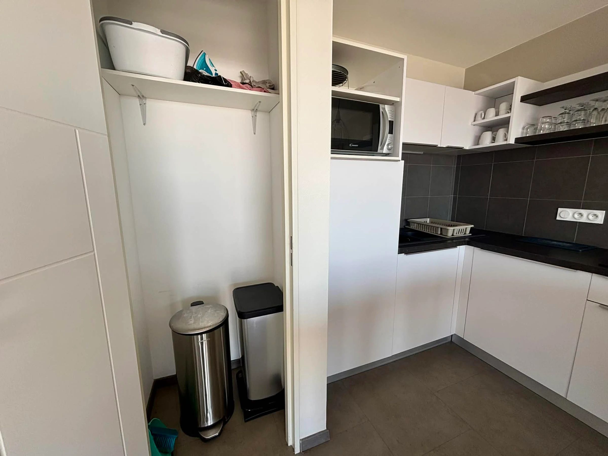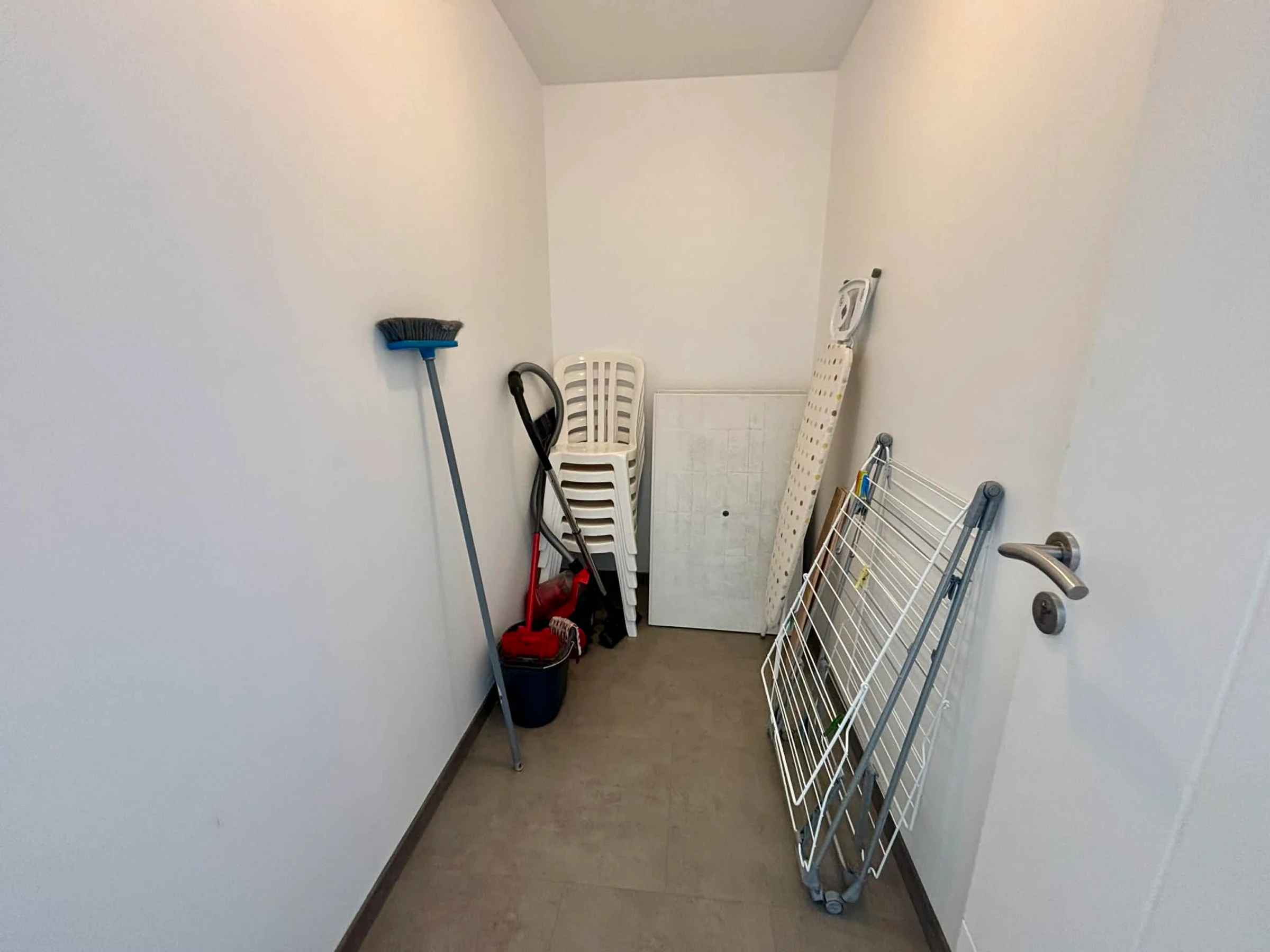Armario con productos de limpieza (aspiradora, fregona, escoba).