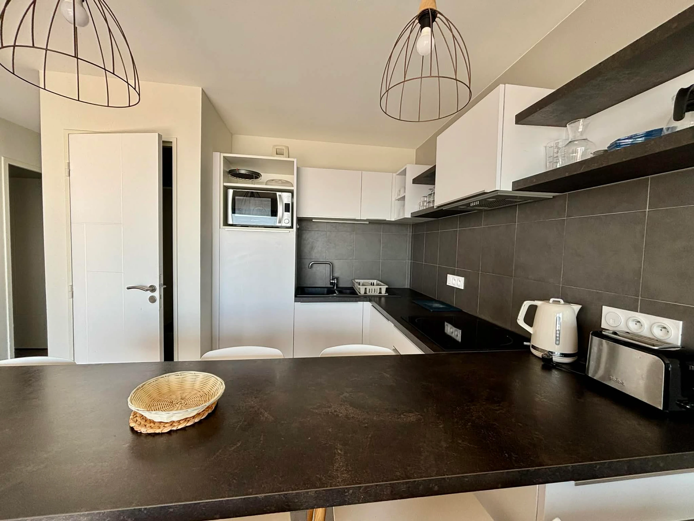 Cocina americana equipada (microondas multifunción, frigorífico/congelador, placa de inducción, cafetera de filtro, tostadora, hervidor de agua).