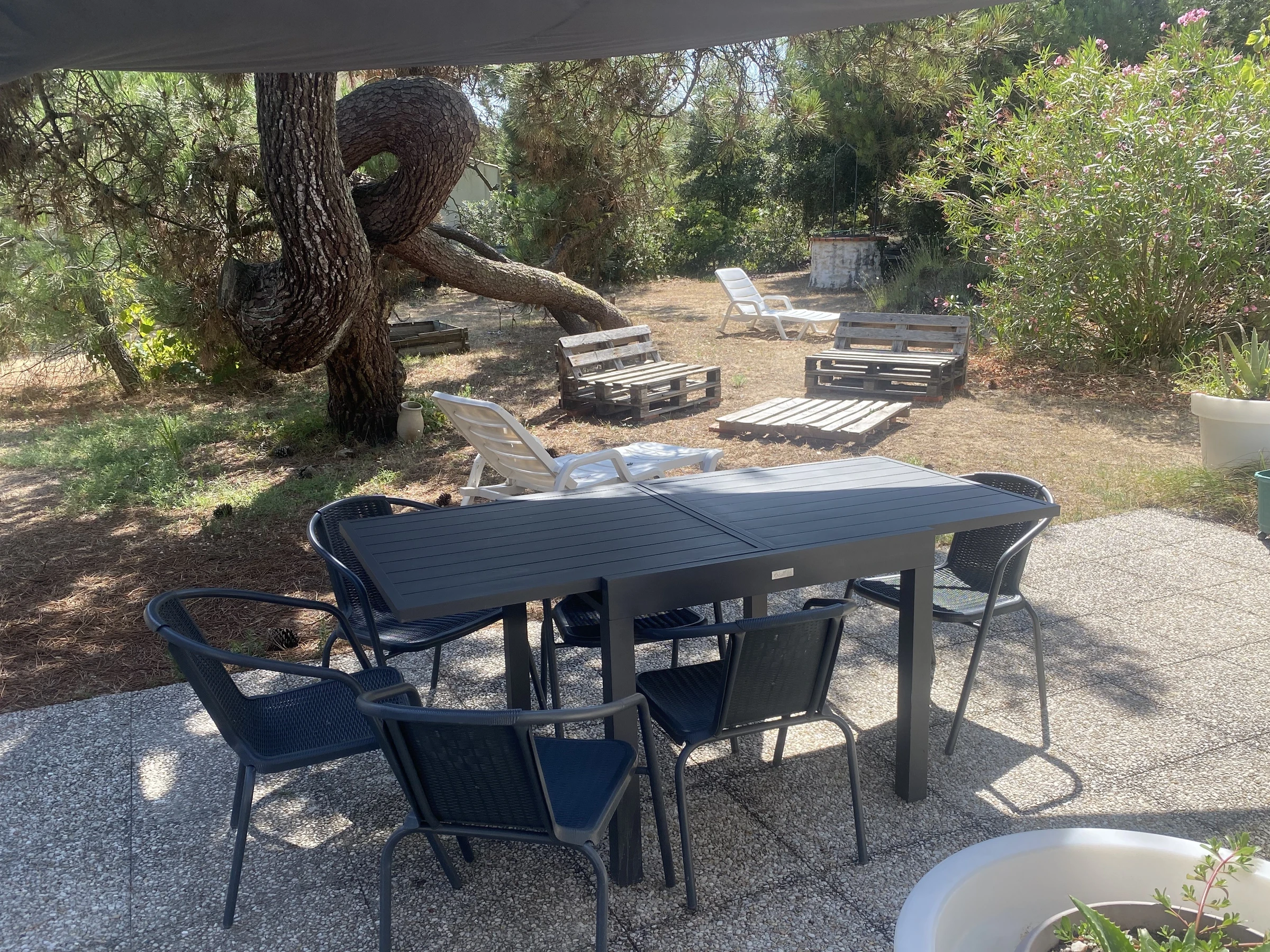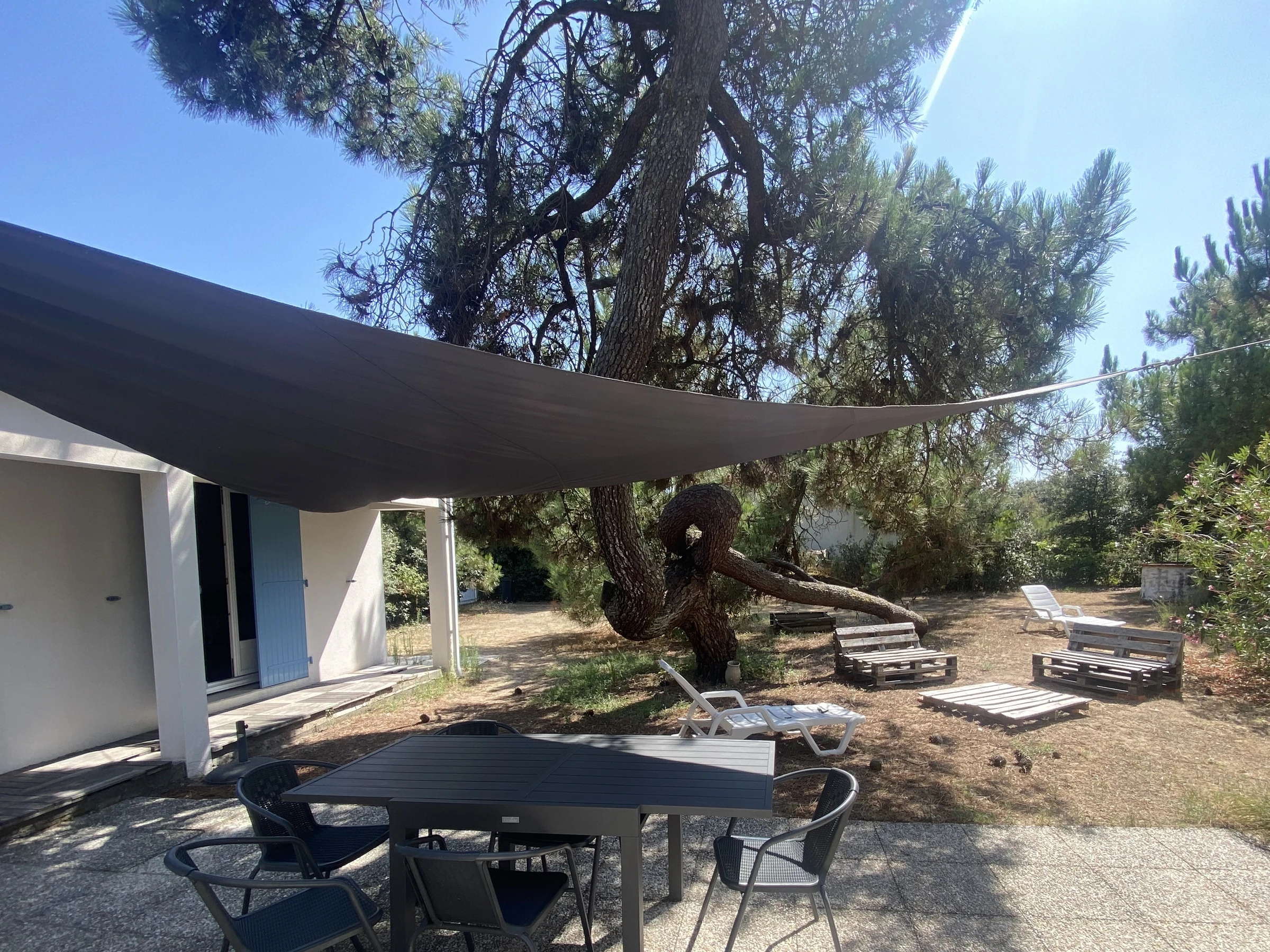 LA TRANCHE SUR MER, Le Phare, playa Corps de Garde. Casa ubicada en una calle sin salida, ideal para unas vacaciones en un entorno natural protegido (parcela de arena de 1400 m² con pinos, parcialmente sin vallar). Parte del terreno se encuentra en la duna, con algunas zonas irregulares: se recomienda precaución con niños pequeños. Fácil aparcamiento en la propiedad.