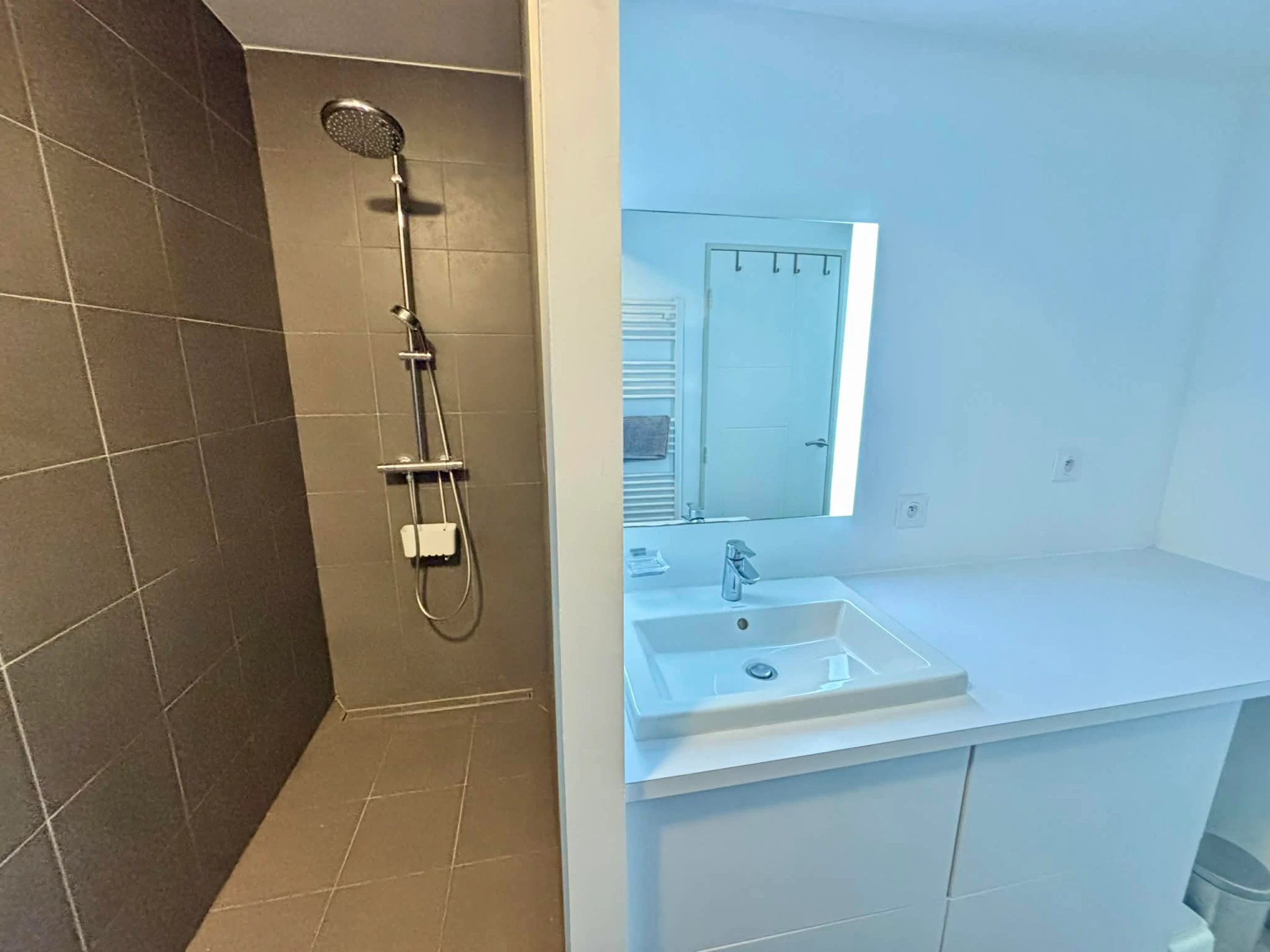 Baño con ducha a ras de suelo, mueble de lavabo y toallero eléctrico.