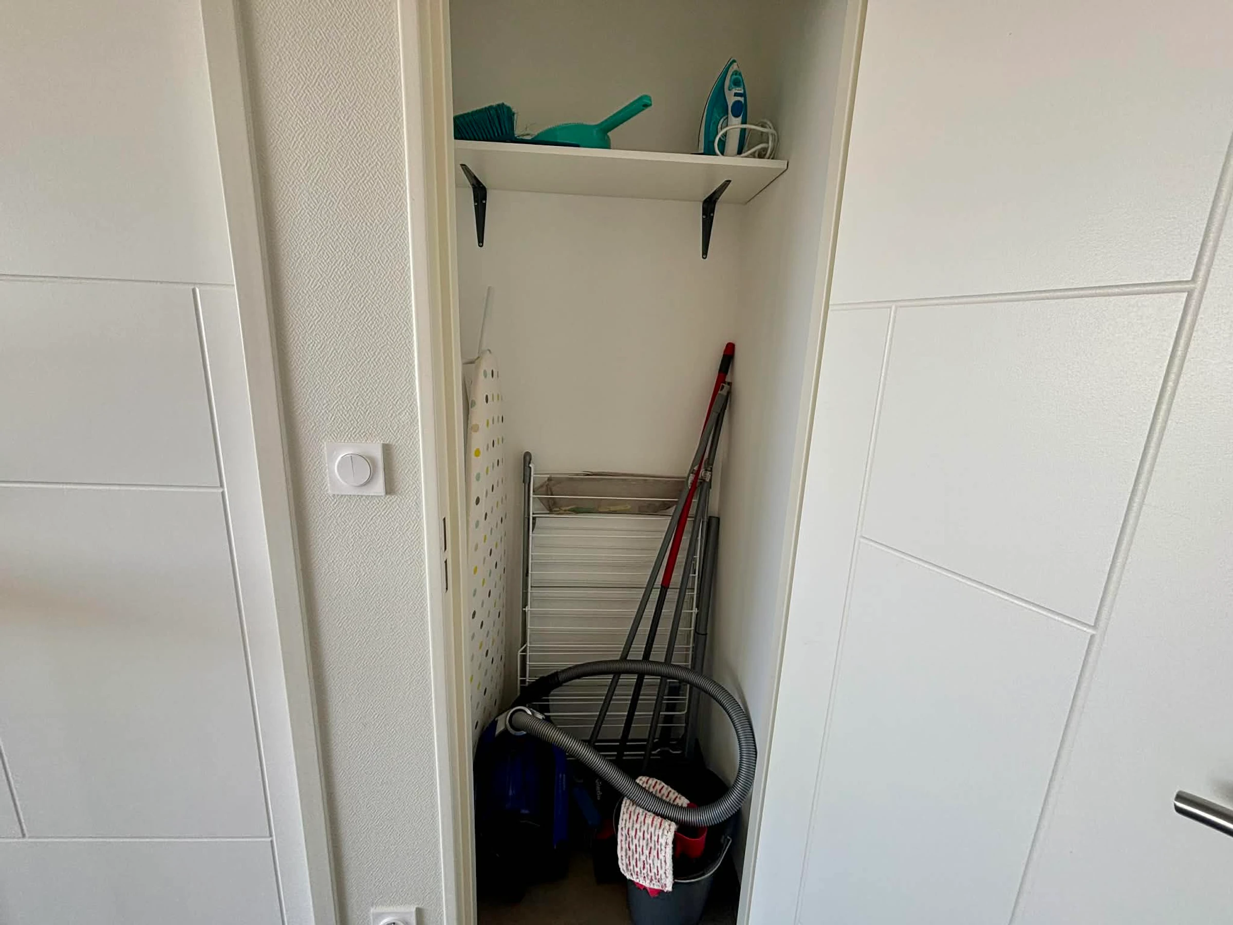 Armario con productos de limpieza (aspiradora, fregona, escoba).