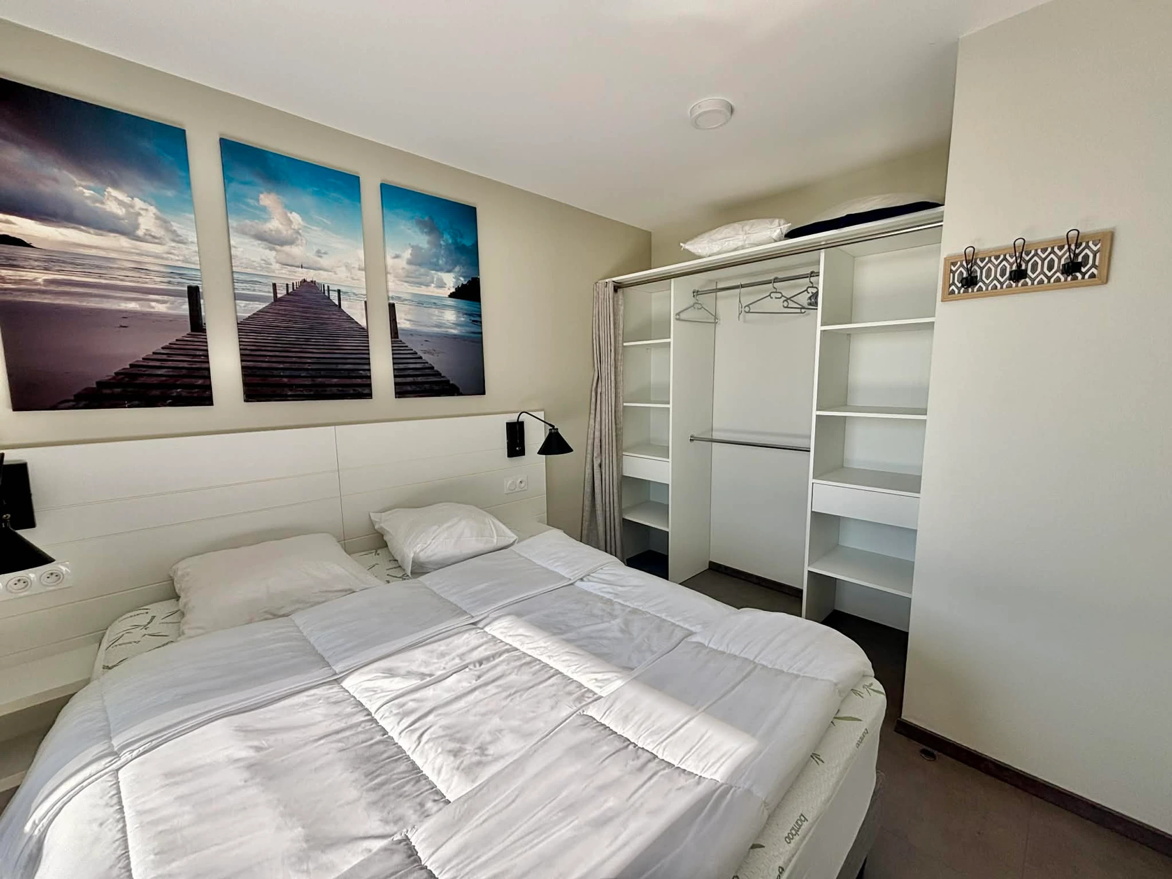 Un dormitorio con dos camas individuales (80 cm) que se pueden unir para formar una cama de matrimonio (160 cm) y vestidor.