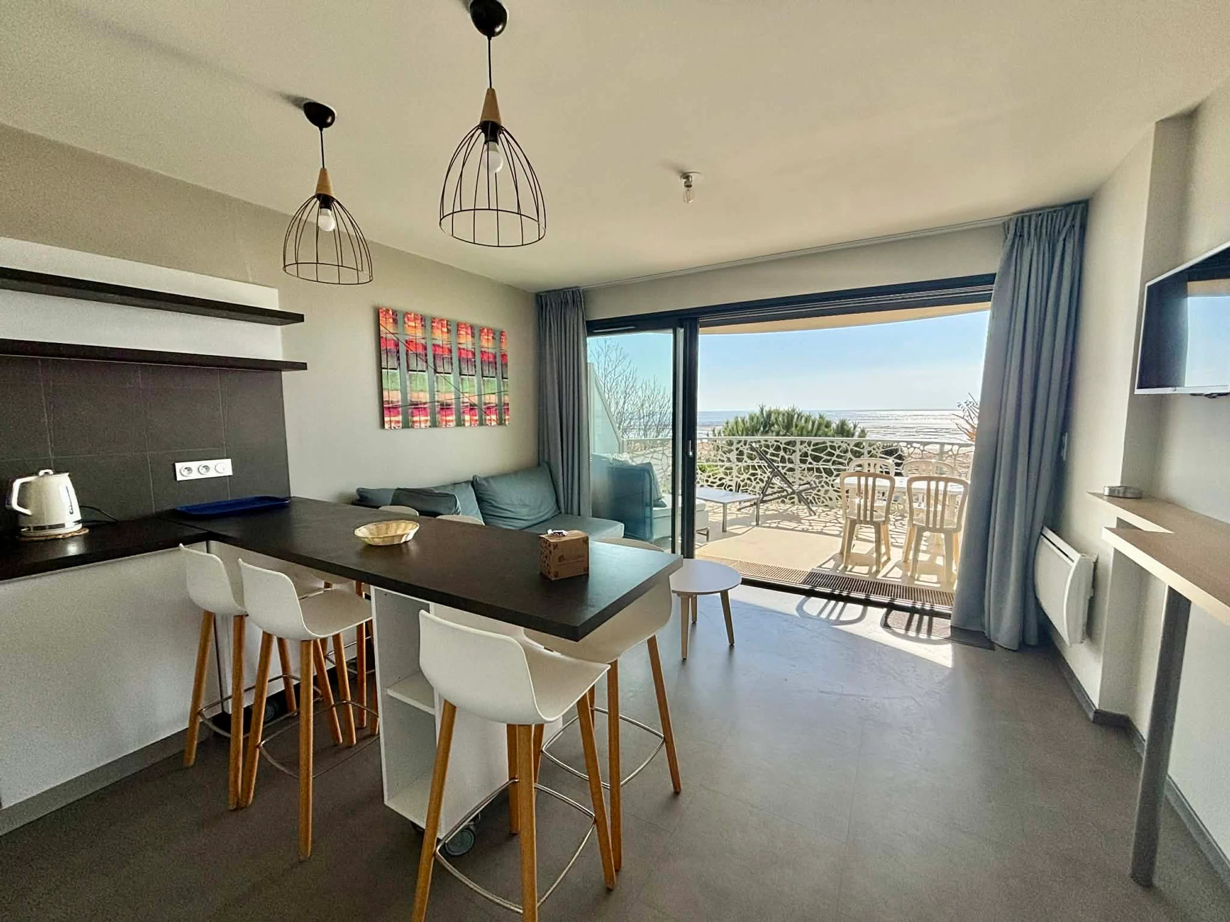 Salón-comedor con isla central, sofá cama (140 cm), TV de pantalla plana.