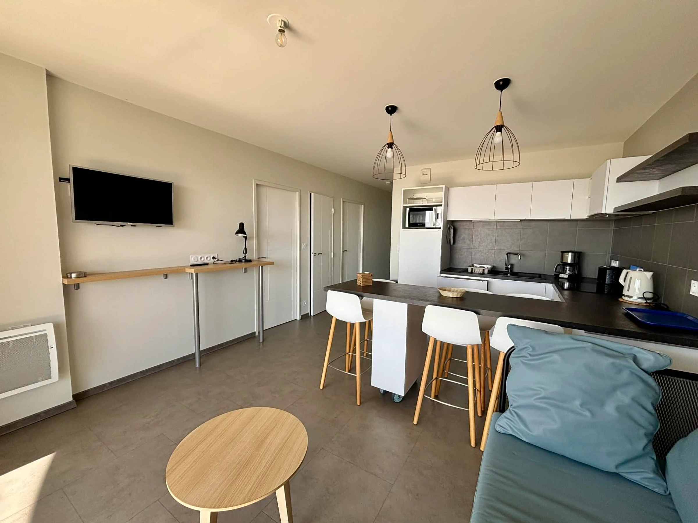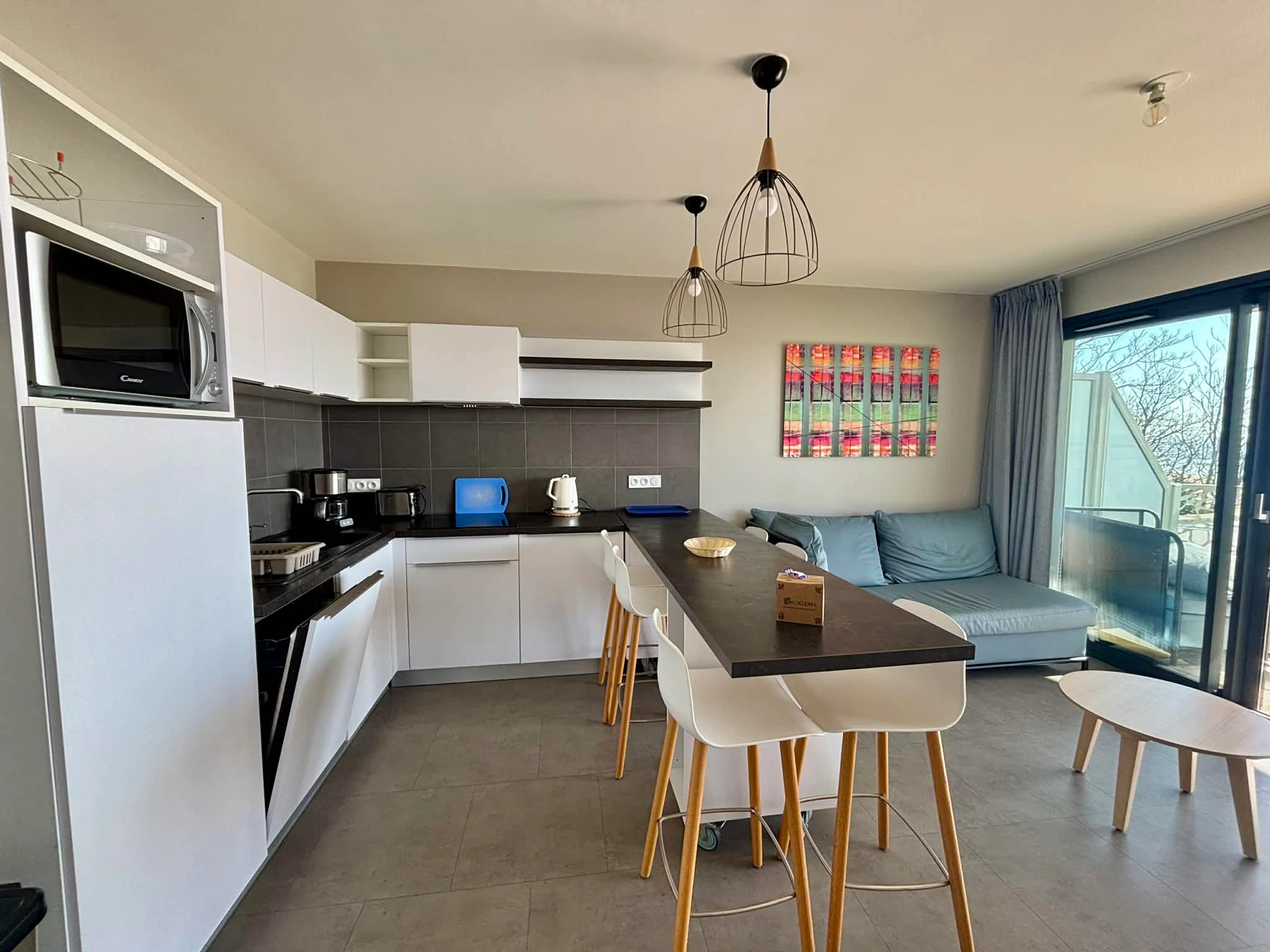 Cocina americana equipada (microondas multifunción, frigorífico/congelador, placa de inducción, cafetera de filtro, tostadora, hervidor de agua).