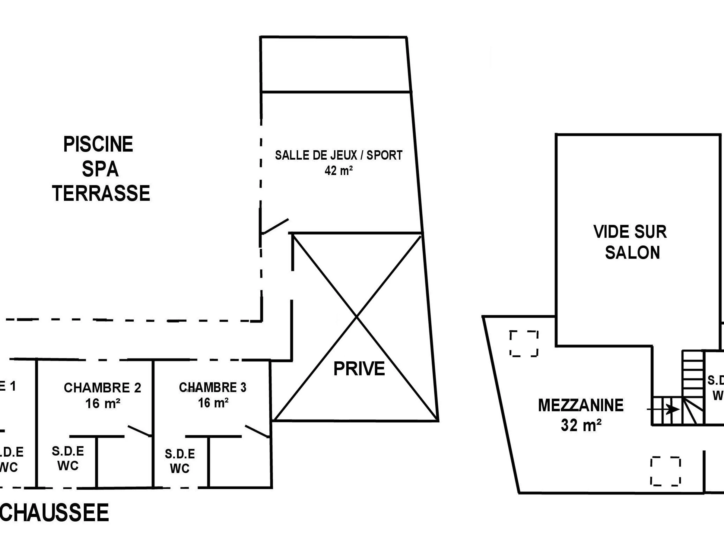 Planta baja: cocina equipada que da a un amplio y luminoso salón-comedor de 90 m² con chimenea y piano de cola disponible, lavadero, 3 dormitorios (cada uno con cama de 160x200, baño privado con ducha y WC), sala de cine, gimnasio y sala de juegos, y WC independiente.