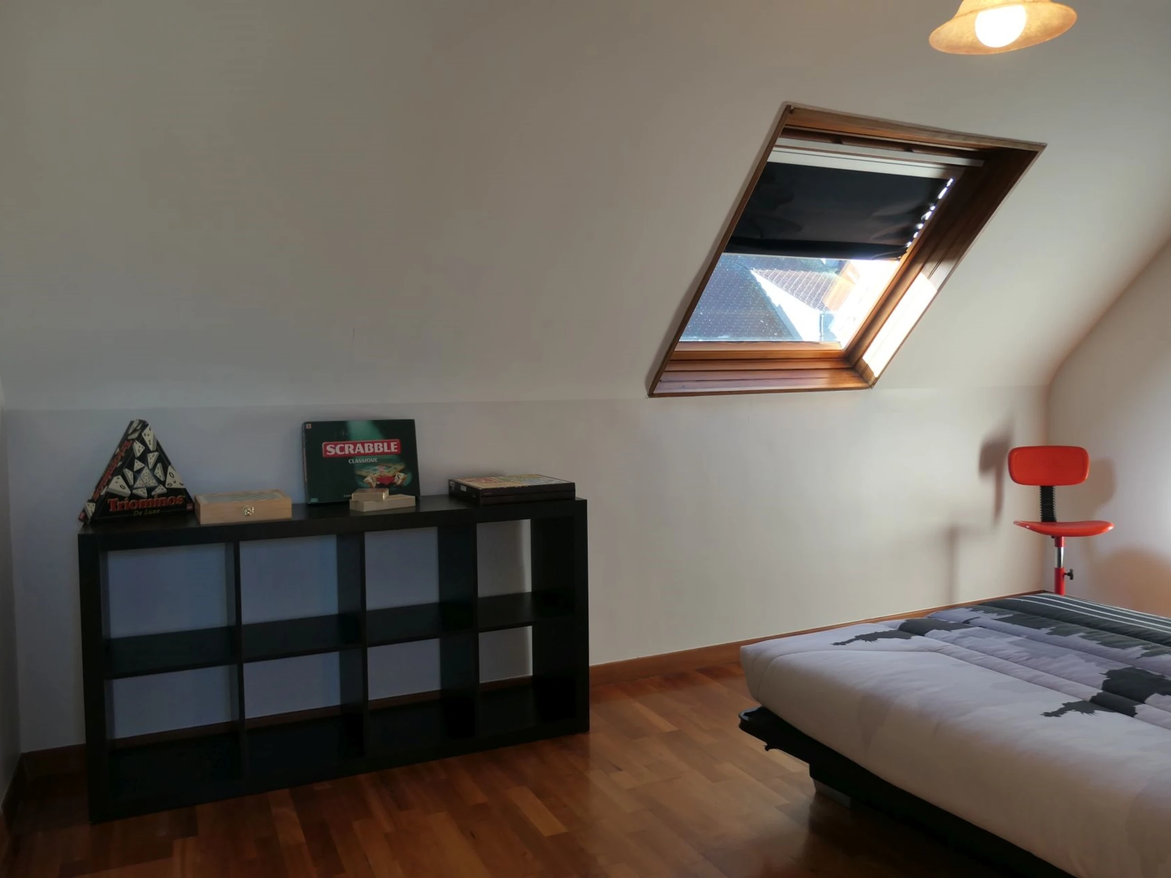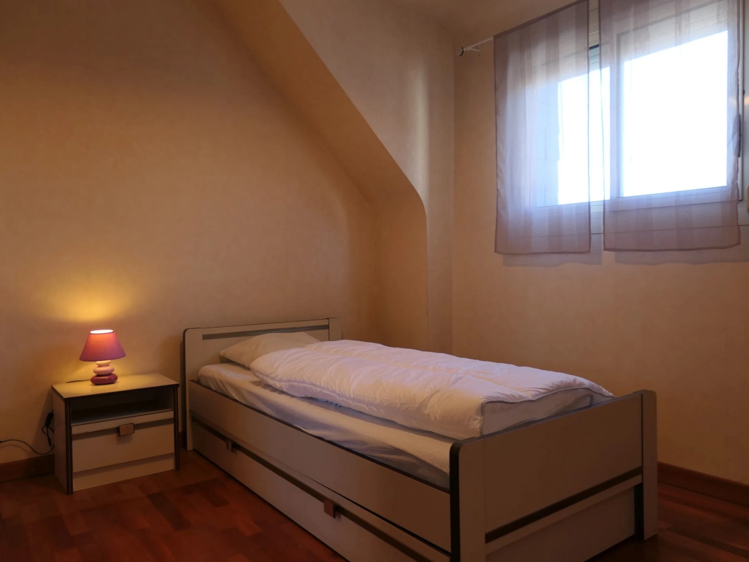 En la planta superior: un segundo dormitorio (pequeño) con cama individual (90 cm) y armario (con estantes), un tercer dormitorio con sofá cama y espacio de almacenaje, y un aseo con lavabo. Un cuarto dormitorio con cama de matrimonio (140 cm), armario (con espacio para colgar ropa y estantes) y cómoda.
