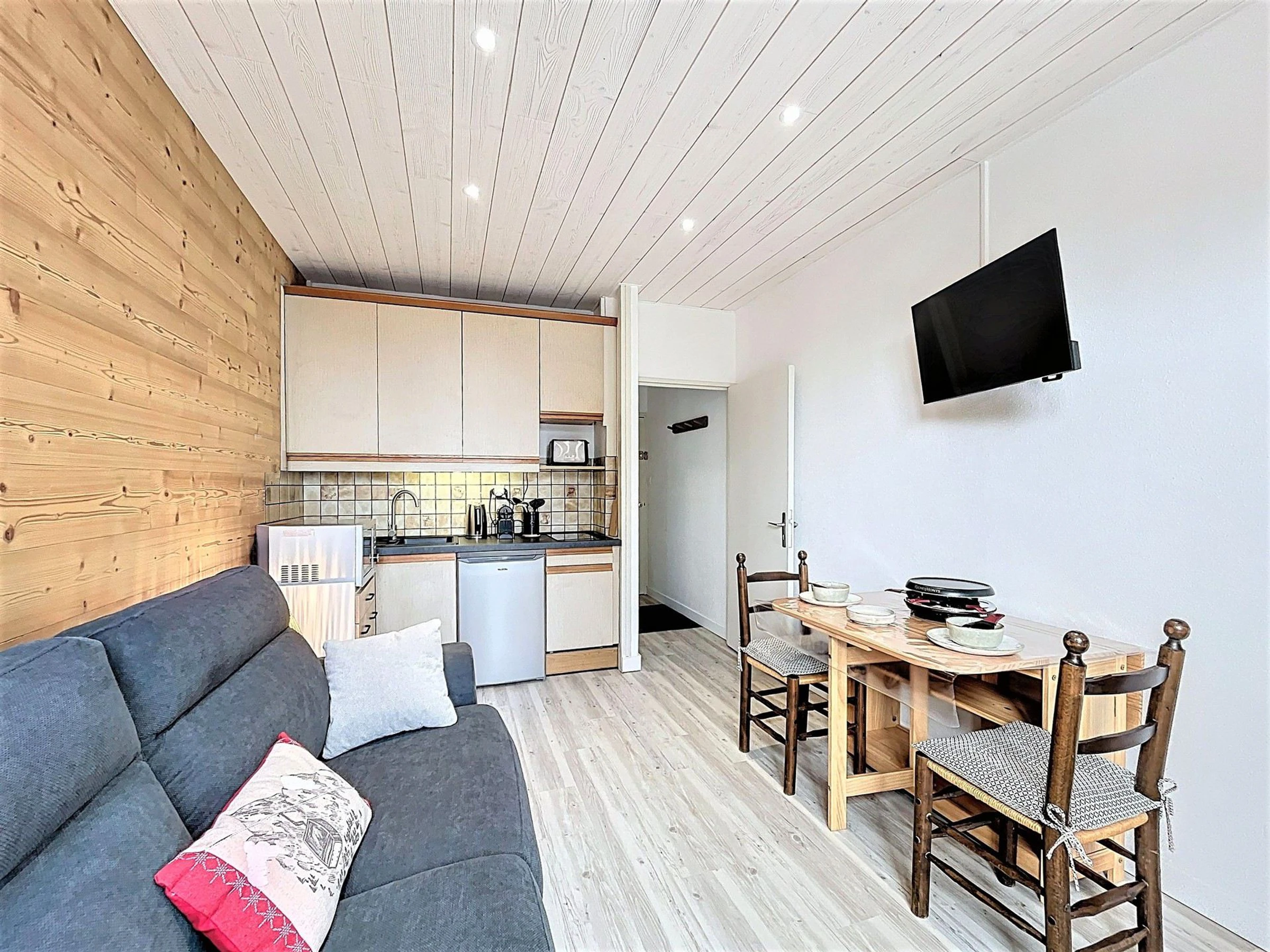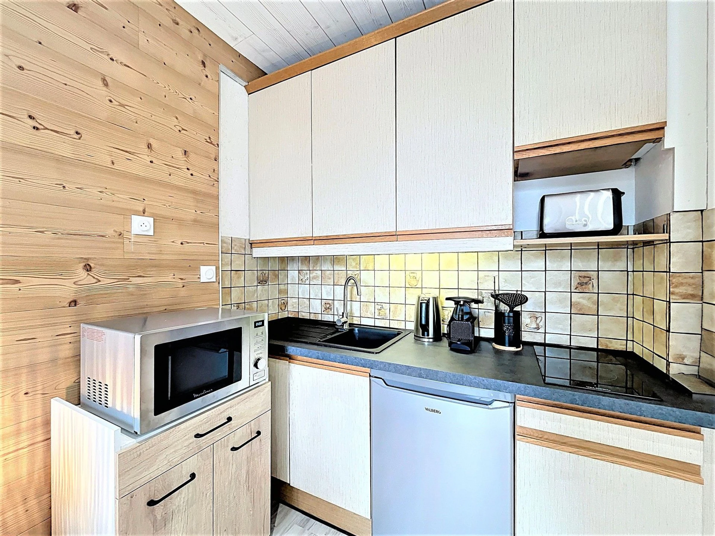 La cocina americana, funcional y bien equipada, incluye dos placas vitrocerámicas, un mini horno con función microondas, una nevera compacta, una cafetera Nespresso®, tostadora, hervidor de agua, aparato para raclette, creperas y pierrade, etc.