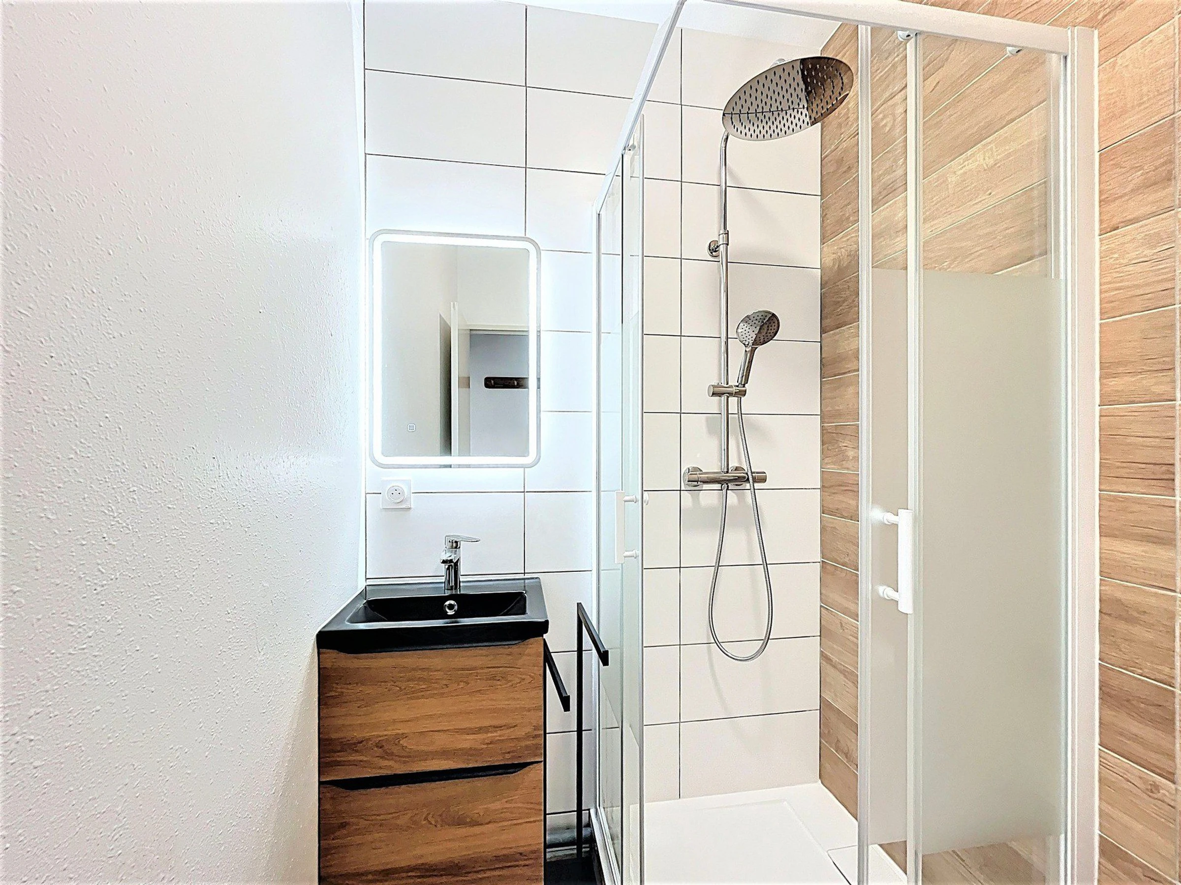 El baño es moderno y cuenta con ducha, mueble de lavabo e inodoro.