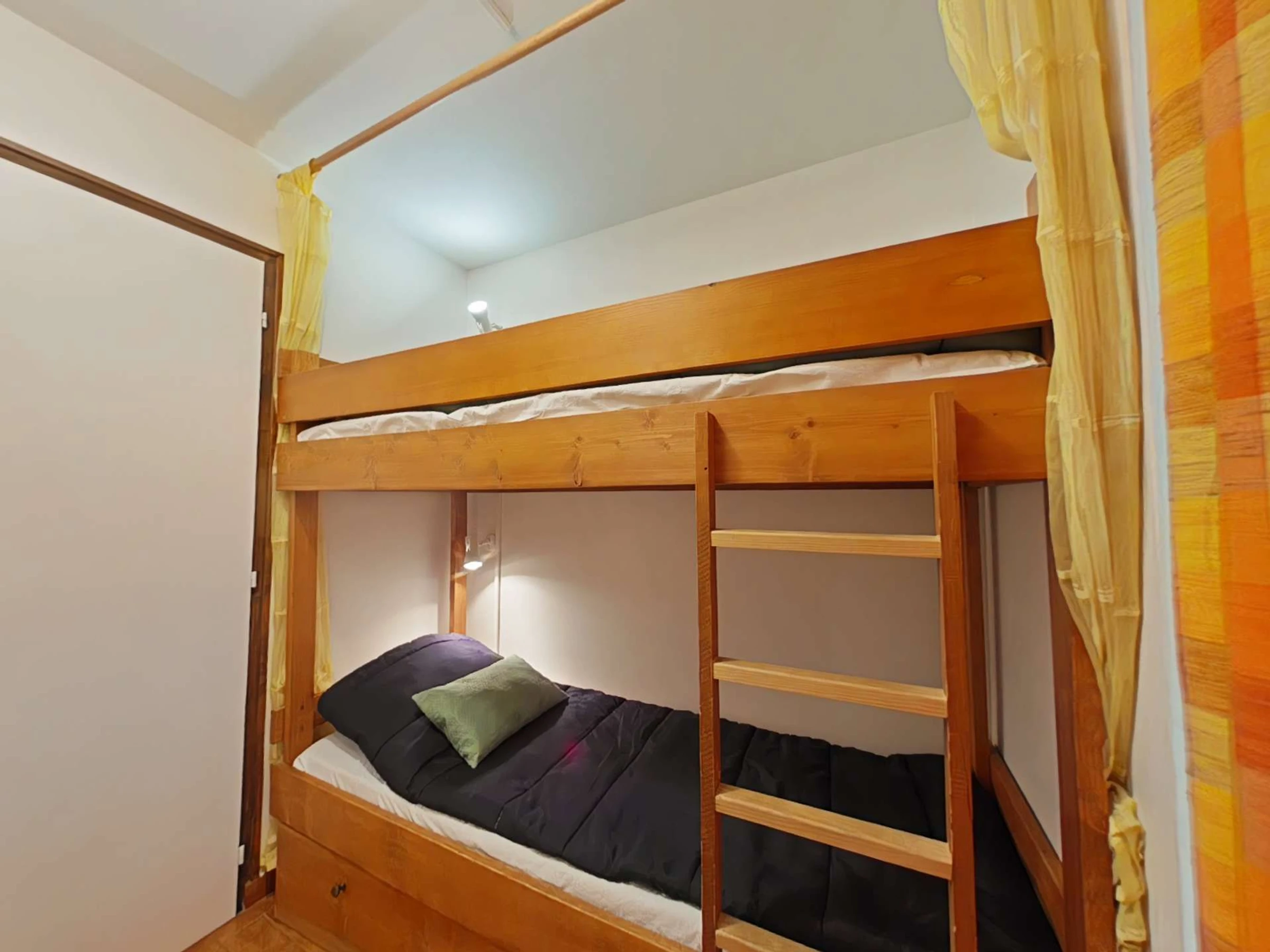 Este apartamento vacacional en planta baja incluye un salón con sofá cama doble y televisión, una cocina americana totalmente equipada, una alcoba con dos literas y un baño completo. El estudio tiene acceso a un balcón con vistas al aparcamiento.
