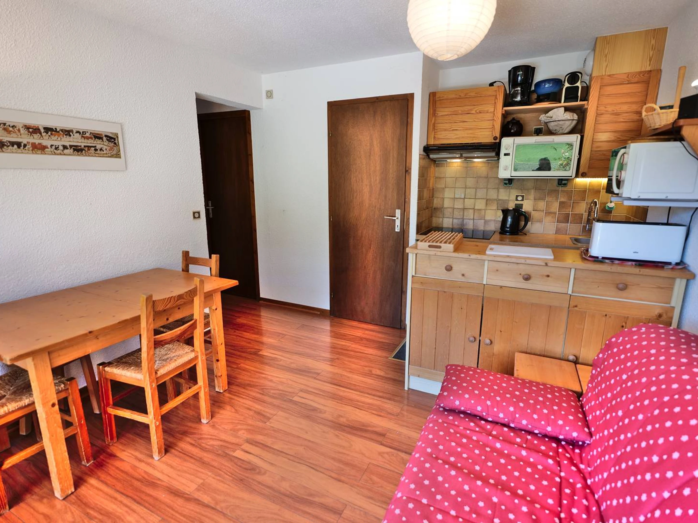 El apartamento se encuentra a 300 metros de los comercios, a 650 metros de las pistas de esquí y a 150 metros de la parada del autobús gratuito.