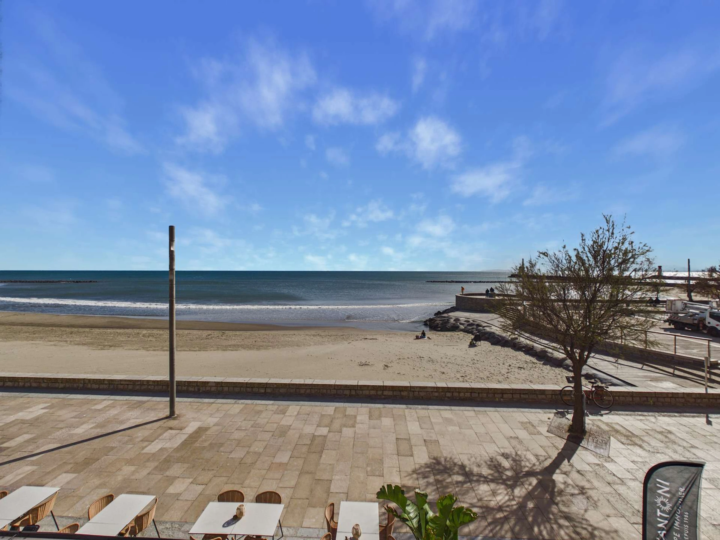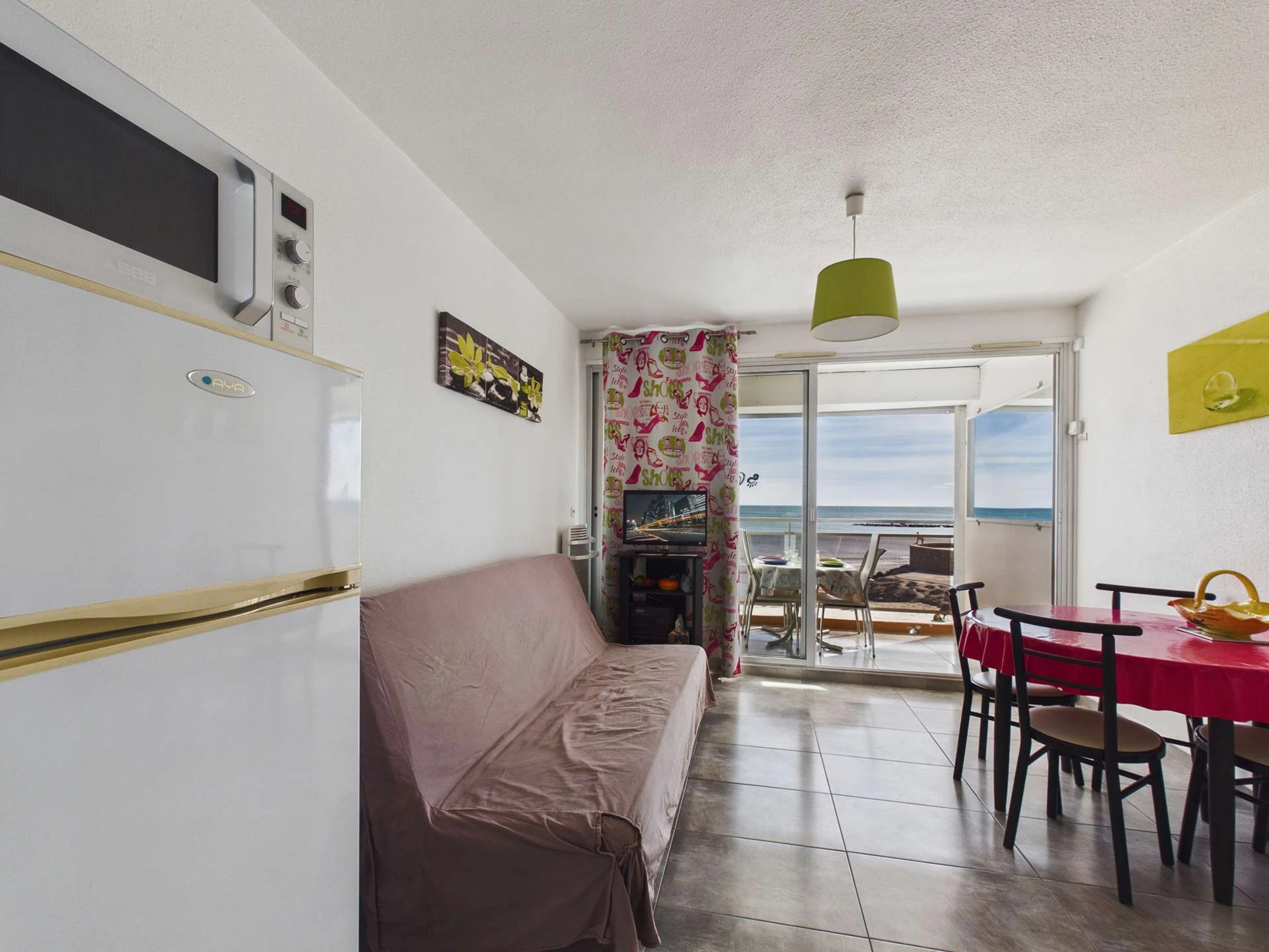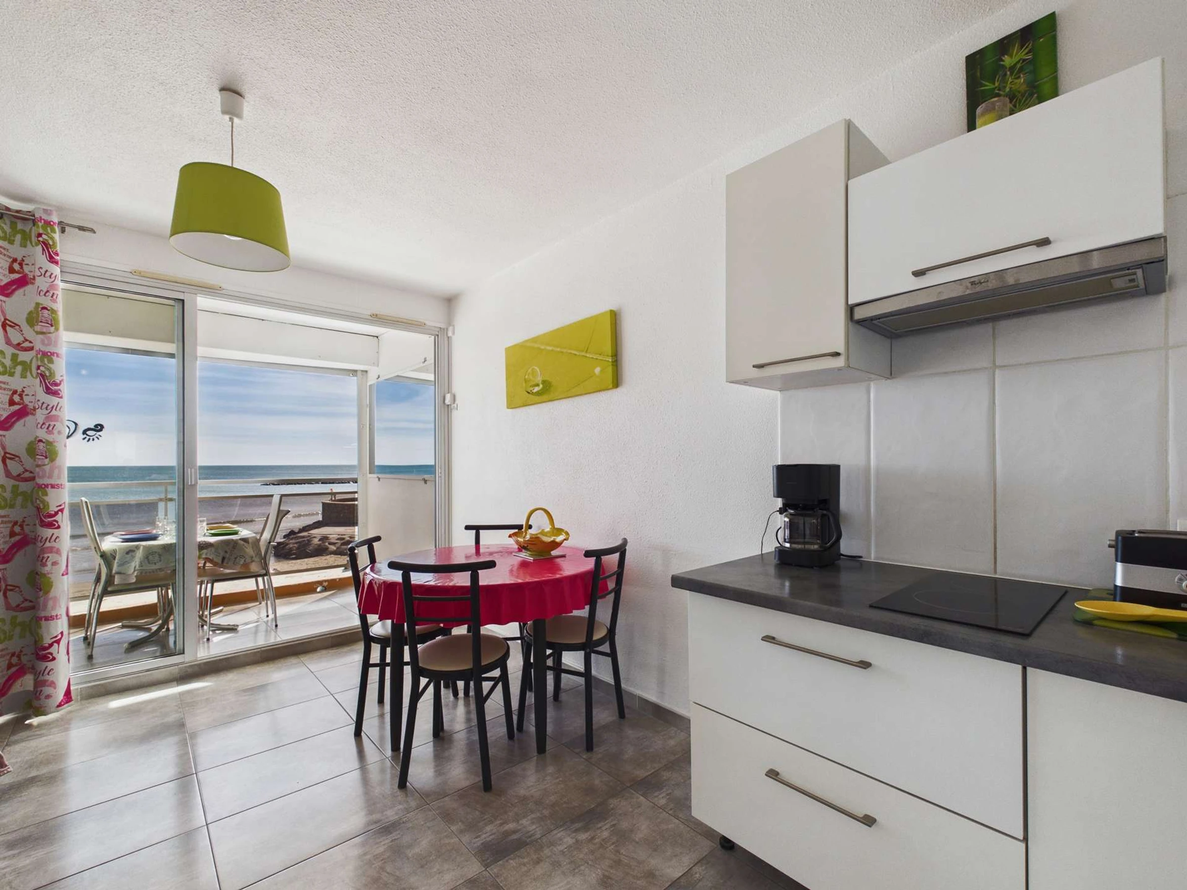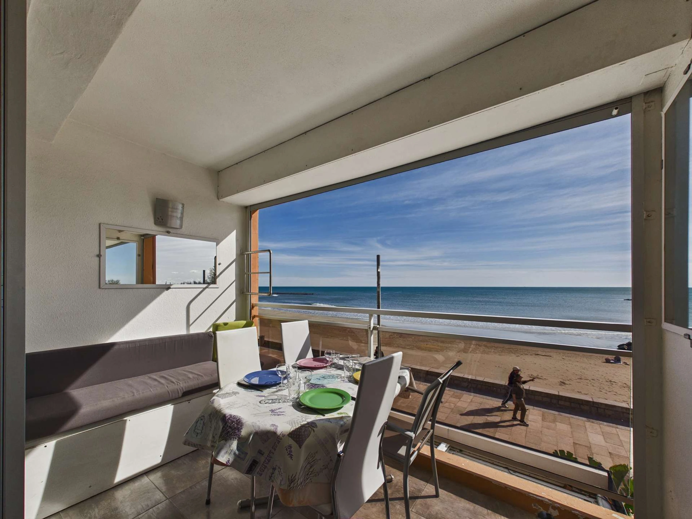 Impresionantes vistas al mar desde la terraza de este encantador y soleado estudio reformado con alcoba. Capacidad para 4 personas en la primera planta (sin ascensor). Tiendas en el centro del pueblo y el mercado cerca. La playa está a 20 metros.