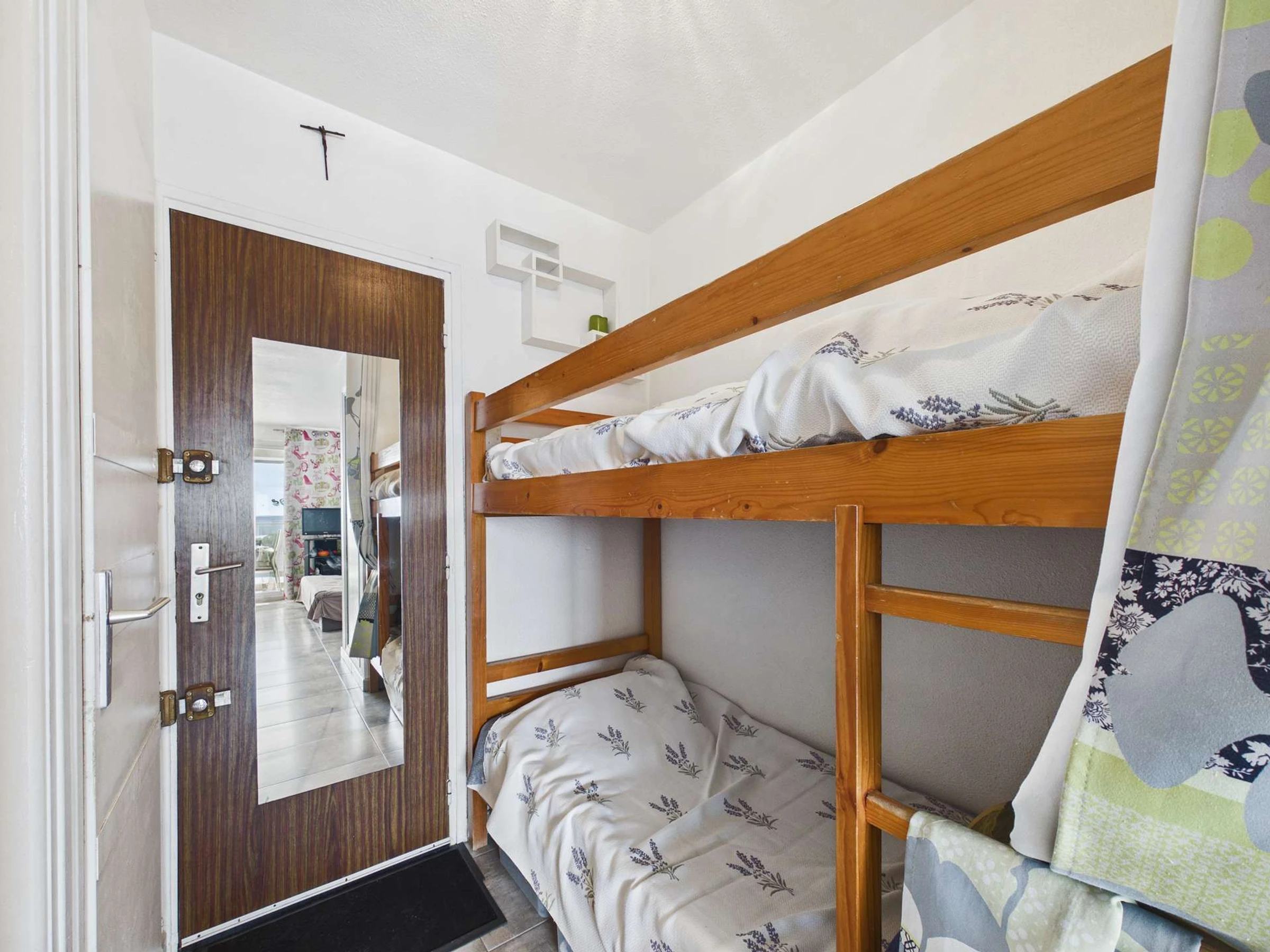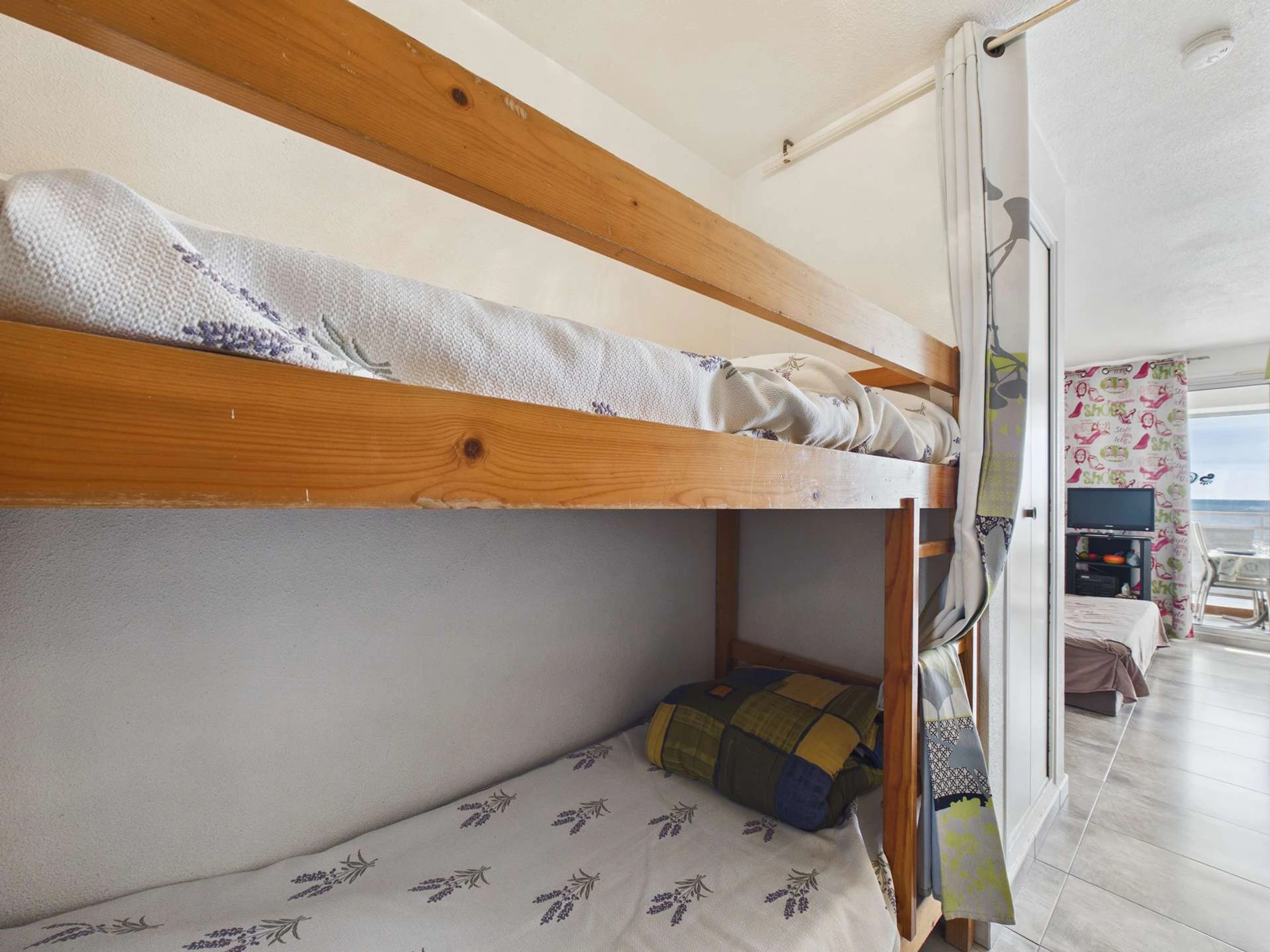 Entrada al salón con sofá cama y TV, alcoba con literas, baño con ducha, aseo independiente, cocina americana equipada con frigorífico-congelador, microondas, cafetera de filtro, mini horno y hervidor de agua.