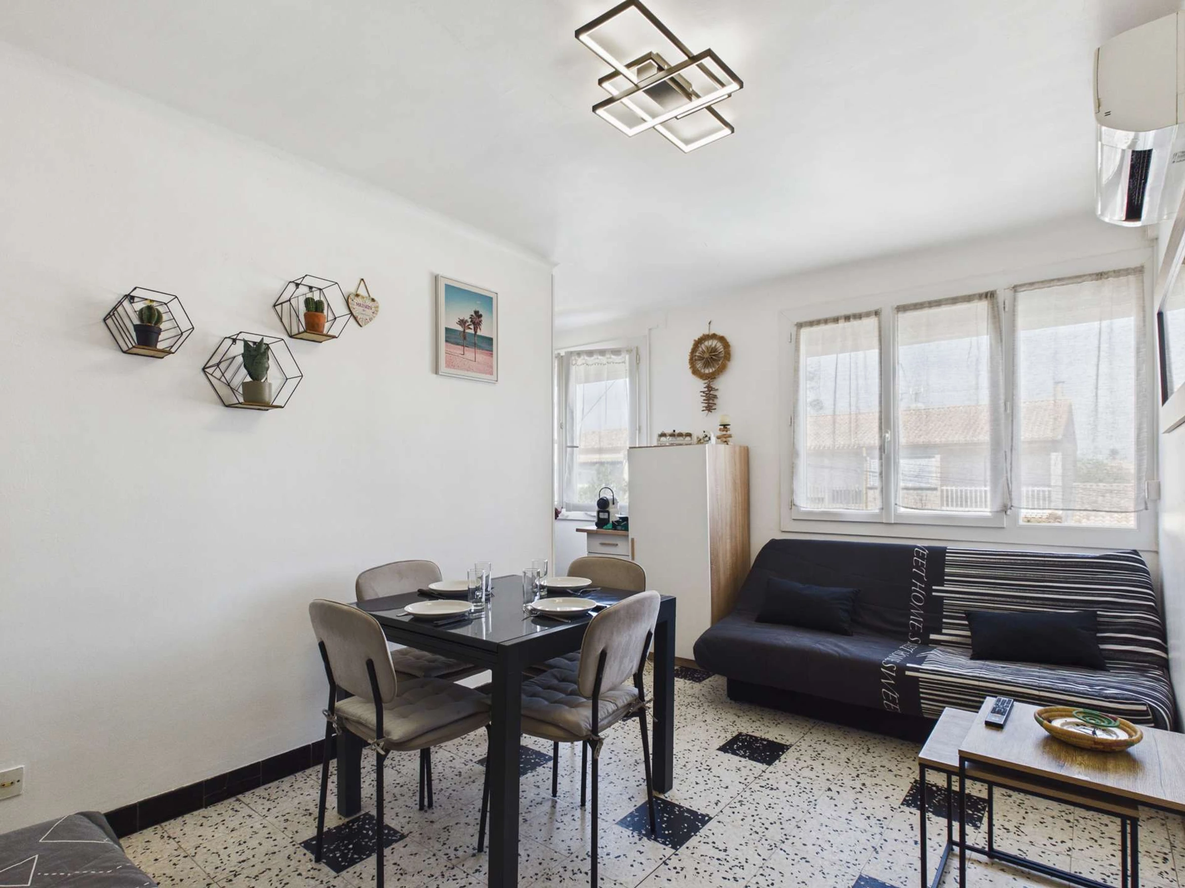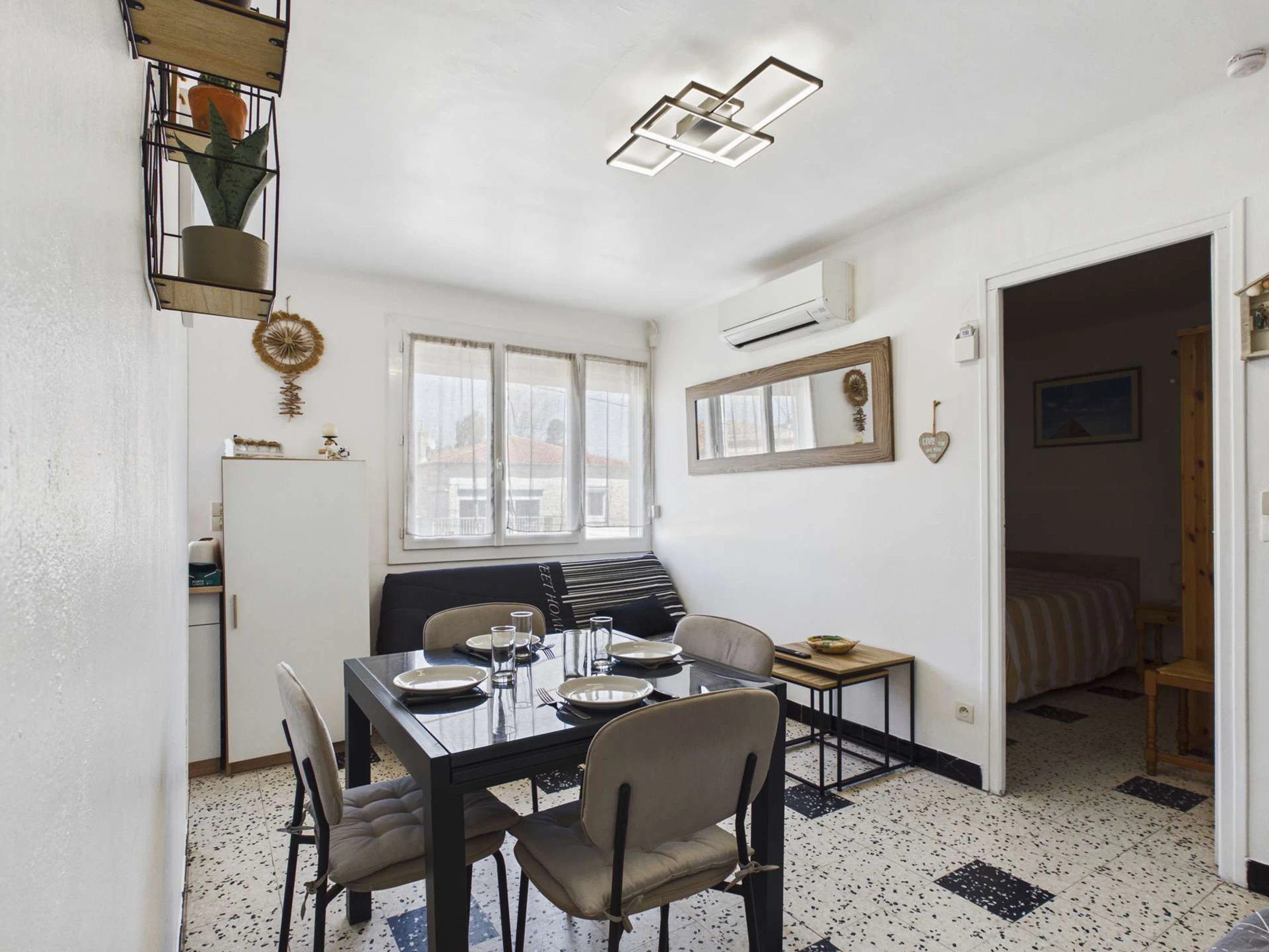 GRAU D'AGDE: Se alquila apartamento de 2 habitaciones con aire acondicionado en la primera planta, situado a tan solo 220 metros de las tiendas y a 250 metros de la playa. Cuenta con salón con sofá cama (para 2 personas), cocina semiabierta equipada, 1 dormitorio con cama de matrimonio, baño con ducha y aseo independiente. Capacidad para 4 personas. Lavadora incluida.