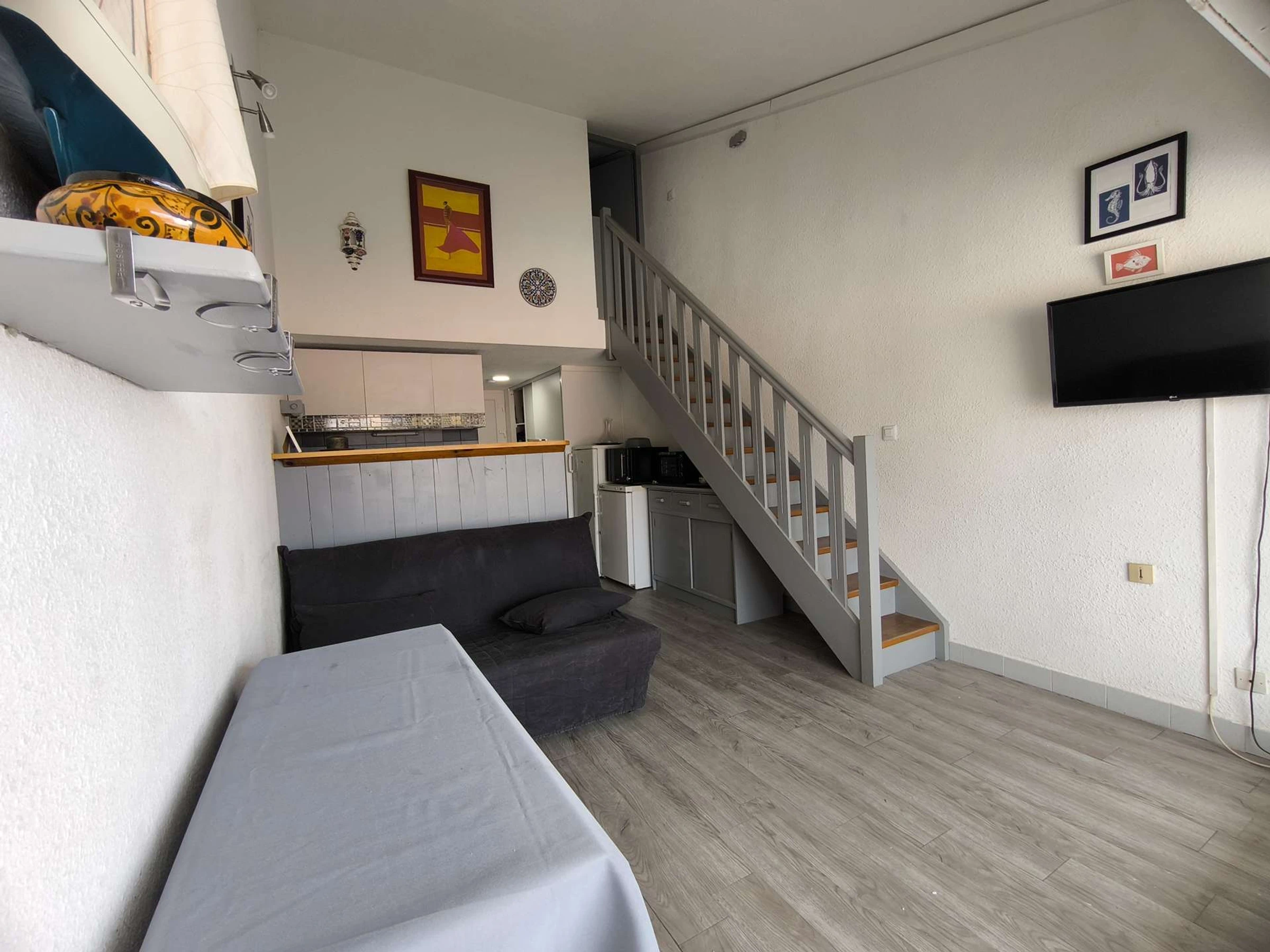 Apartamento de 2 habitaciones con aire acondicionado. Entrada con acceso a una sala de estar con sofá cama doble y televisión, y cocina americana totalmente equipada. Dormitorio en la segunda planta con cama de matrimonio (160 cm).