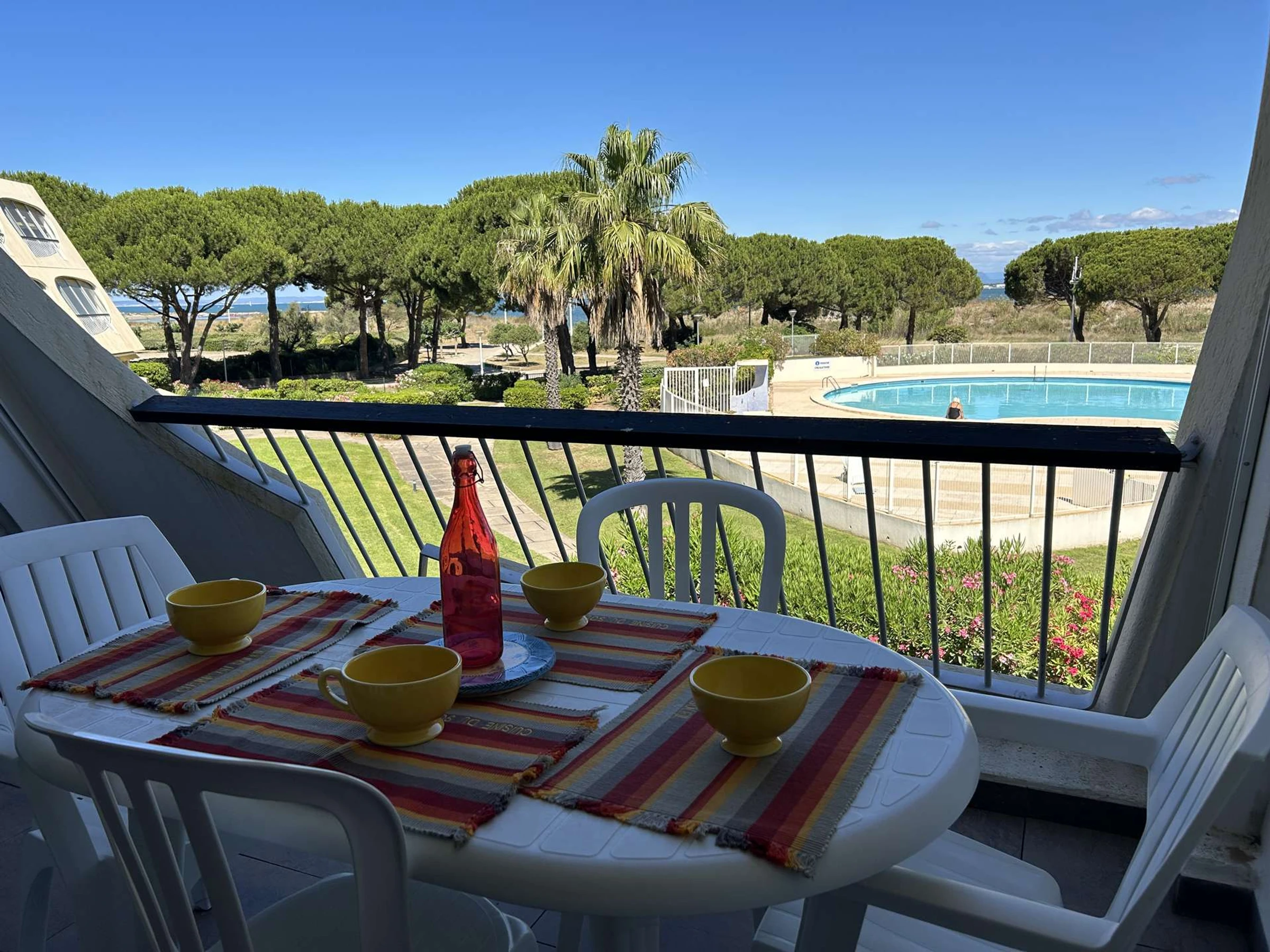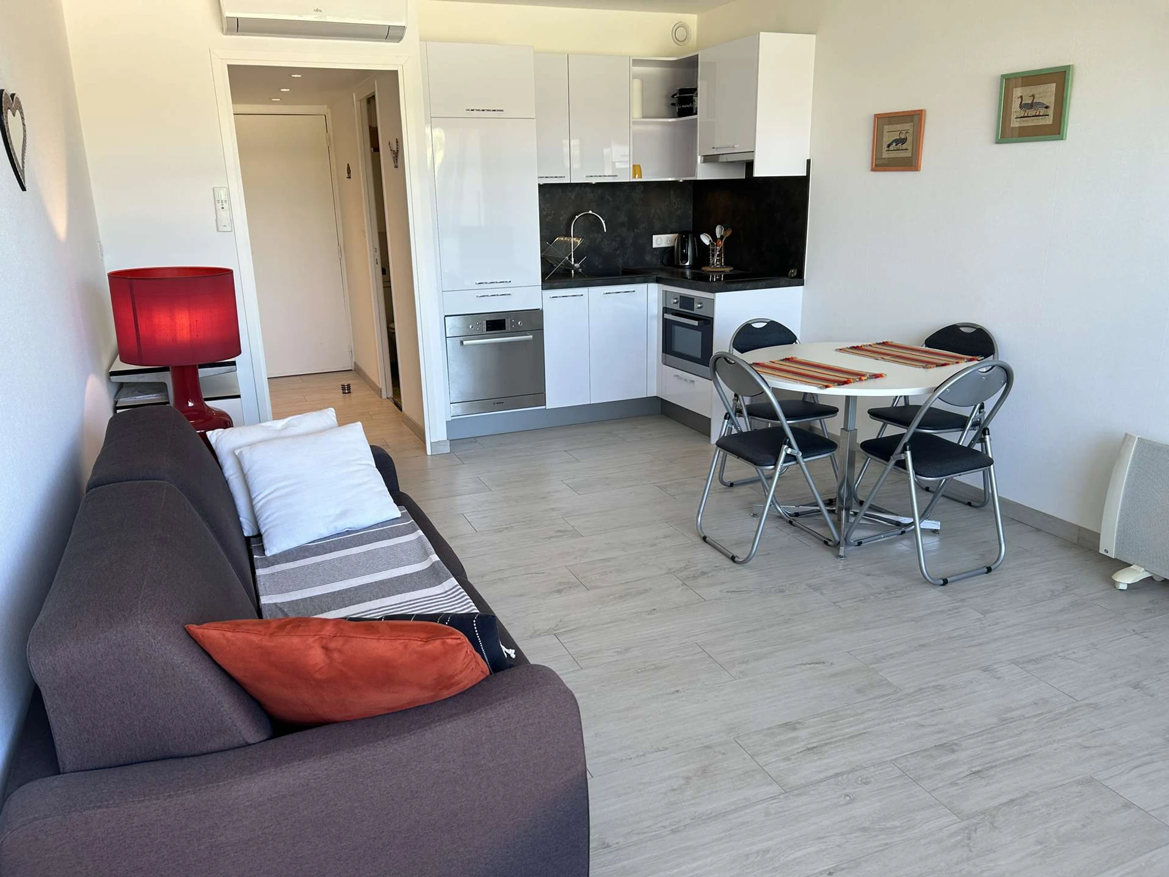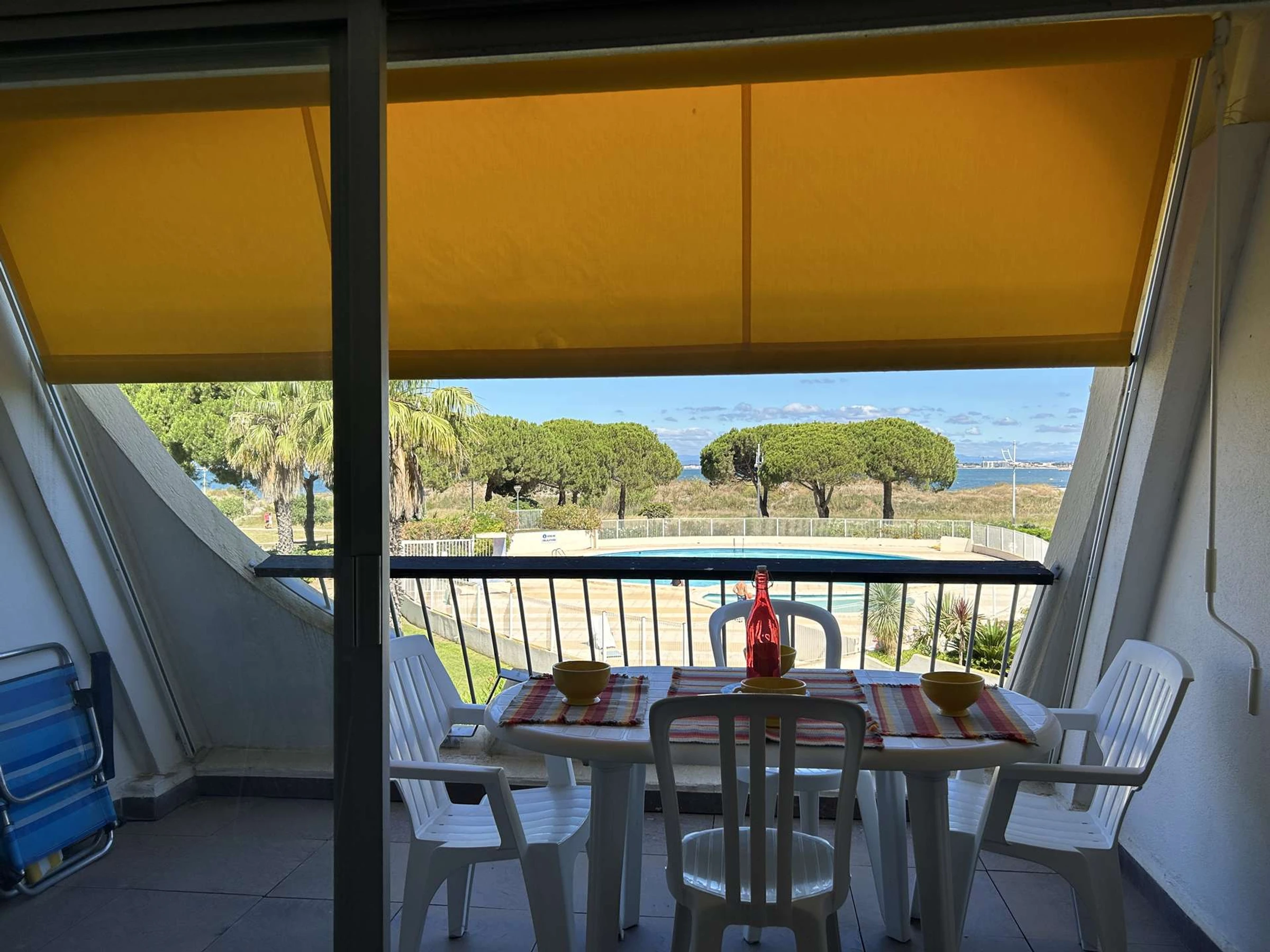 Alojamiento: Este apartamento frente al mar se encuentra en la primera planta de la residencia Escale Plage. Cuenta con un salón con sofá cama y televisor, una cocina nueva y bien equipada con placa de cocina, un amplio frigorífico-congelador y un horno combinado. Un baño con bañera, lavabo e inodoro. Una terraza con sombrilla con vistas a la piscina y al mar.