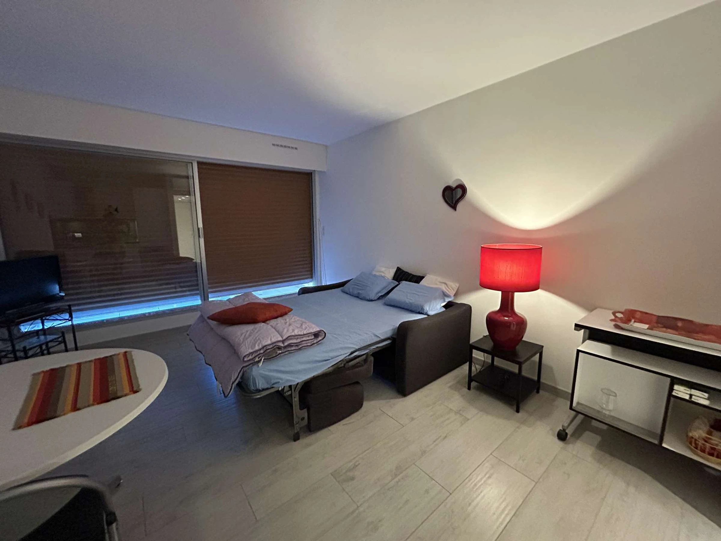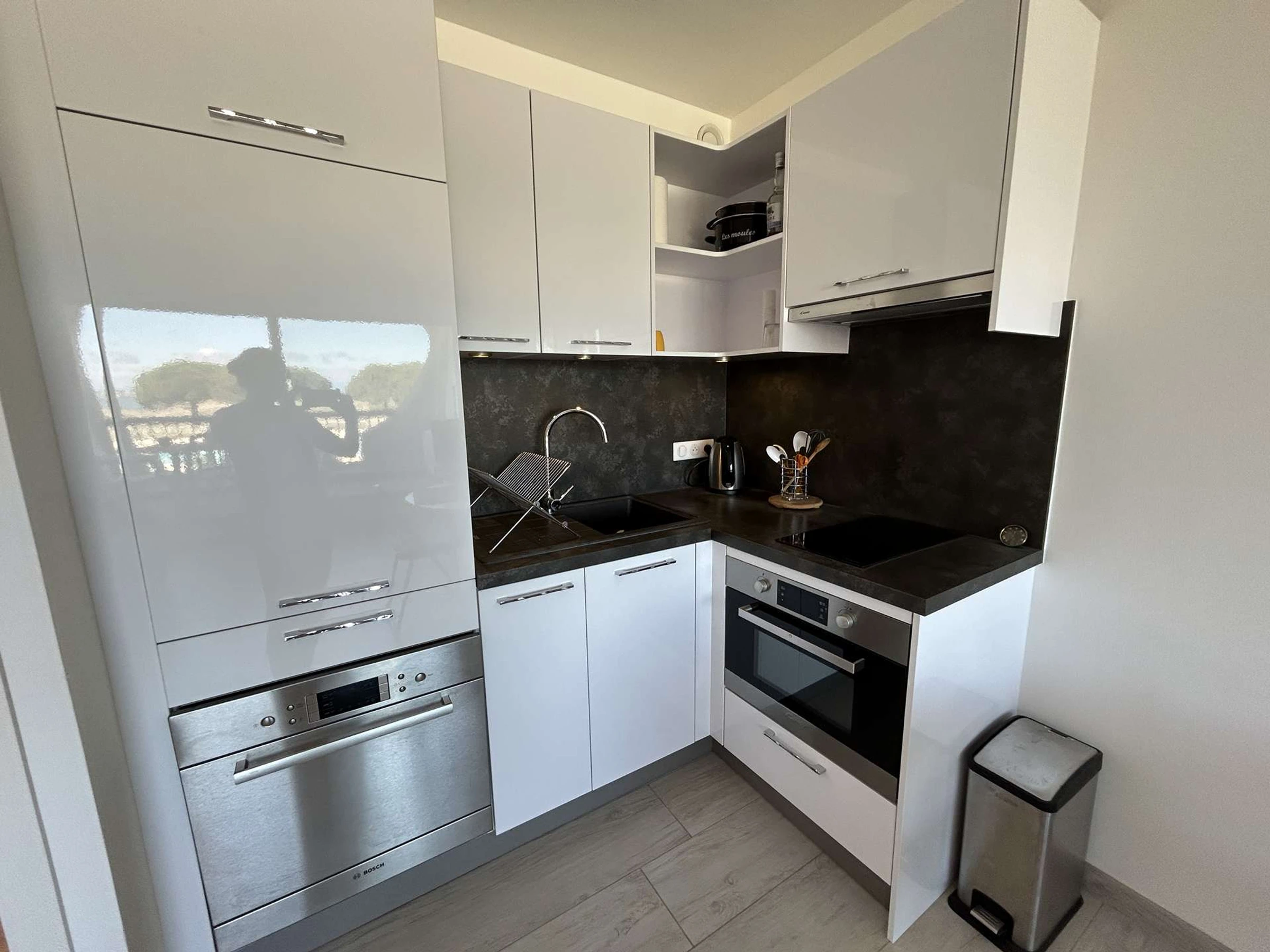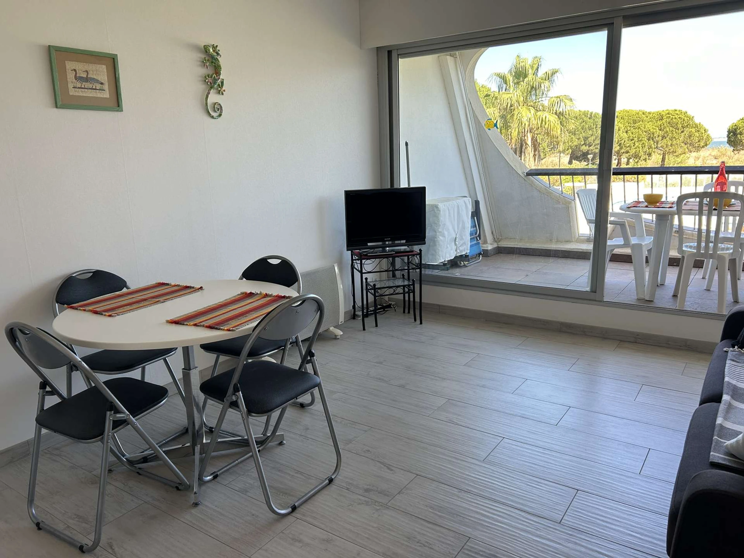 Alojamiento: Este apartamento frente al mar se encuentra en la primera planta de la residencia Escale Plage. Cuenta con un salón con sofá cama y televisor, una cocina nueva y bien equipada con placa de cocina, un amplio frigorífico-congelador y un horno combinado. Un baño con bañera, lavabo e inodoro. Una terraza con sombrilla con vistas a la piscina y al mar.