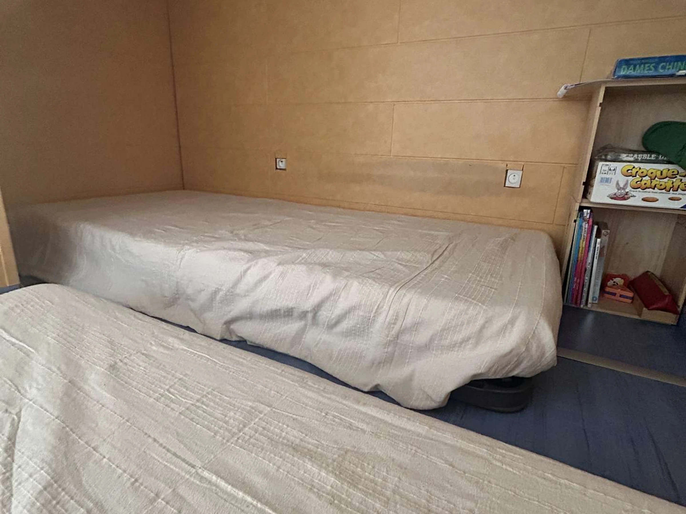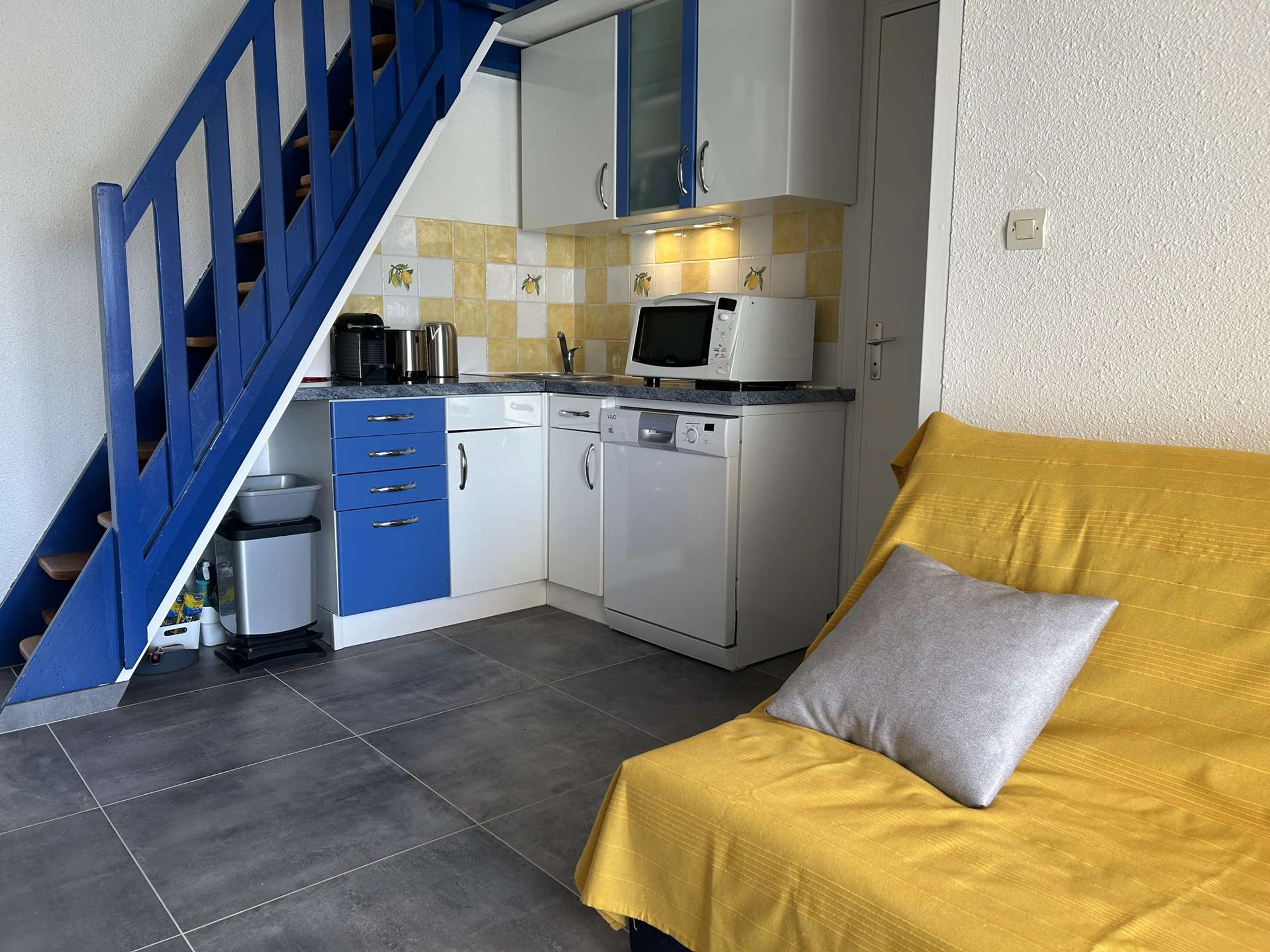 El alojamiento: Esta residencia se encuentra a 200 metros de la playa, con acceso al centro del pueblo a través del paseo marítimo. El apartamento está totalmente equipado para cuatro personas y cuenta con la siguiente distribución para dormir: una entreplanta con dos camas individuales (90 cm) aptas para niños de hasta 12 años; un dormitorio con una cama doble (140 cm) y espacio de almacenamiento. La cocina americana está bien equipada con lavavajillas, una placa eléctrica portátil que se puede instalar en la terraza y una plancha eléctrica grande.