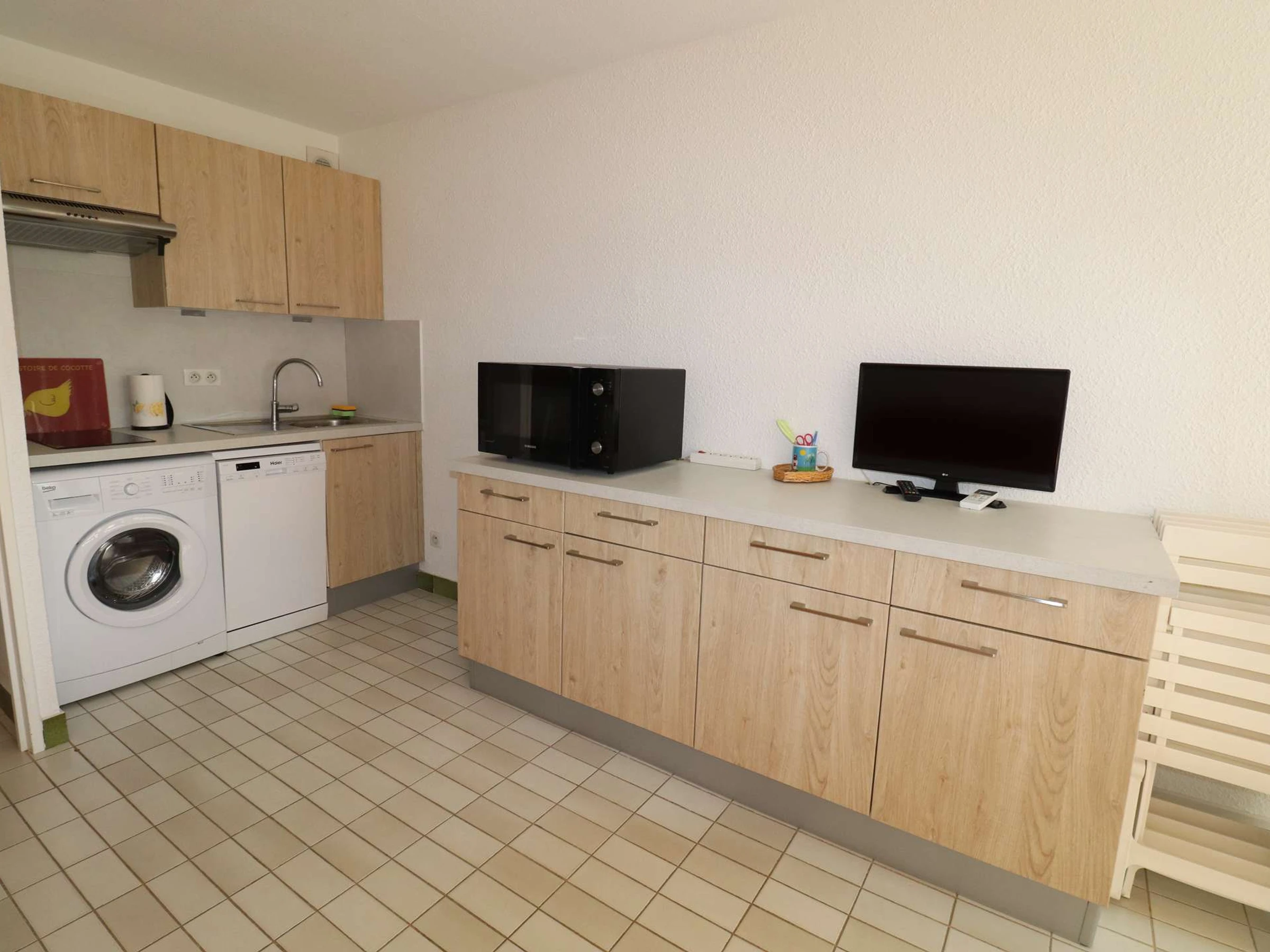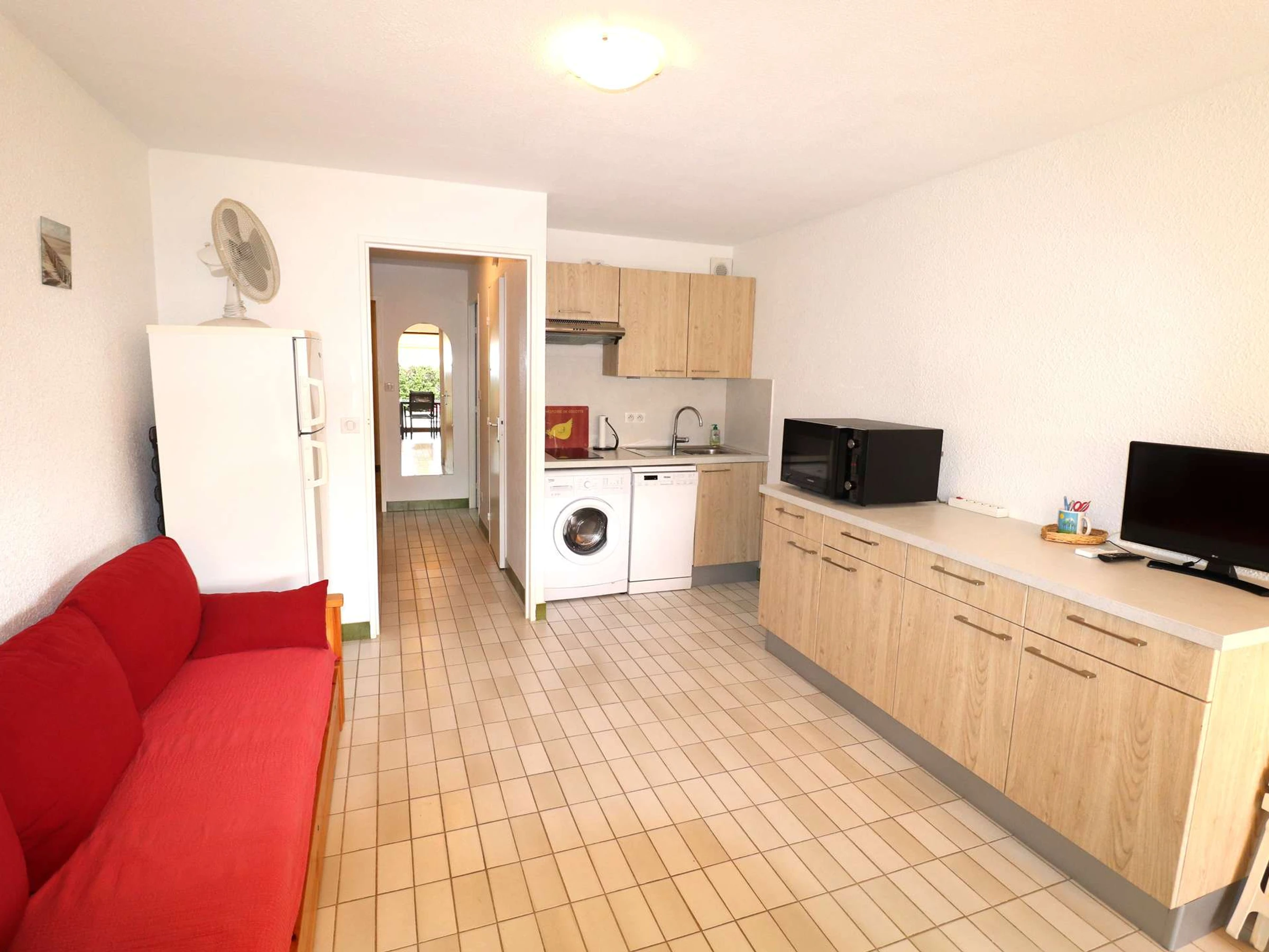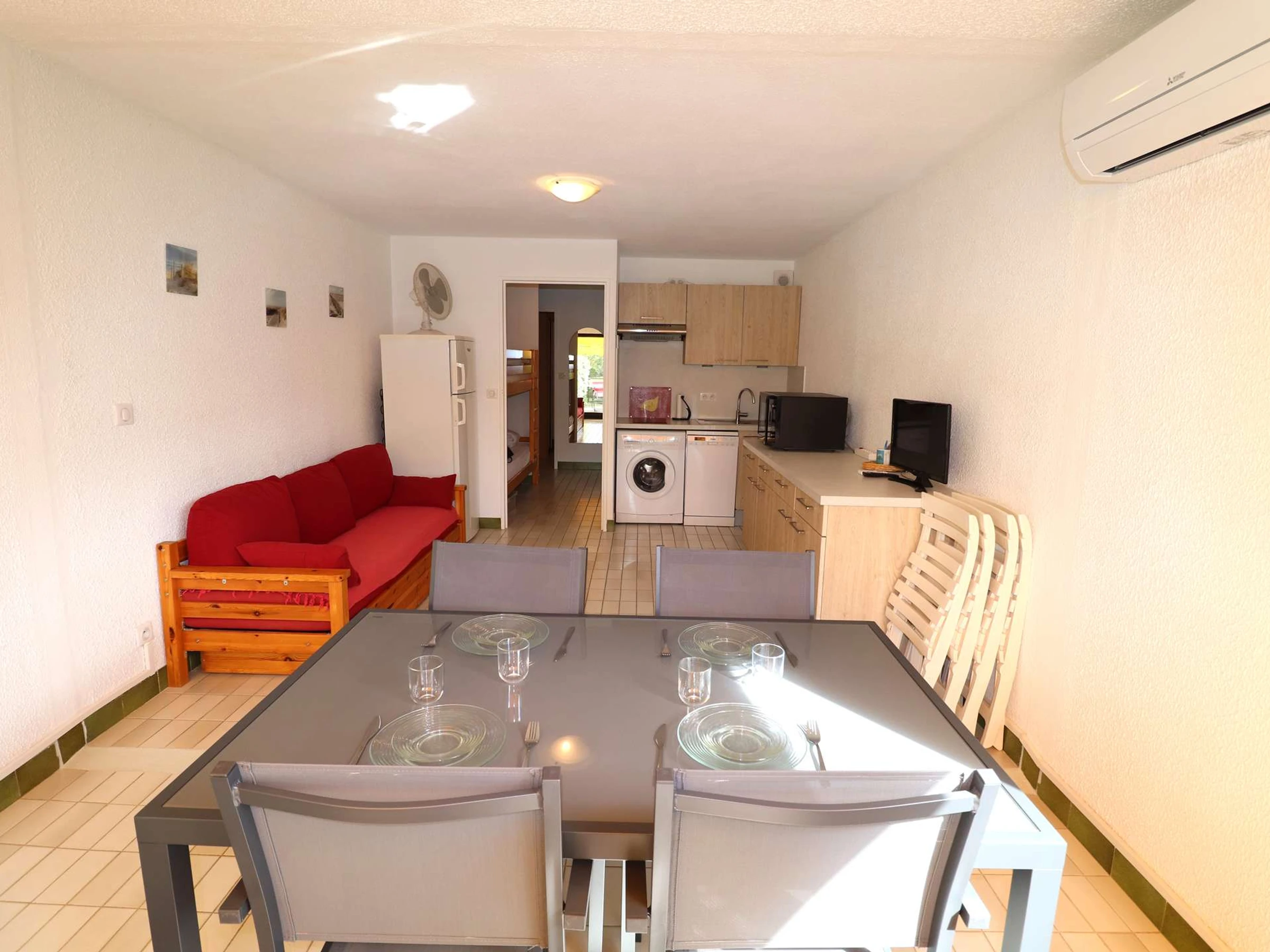 Entrada con cabina, literas, baño con ducha y WC separado, dormitorio para 2 personas. Cocina americana equipada con lavadora – lavavajillas. Su salón tiene vistas a los jardines de la residencia. Aparcamiento privado.