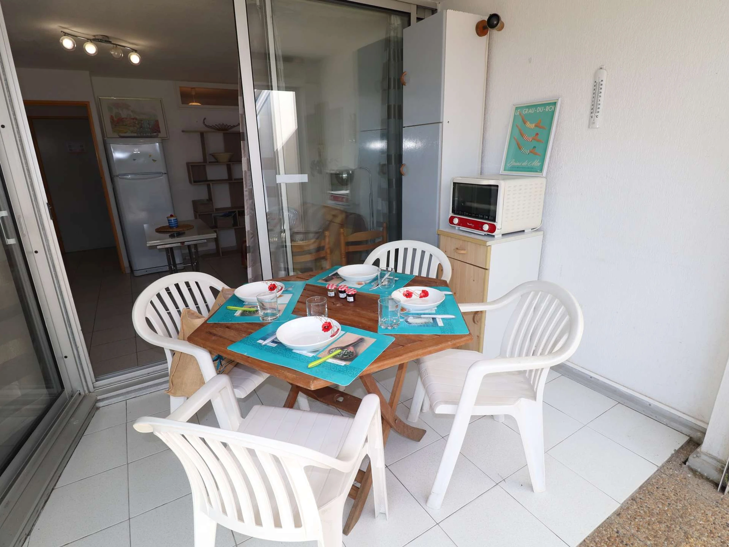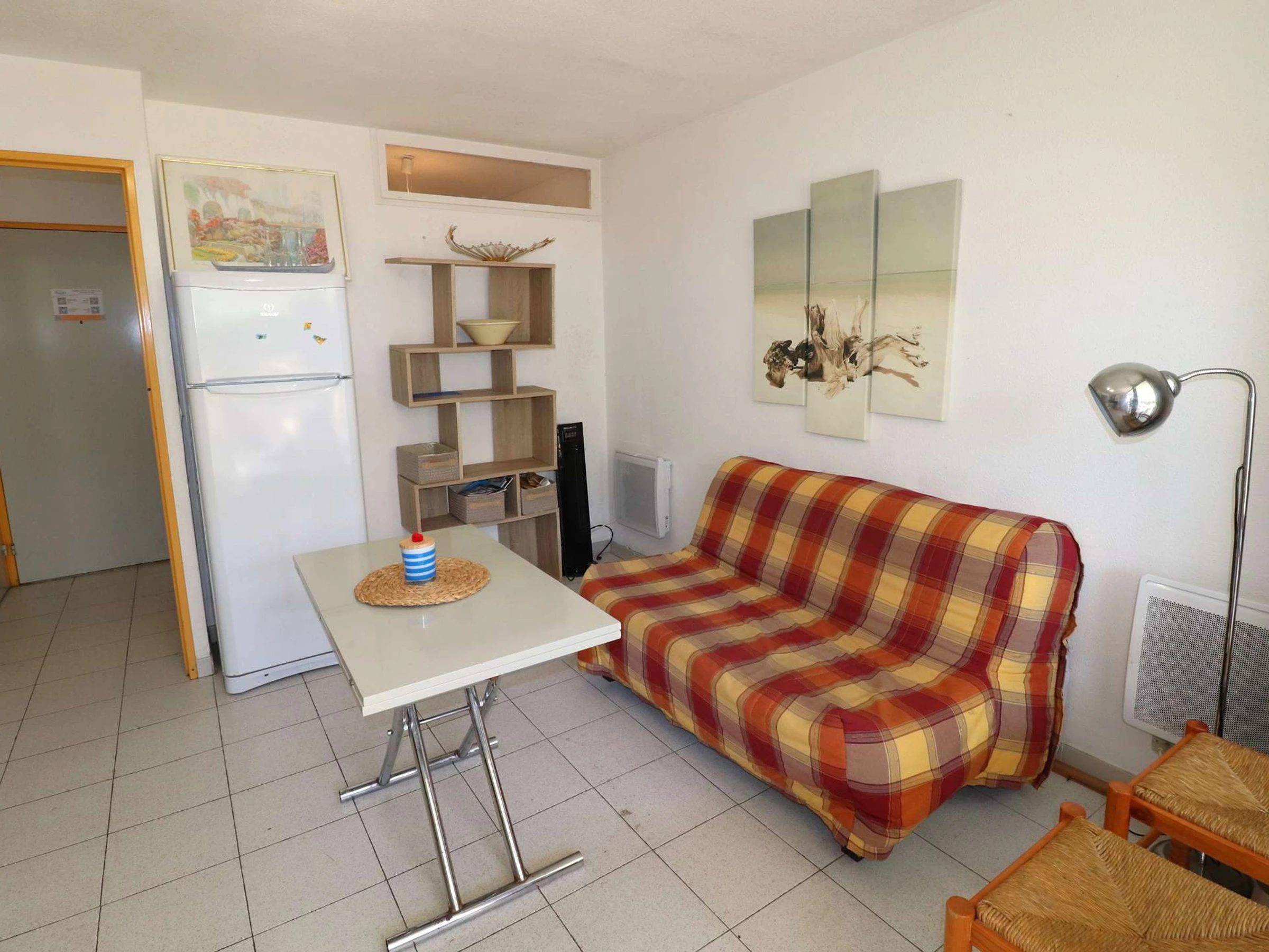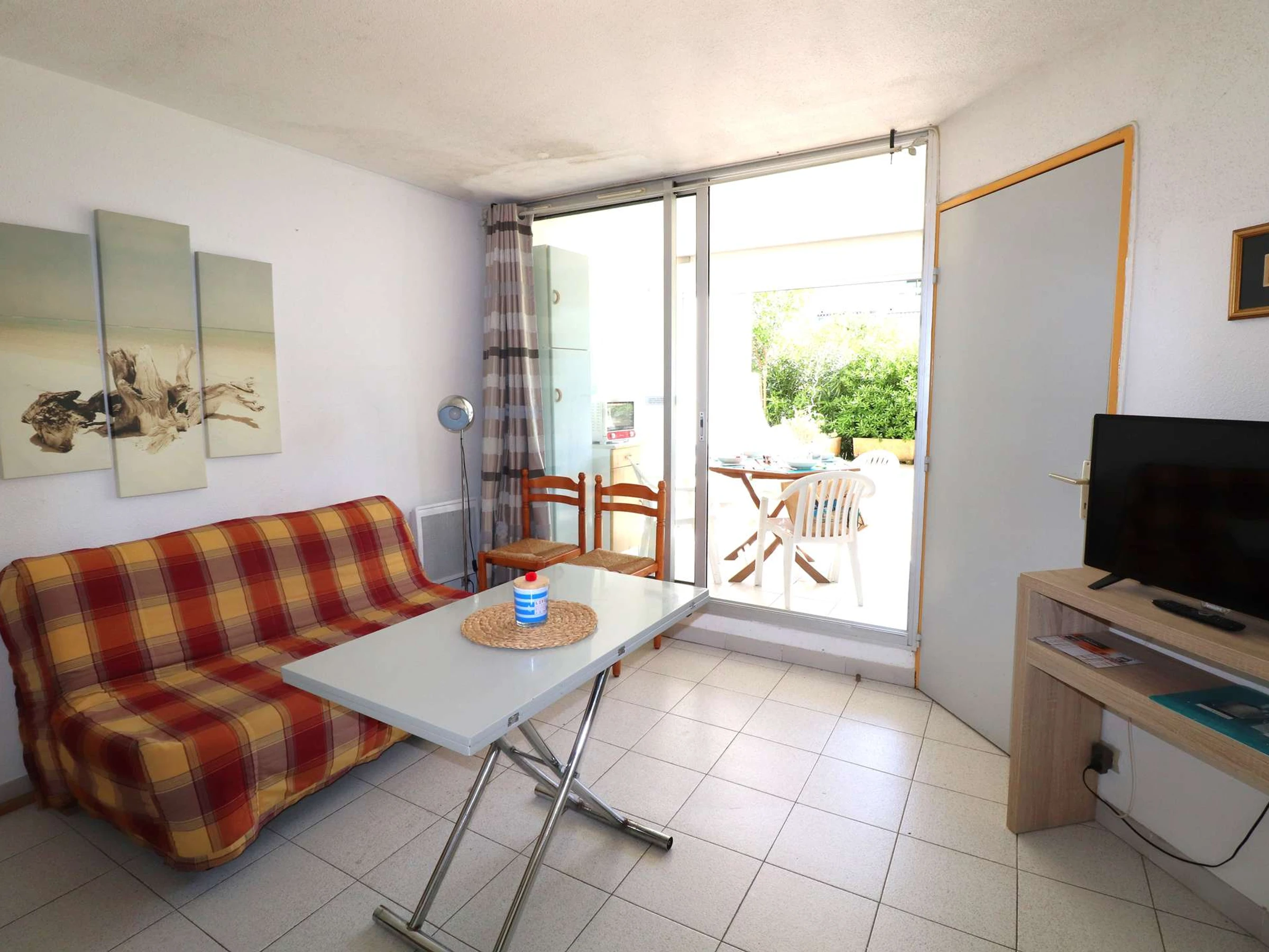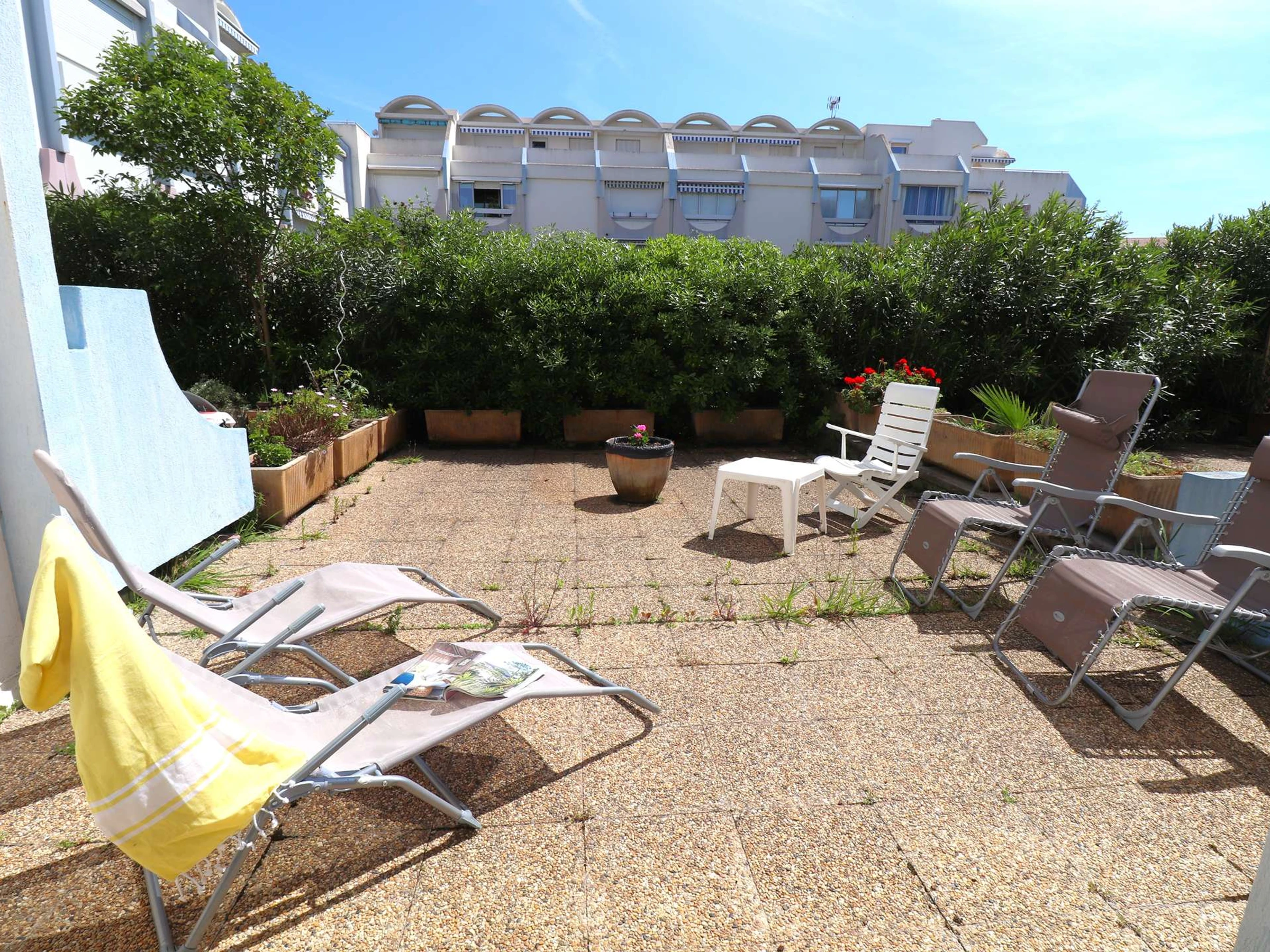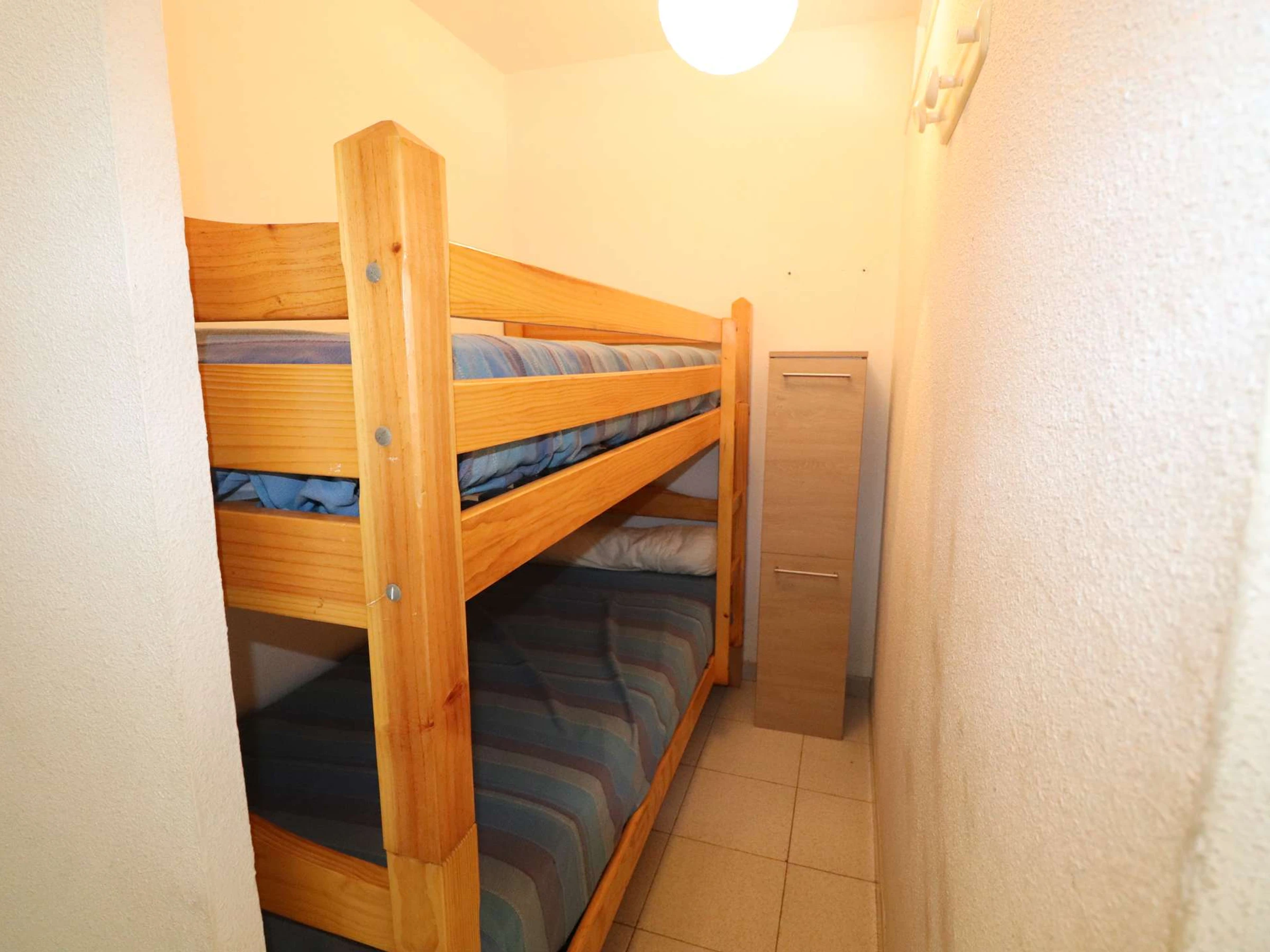 Residencia FLORALIES 2 - Apartamento cabaña de 2 habitaciones, reformado, con todas las comodidades, situado en la planta baja con una gran terraza de 25m² con vistas a los espacios verdes. Incluye entrada a cabina independiente con 2 literas, [hidden] cuarto de ducha, salón / cocina equipada, dormitorio con armario, cama doble, el salón y el dormitorio tienen un ventanal que da a la logia + la terraza. 2 piscinas, guardería, bolera. La playa está a 400M, las tiendas a 20M.