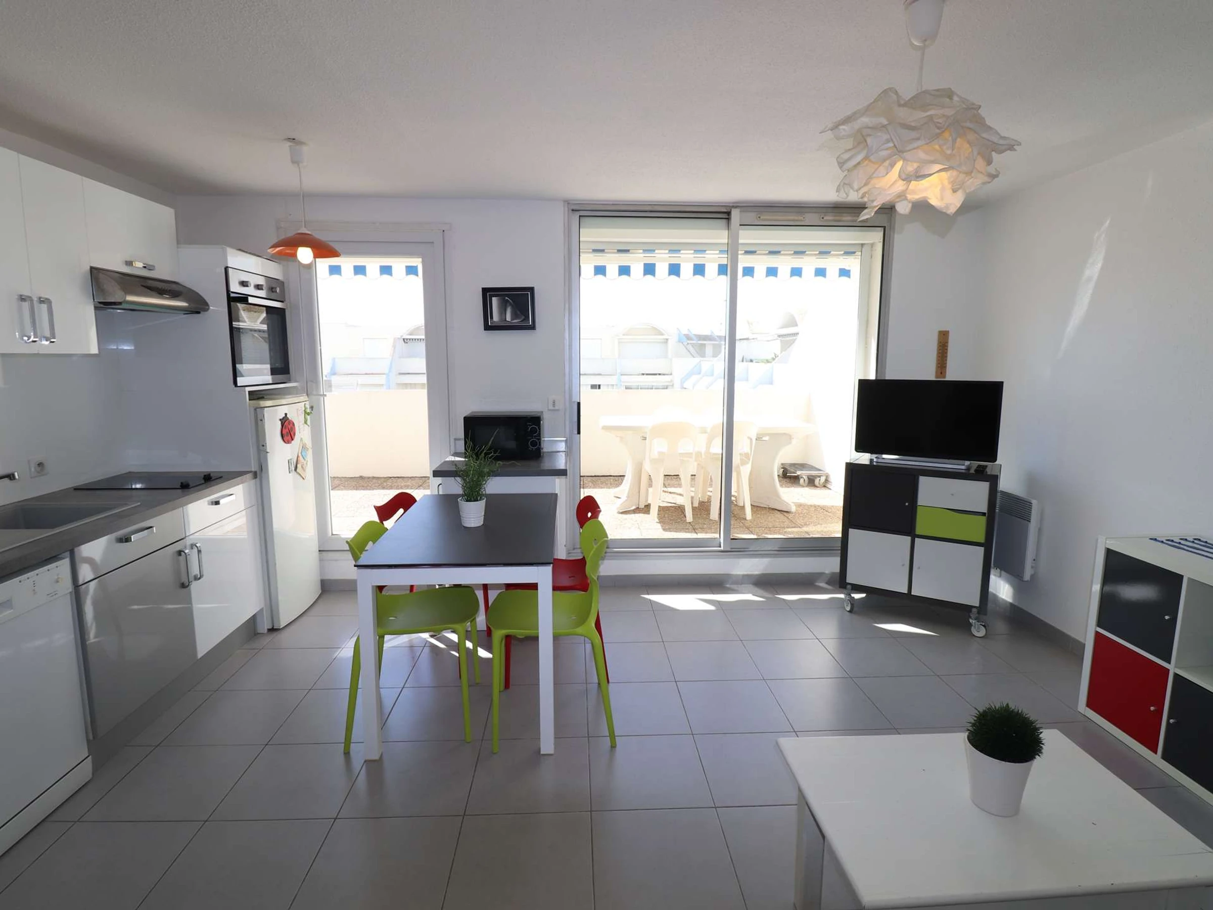 Incluye salón con cocina equipada con lavavajillas, lavadora, horno y microondas. Cuarto de baño con ducha a ras de suelo, WC separado, un dormitorio con cama doble, un dormitorio con 2 camas individuales en una residencia de lujo con piscinas, pista de petanca y zona de juegos infantiles.
