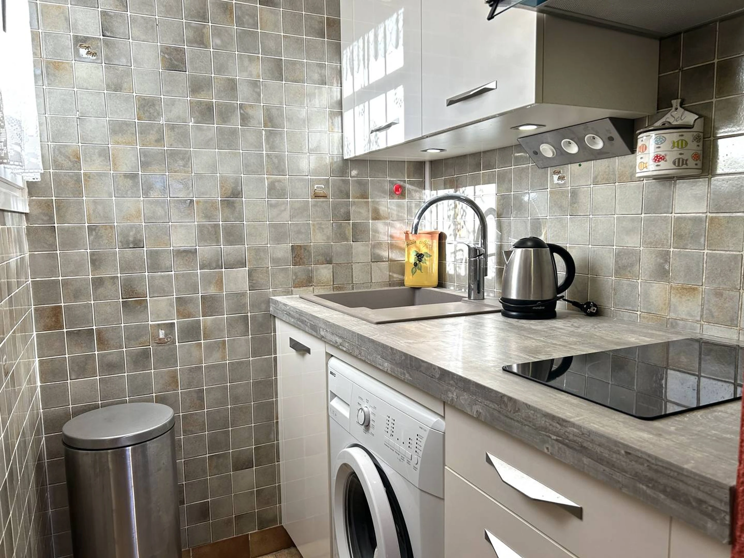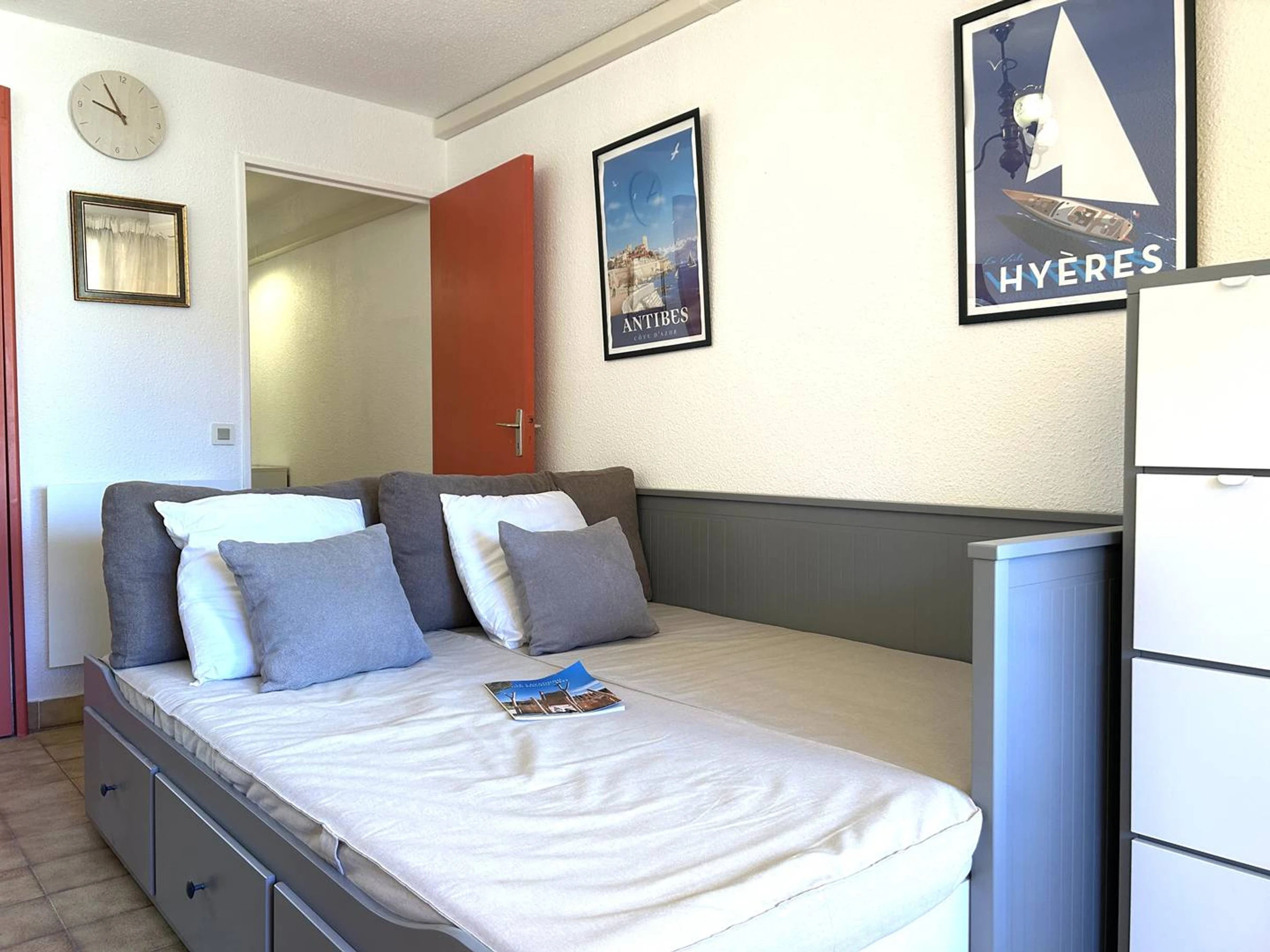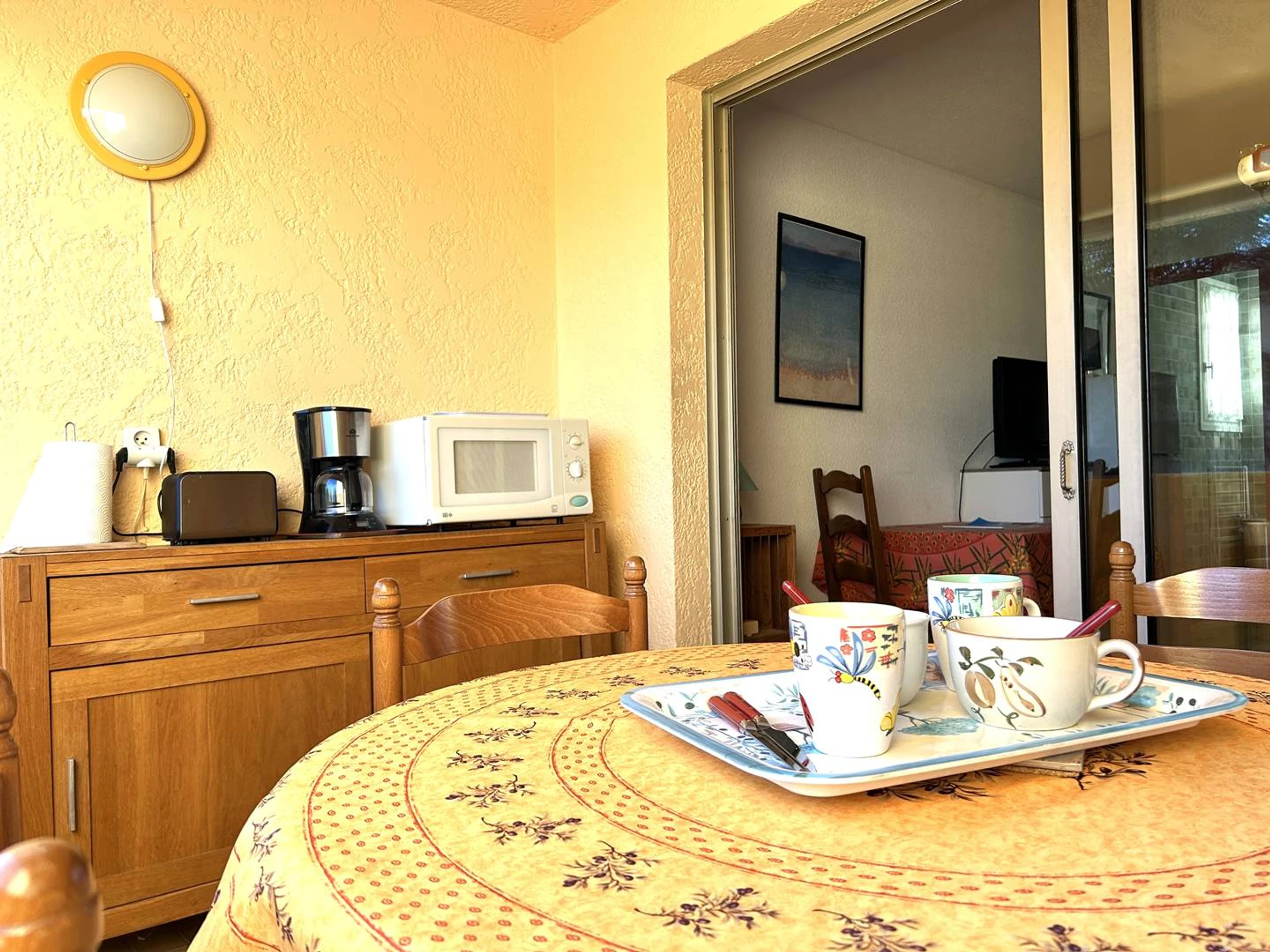 Este apartamento, situado en una zona tranquila, se encuentra en la primera planta de una pequeña residencia. El alquiler incluye una cocina americana totalmente equipada, un salón con aire acondicionado y sofá cama de 160 cm, un cuarto de baño con ducha y aseo independiente, un dormitorio con aire acondicionado y cama de 140 cm, y una terraza con toldo transparente que permite disfrutar de vistas al mar incluso en días de viento.