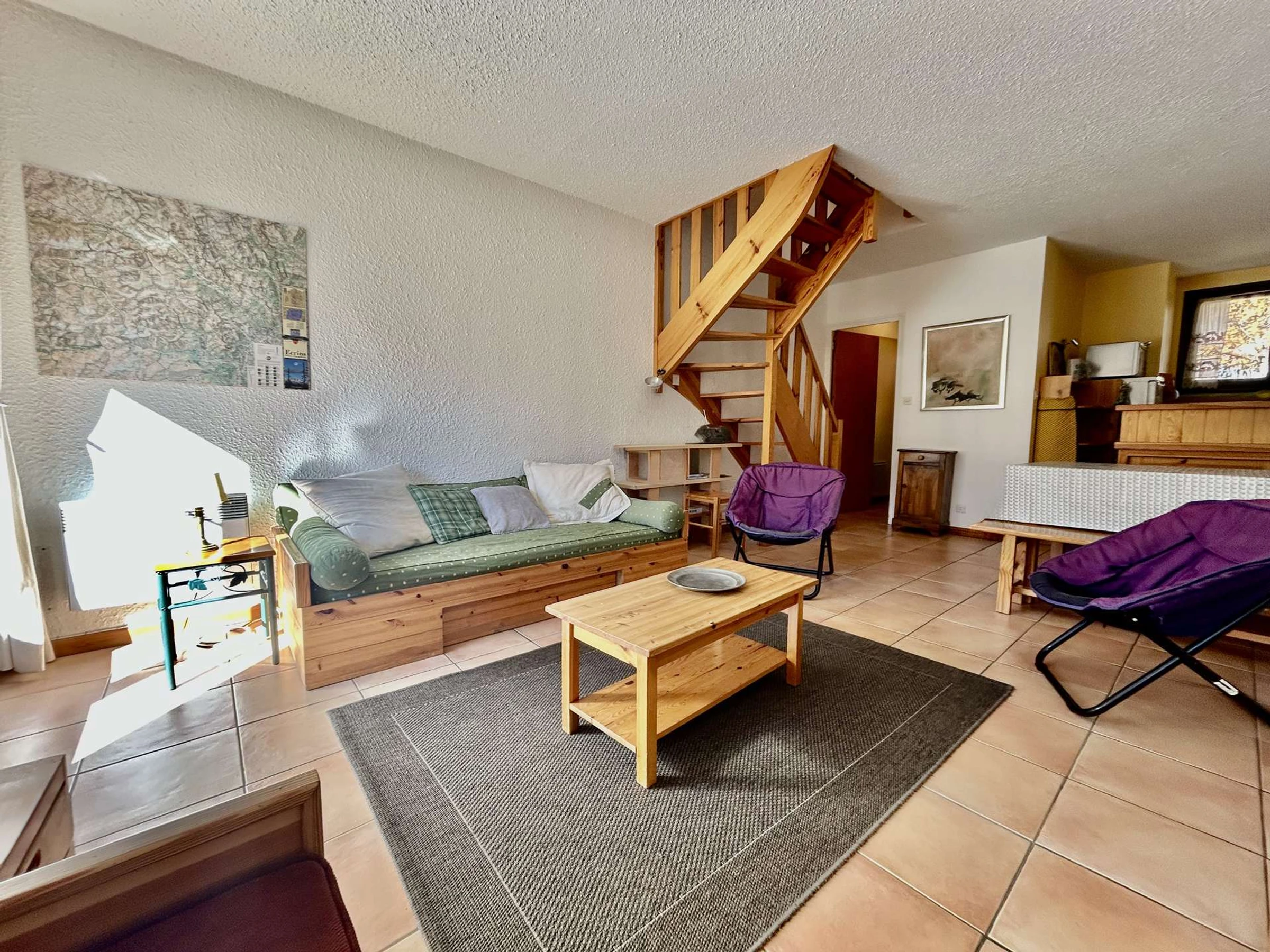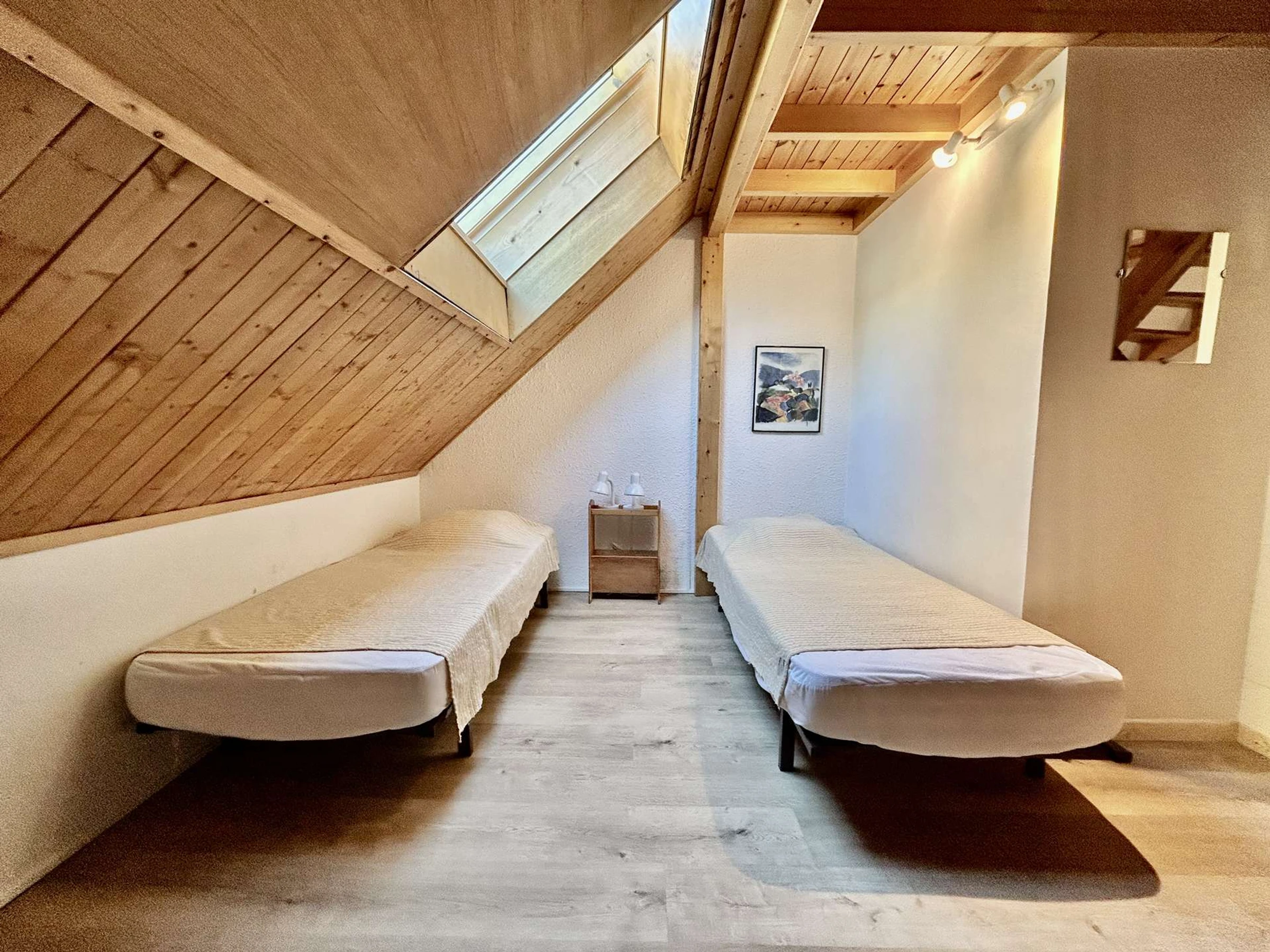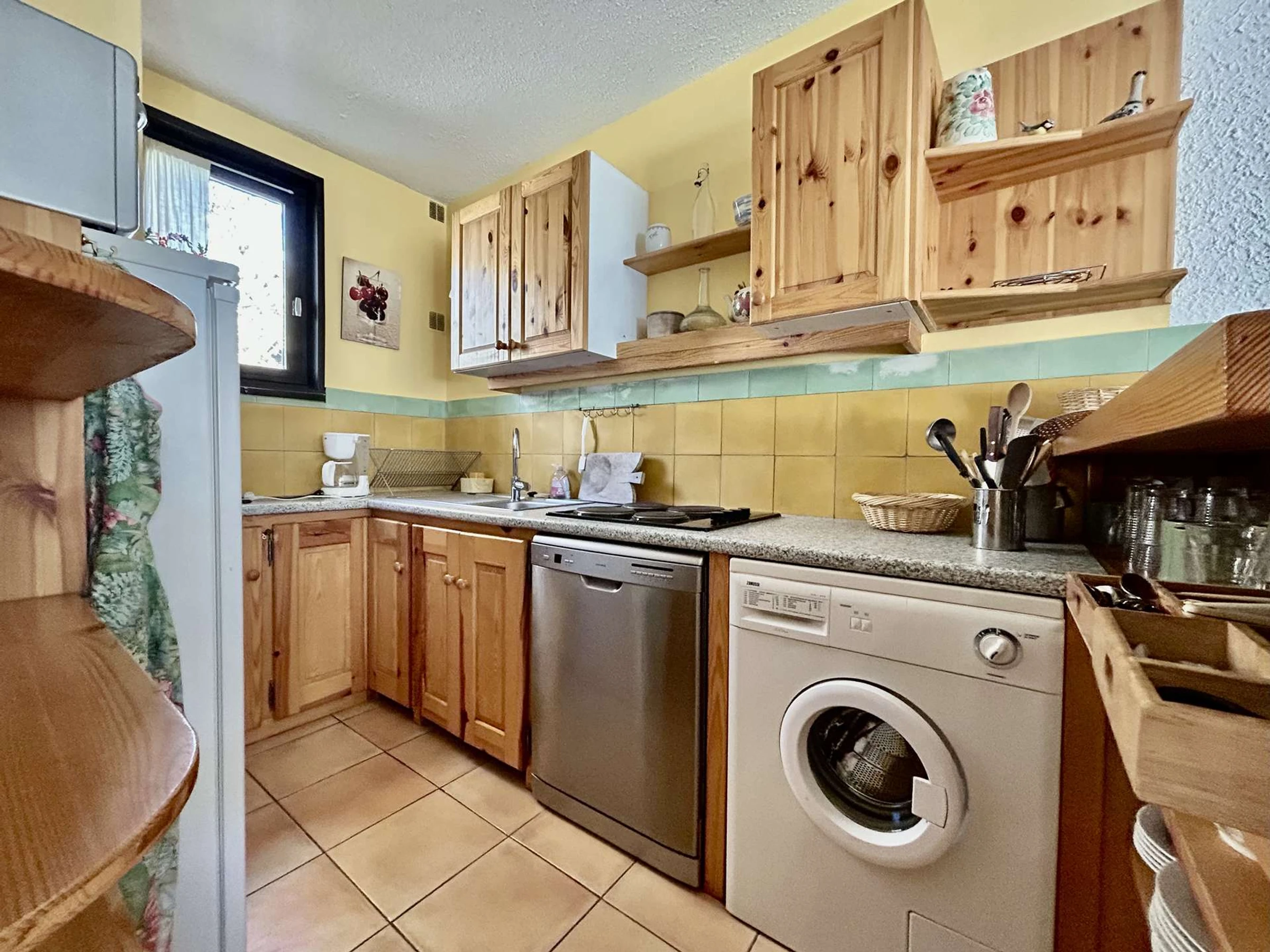 Este apartamento de tres habitaciones se distribuye de la siguiente manera: un dormitorio en la planta superior con una cama doble, un segundo dormitorio con dos camas individuales, un ático reformado con dos colchones y lavabo, un salón con balcón y dos sofás cama individuales, una cocina americana totalmente equipada (lavavajillas, lavadora, horno), un baño con inodoro en la planta superior y un aseo independiente.