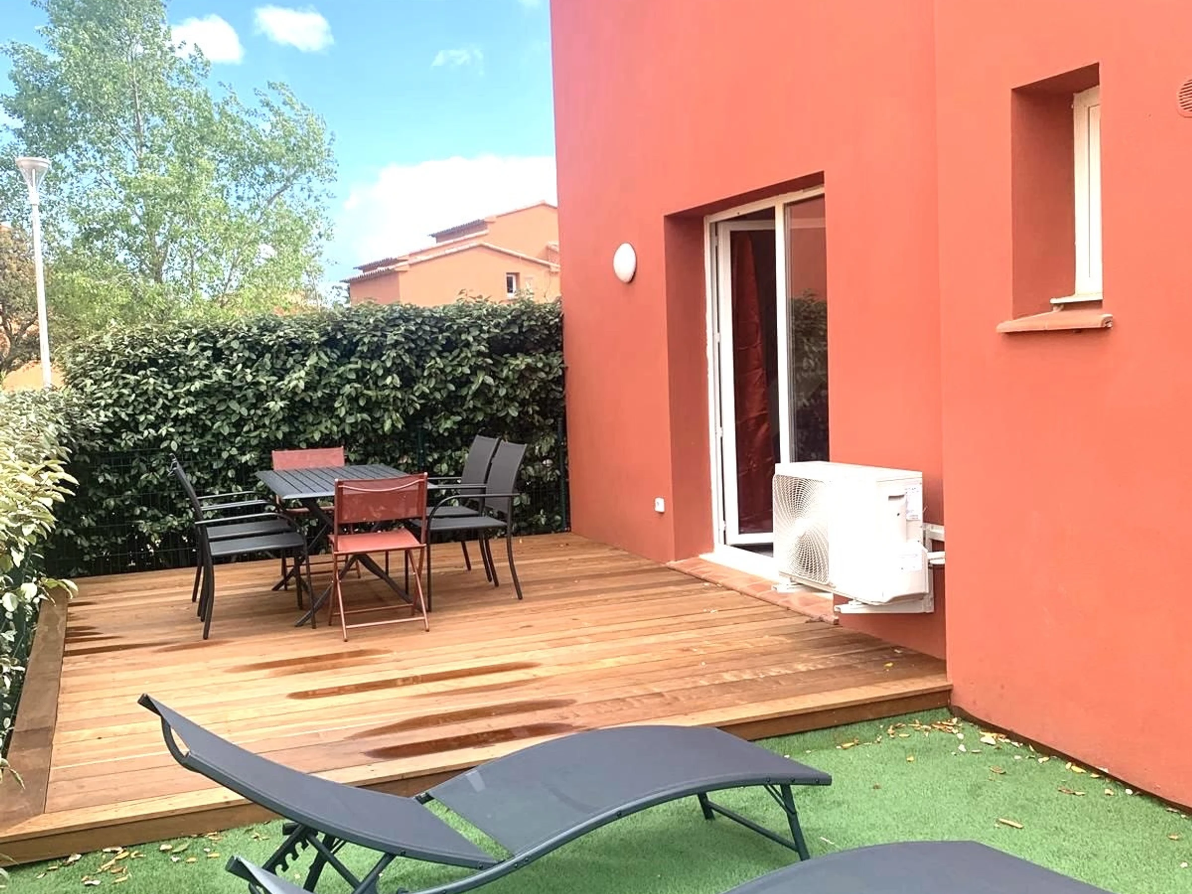 Dispone de jardín, mobiliario jardín, 10 m² de terraza, acceso internet (wifi), secador, calefacción radiadores eléctricos, aire acondicionado, piscina comunitaria, parking aire libre en edificio cercano, 1 Televisor.