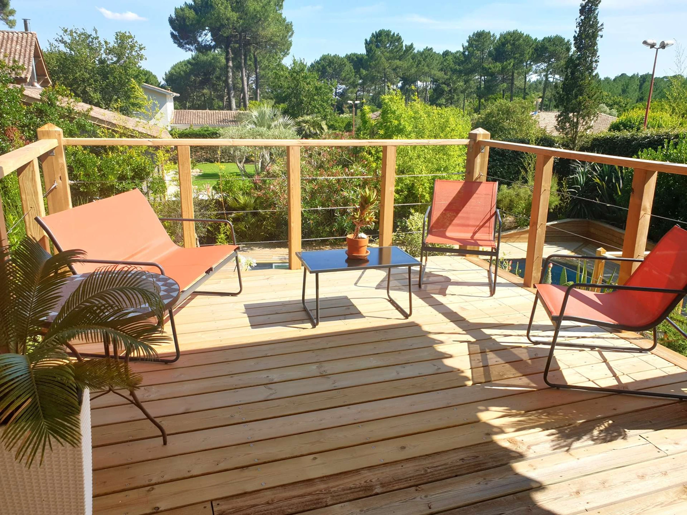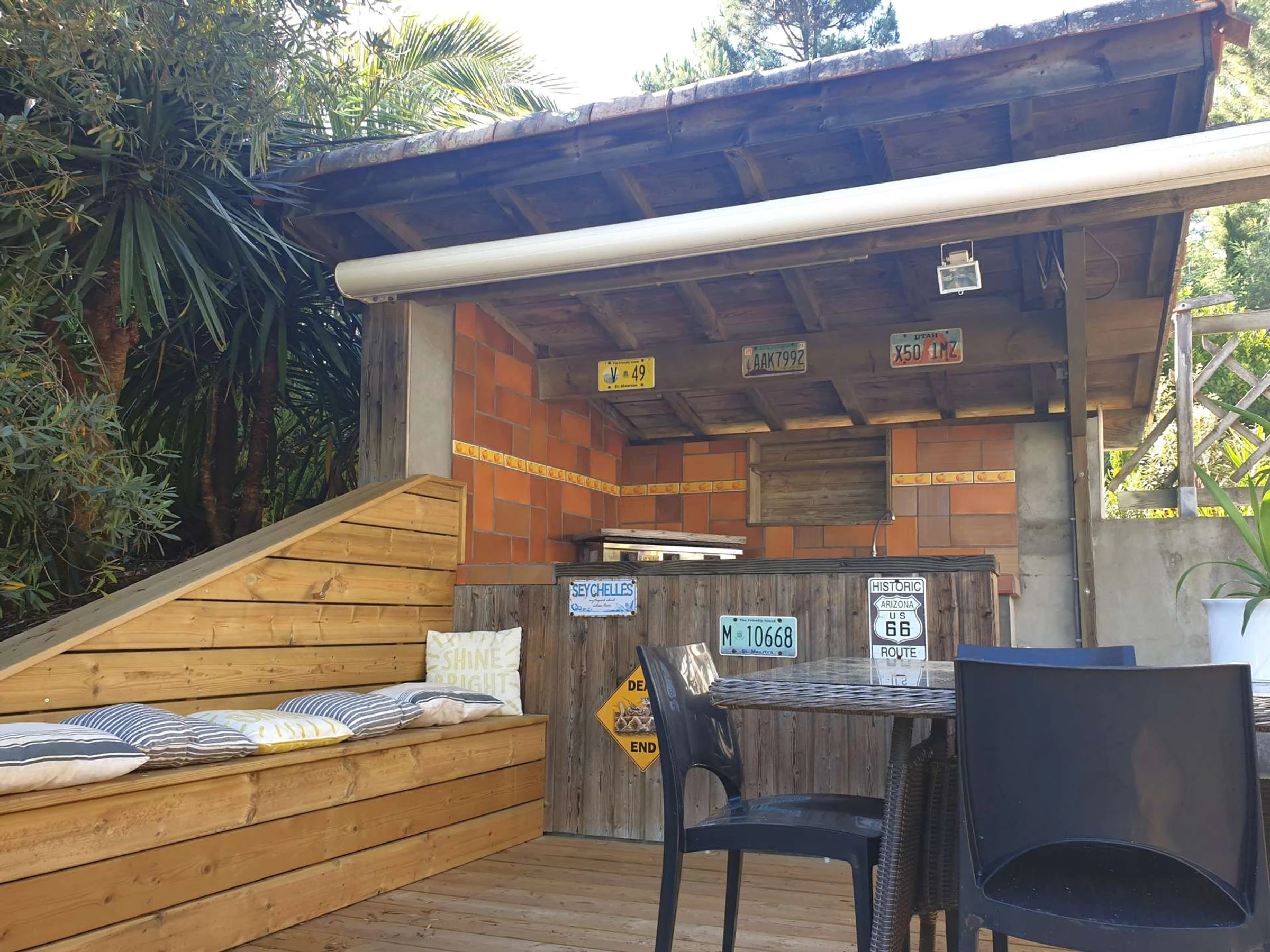 En un agradable jardín cerrado de 1.220 m² de vegetación con su piscina, su ducha exterior y varias cómodas terrazas de madera le esperan, ideales para momentos de convivencia, desayunos en familia o con amigos, o para veladas gourmet alrededor de la plancha instalada en la cocina de verano.