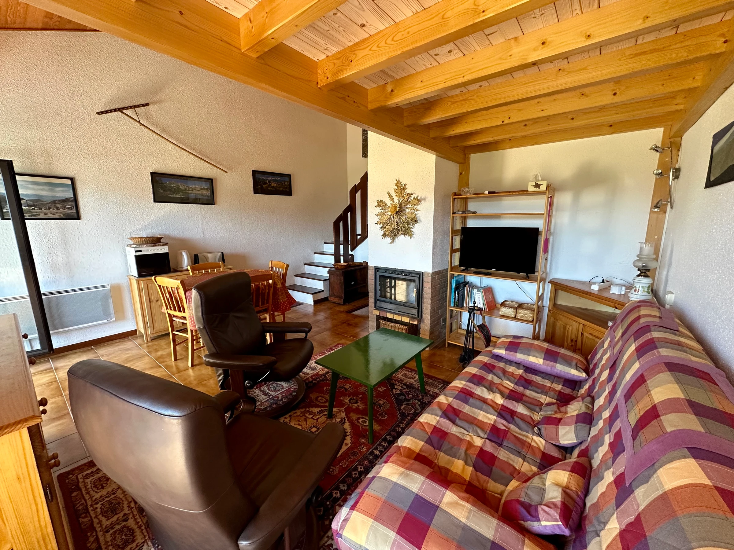 El luminoso salón ofrece un comedor, una acogedora sala de estar con chimenea (leña no incluida) y da acceso a una terraza con una vista impresionante del lago Matemale y la cordillera circundante.