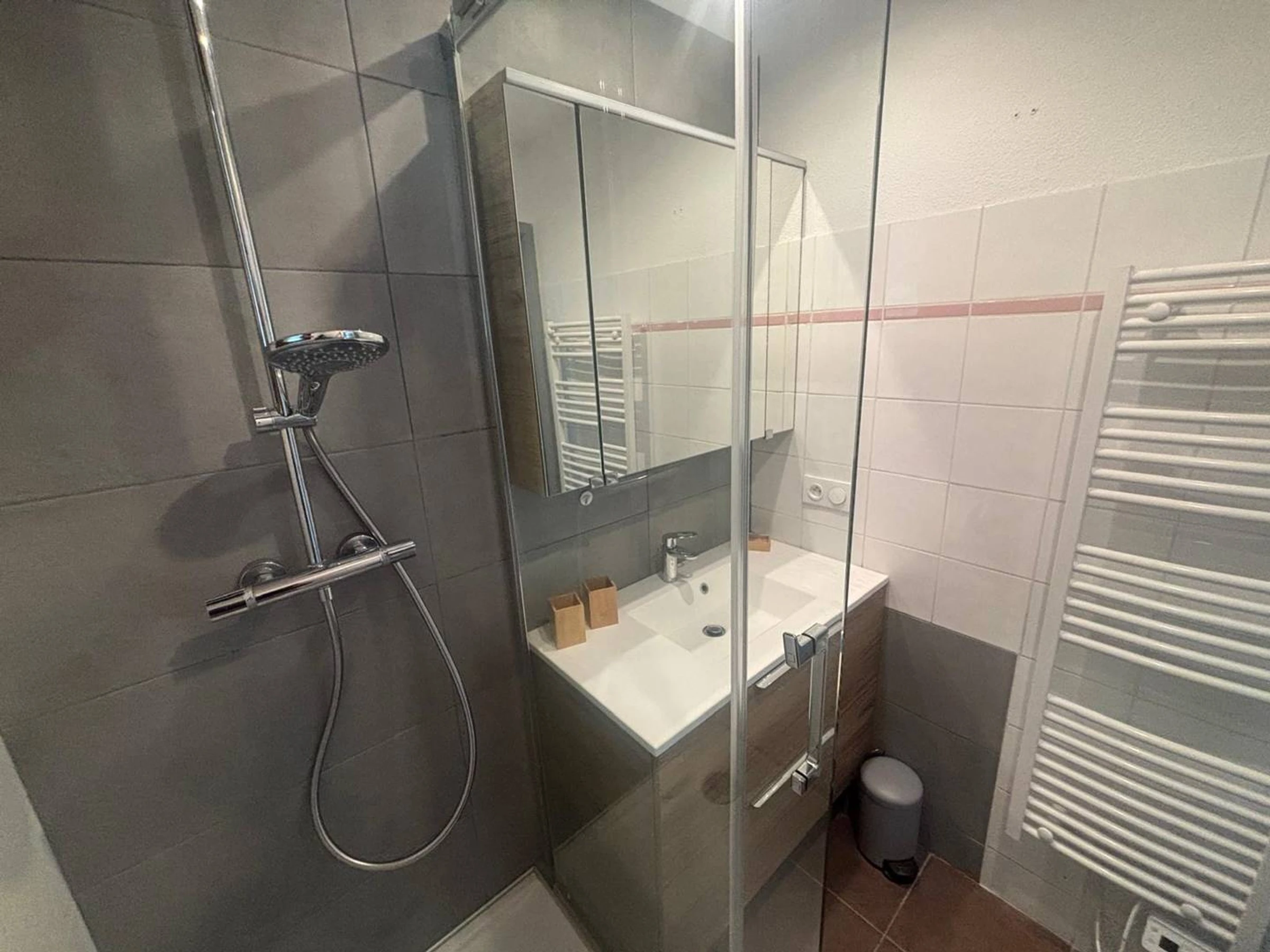 Un baño moderno con cabina de ducha y lavabo, además de un aseo independiente.