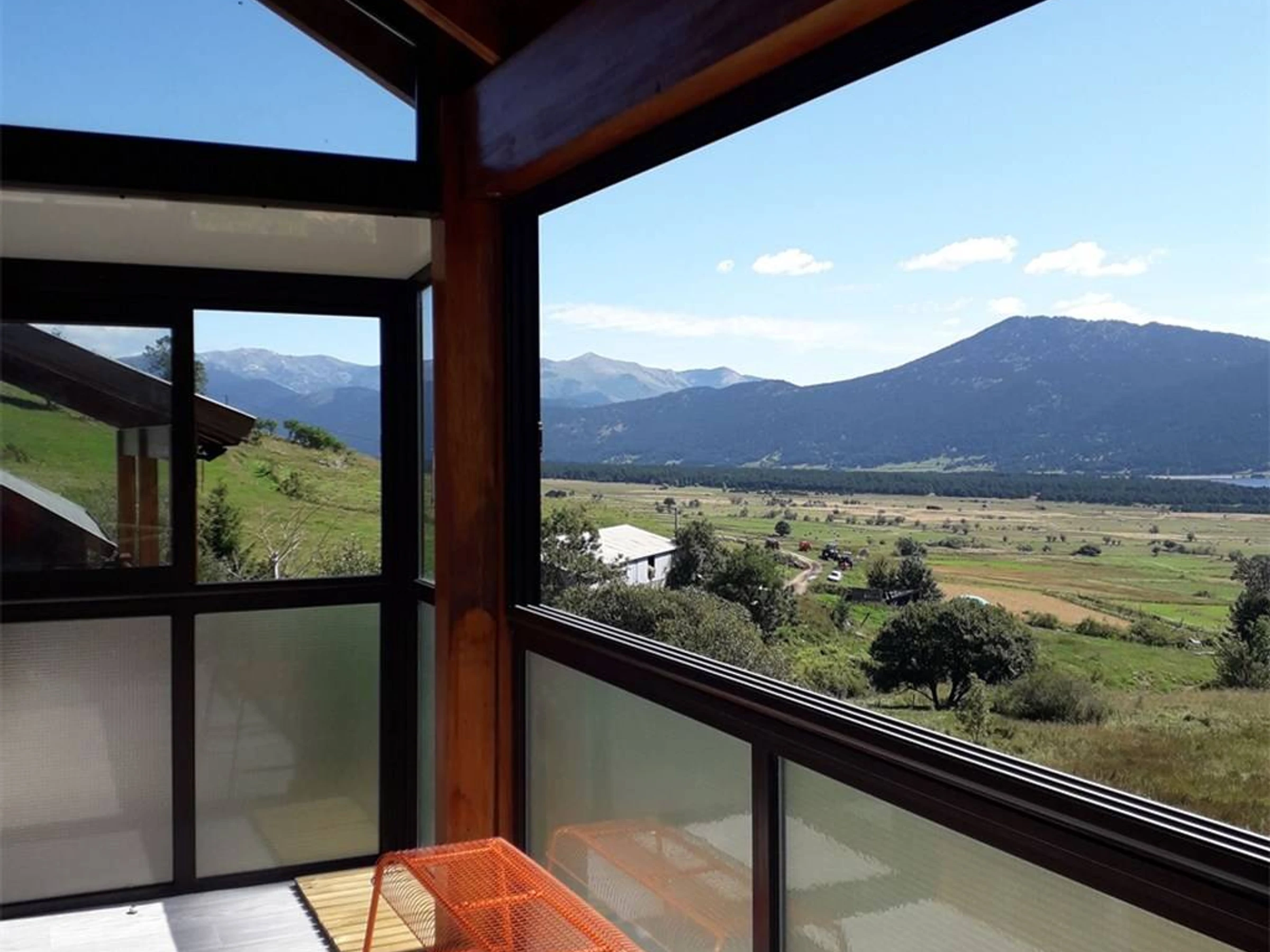 La entrada se realiza a través de la terraza acristalada con vistas panorámicas al lago y a la cordillera.