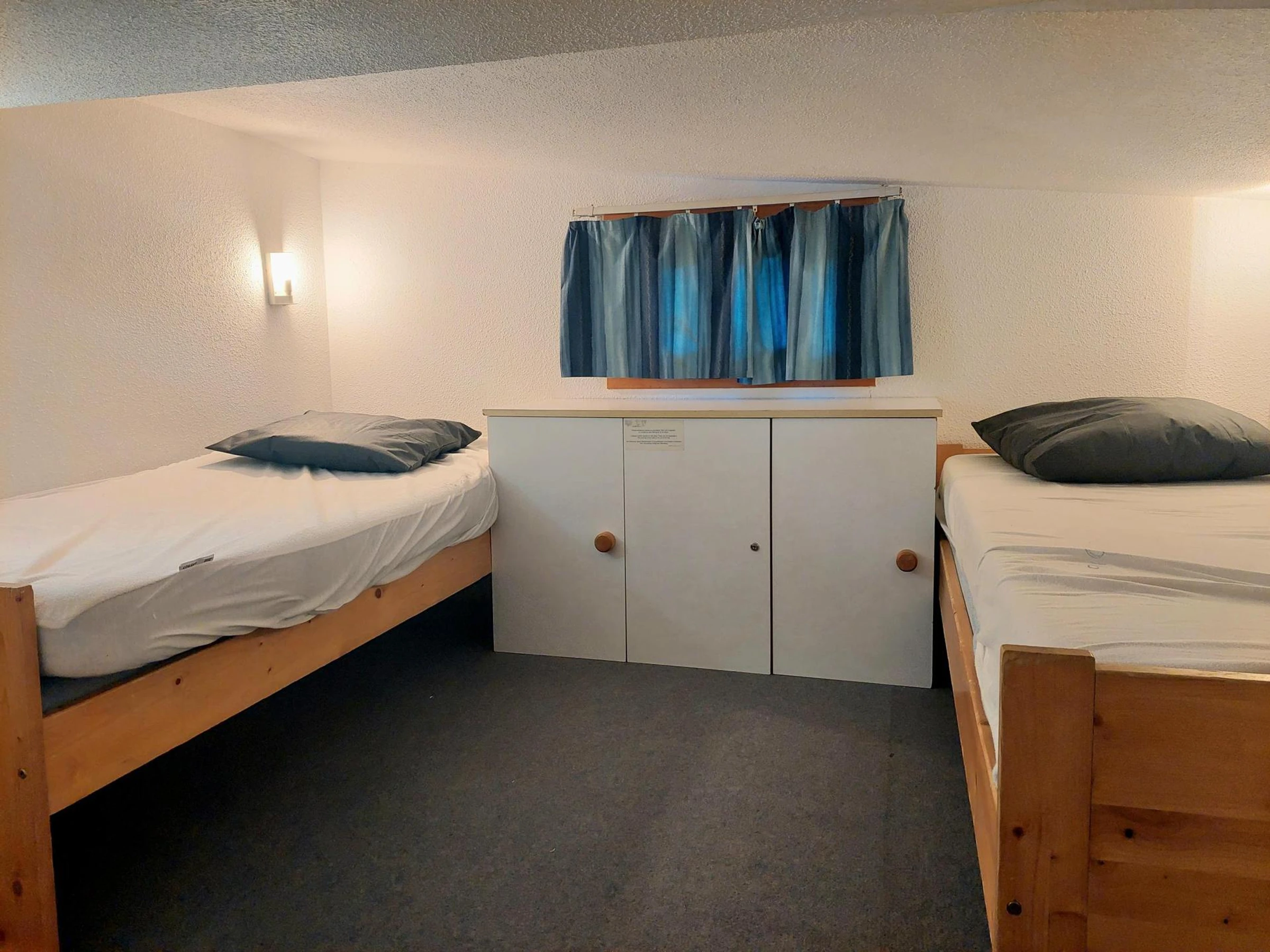 Hay un aseo independiente con lavabo y otra zona de dormitorio con vistas al salón, que se puede separar mediante una puerta corredera, y que cuenta con dos camas individuales.