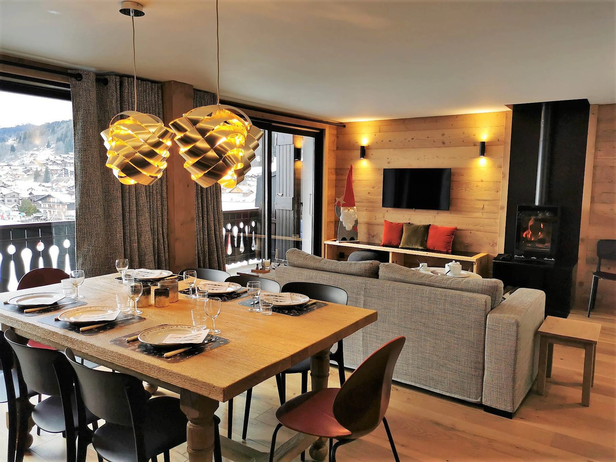 – Salón-comedor con acceso a la terraza orientada al suroeste, con estufa de leña (leña no incluida) y cocina americana equipada. – Aseo de invitados