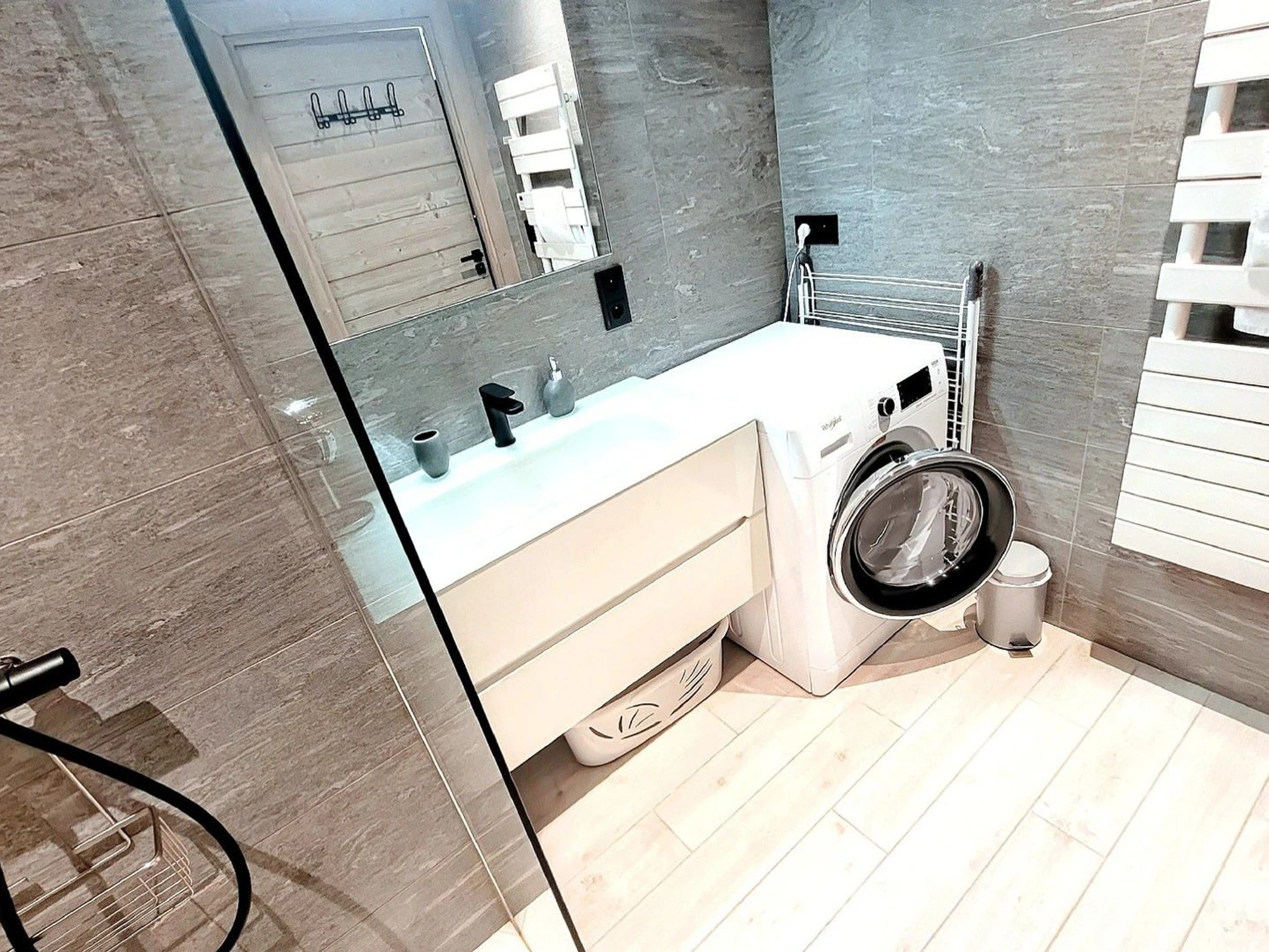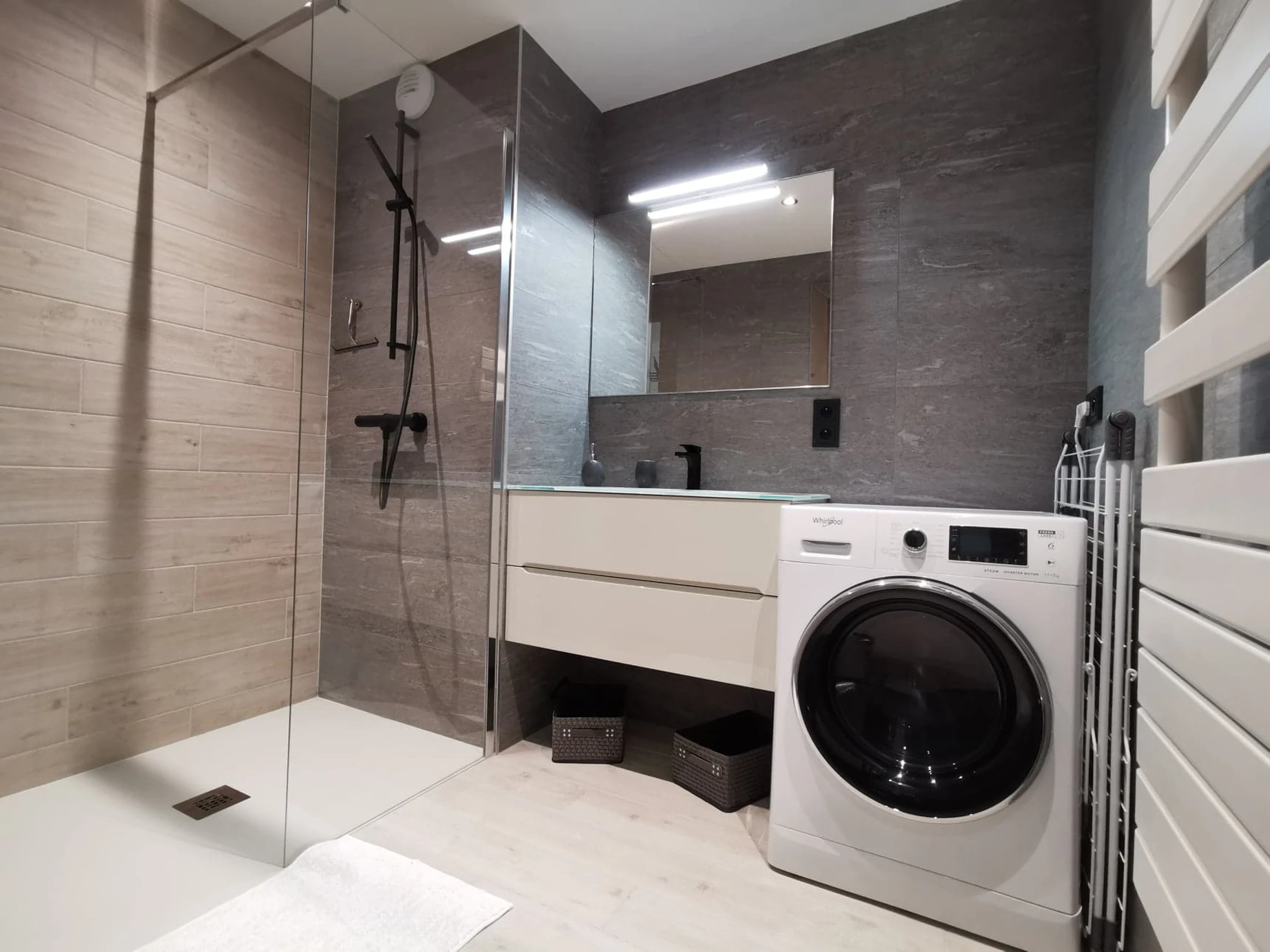 - Cuarto de ducha con lavabo, toallero, lavadora-secadora y ducha a ras de suelo