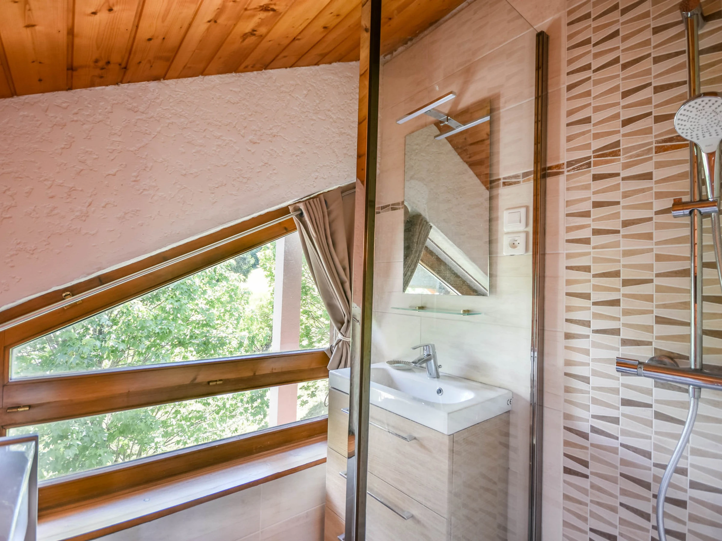 - Primer dormitorio de 12 m², 6 m² bajo buhardilla (1,80 m²) con una cama doble (160 cm y edredón) y baño con ducha y lavabo. Vistas al salón. - Segundo dormitorio de 10 m² bajo ático (a menos de 1,80 m) con 2 camas individuales (2 x 90 cm, edredón)