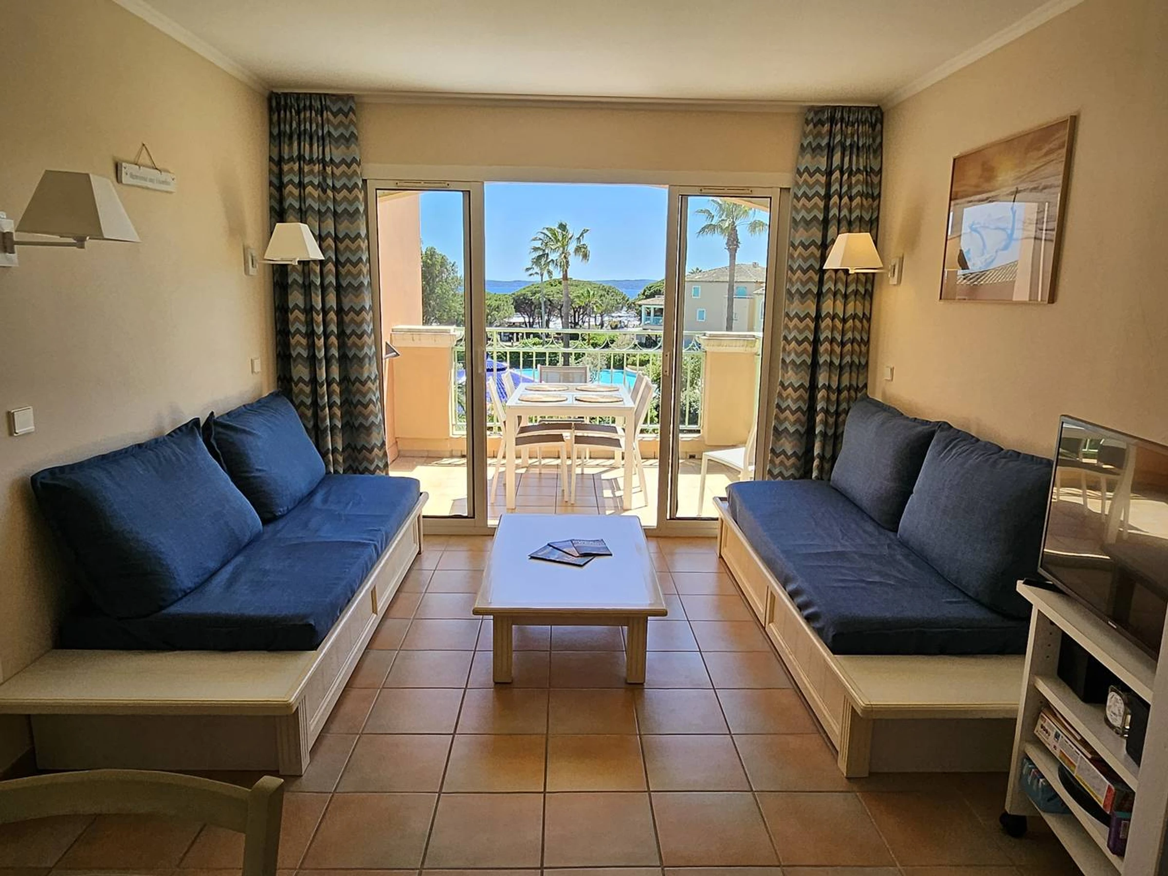 Podrás apreciar la vista al mar desde su terraza equipada con toldo. El precio varía según la temporada.