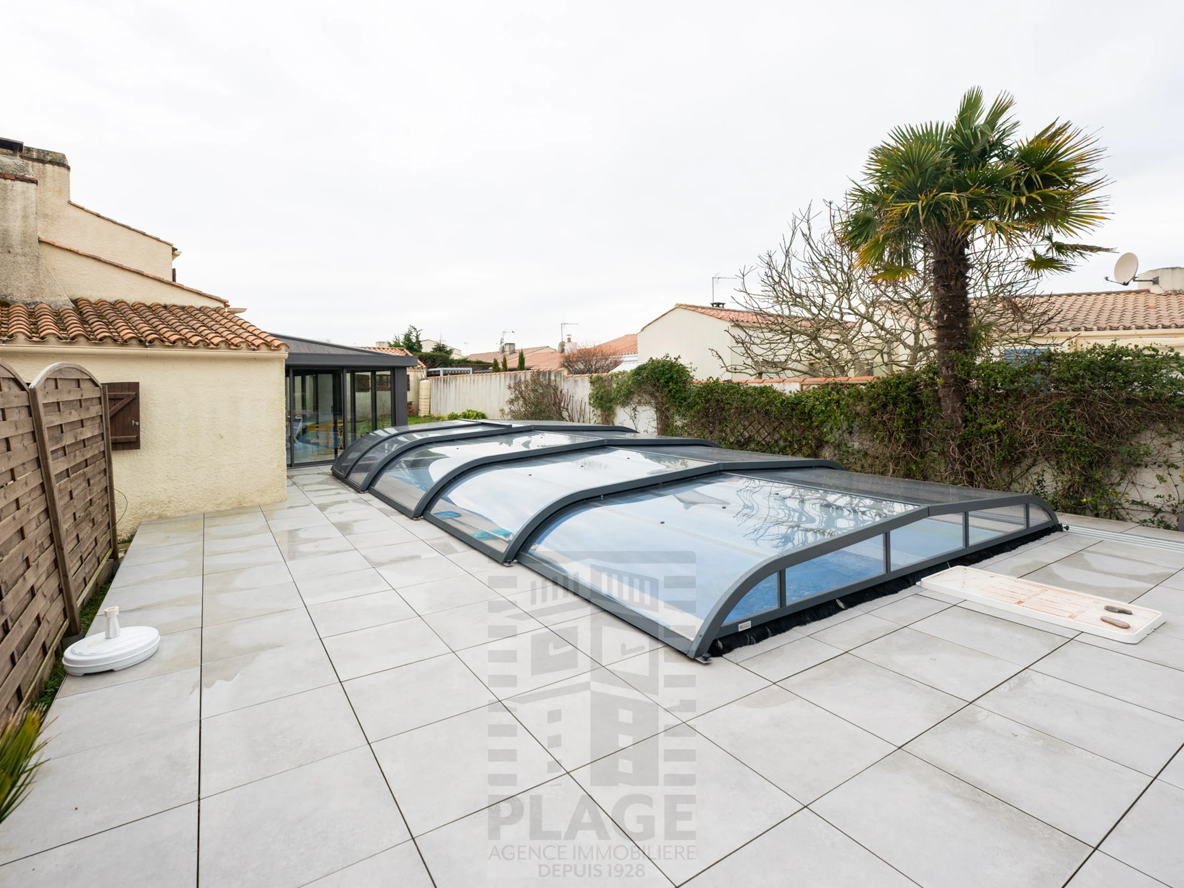 Casa con aparcamiento privado y jardín trasero cerrado con piscina cubierta con tratamiento de sal.