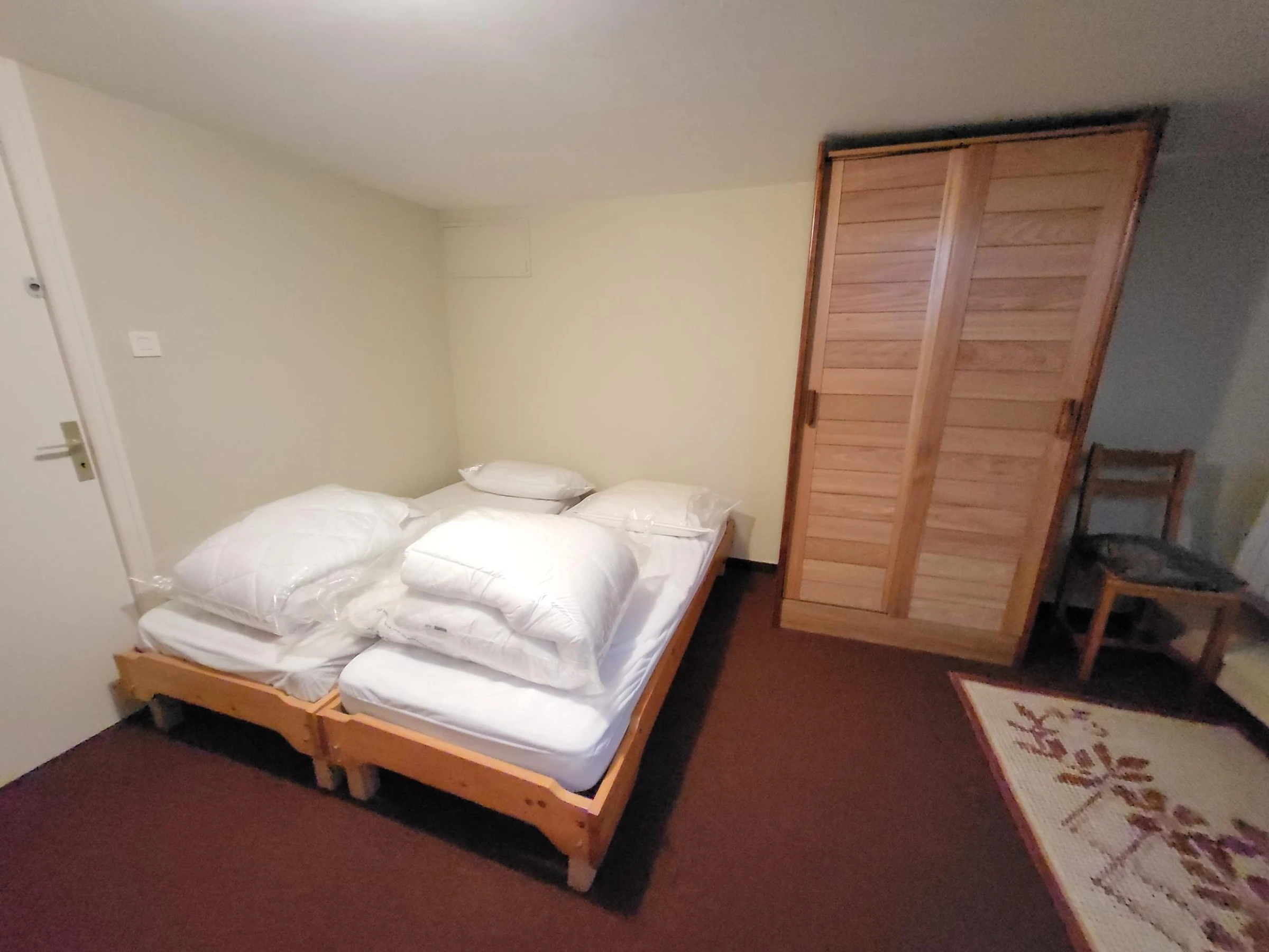 El alojamiento tiene capacidad para 4 personas: un dormitorio con cama de matrimonio (140 x 190 cm, aproximadamente 11 m²) y un dormitorio en el sótano con dos camas individuales (80 x 190 cm). Se proporciona ropa de cama (edredones y almohadas). Para su comodidad, el alojamiento se encuentra en buen estado y está equipado con detector de humo, aspiradora y tendedero.