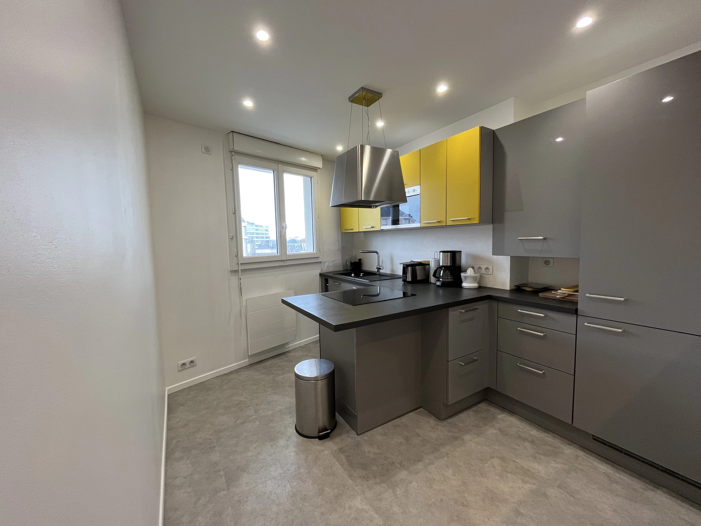 Este precioso apartamento amueblado de 3 estrellas, renovado en 2023, cuenta con recibidor, cocina americana totalmente equipada con placa de inducción, campana extractora, horno, microondas, nevera con congelador, cafetera, tostadora y lavavajillas.