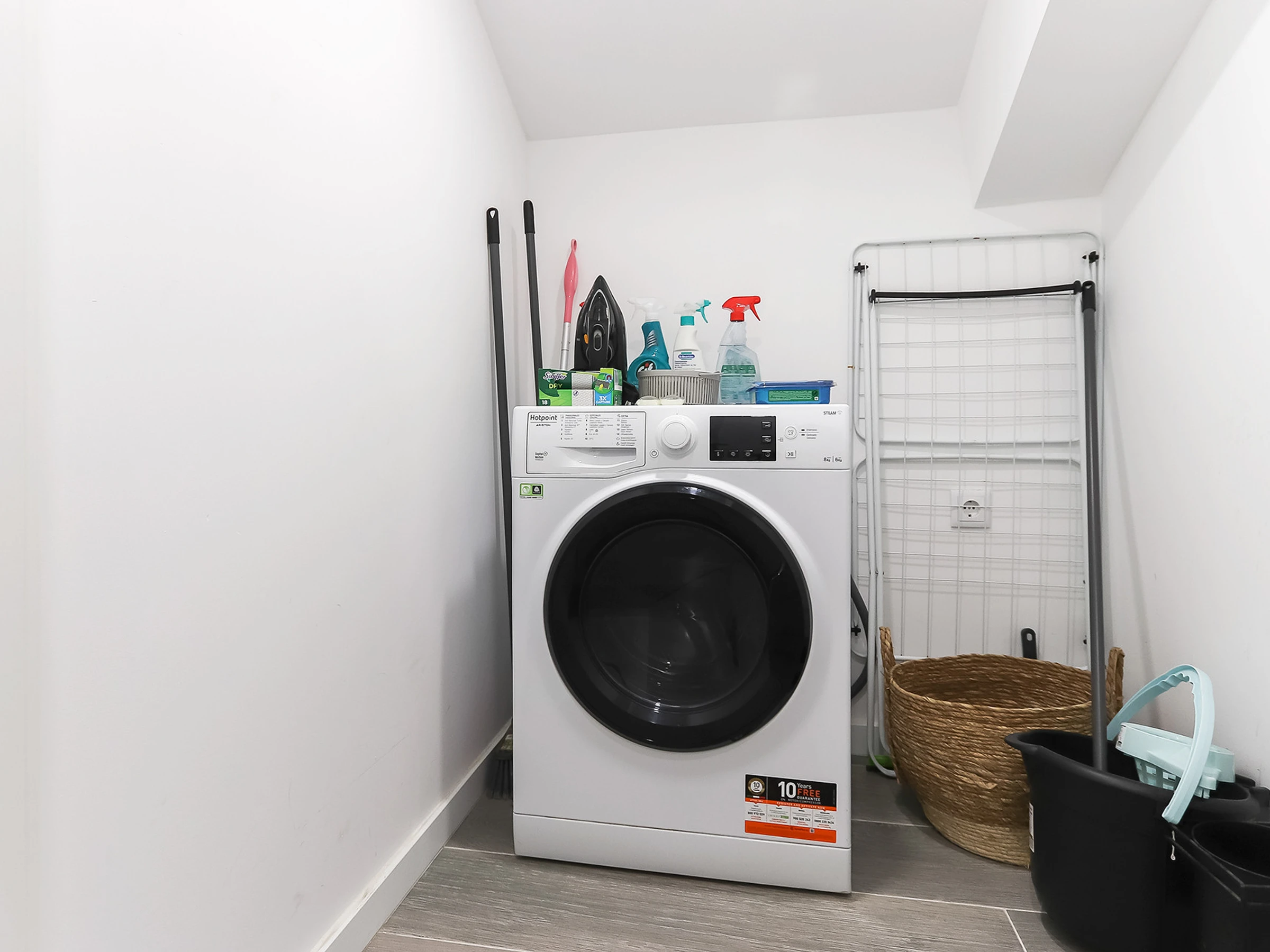 La cocina americana, totalmente equipada con electrodomésticos de última generación, como nevera, congelador, lavadora, cafetera, horno, microondas, lavavajillas y utensilios de cocina, te permitirá preparar deliciosas comidas en familia. Disfruta de tus comidas en el acogedor comedor o en el balcón, disfrutando de las vistas de la ciudad.